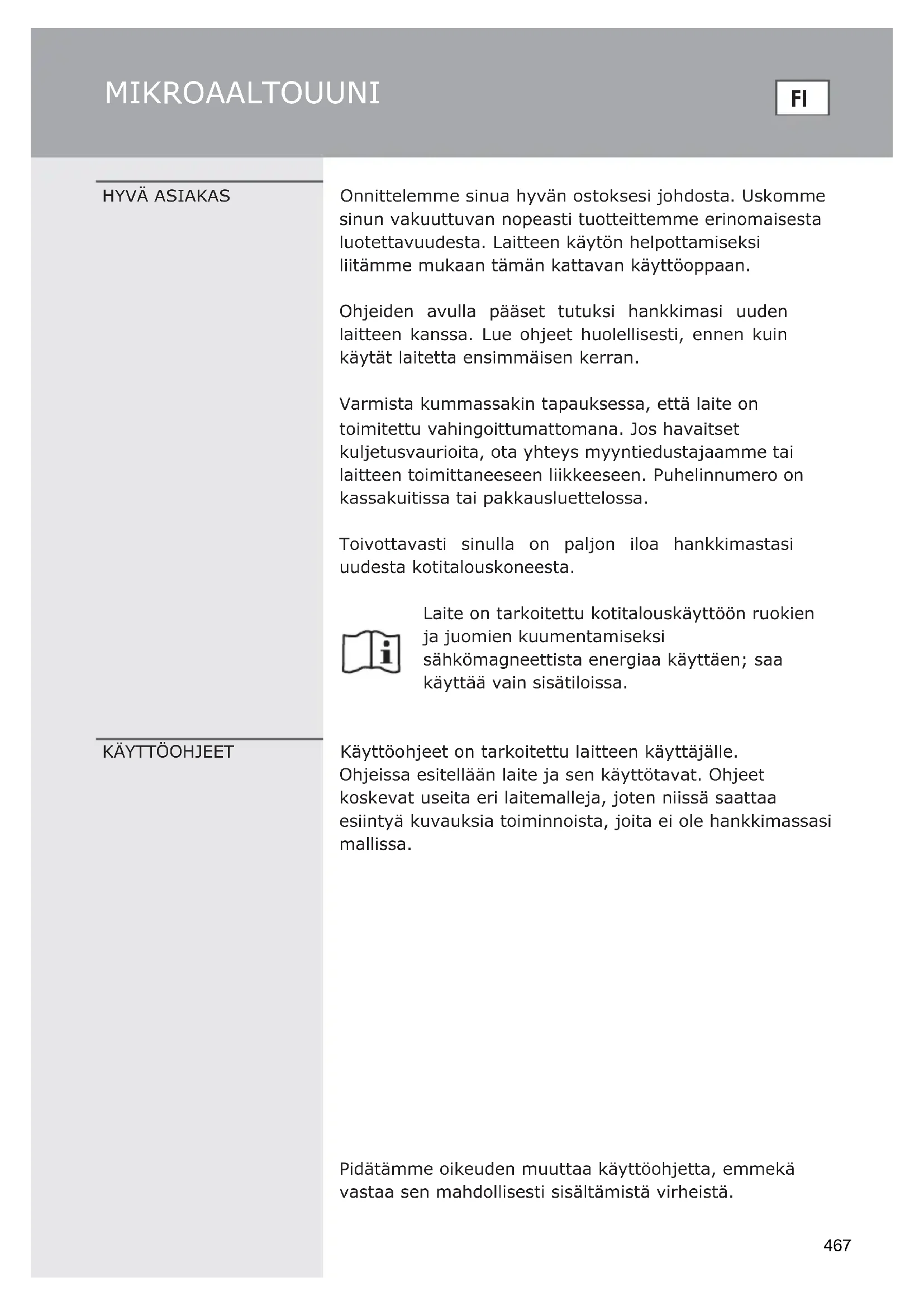 Tarkista, että luukku on kiinni kunnolla, niin että turvalukko kytkeytyy pois. Muutoin mikroaaltoenergia ei virtaa uuniin. Jollei mikään edellä oleva korjaa tilannetta, ota yhteyttä lähimpään valtuutettuun huoltoon. Laite on tarkoitettu kotitalouskäyttöön ruokien ja juomien kuumentamiseksi sähkömagneettista energiaa käyttäen. Vain sisätiloissa käytettäväksi.
