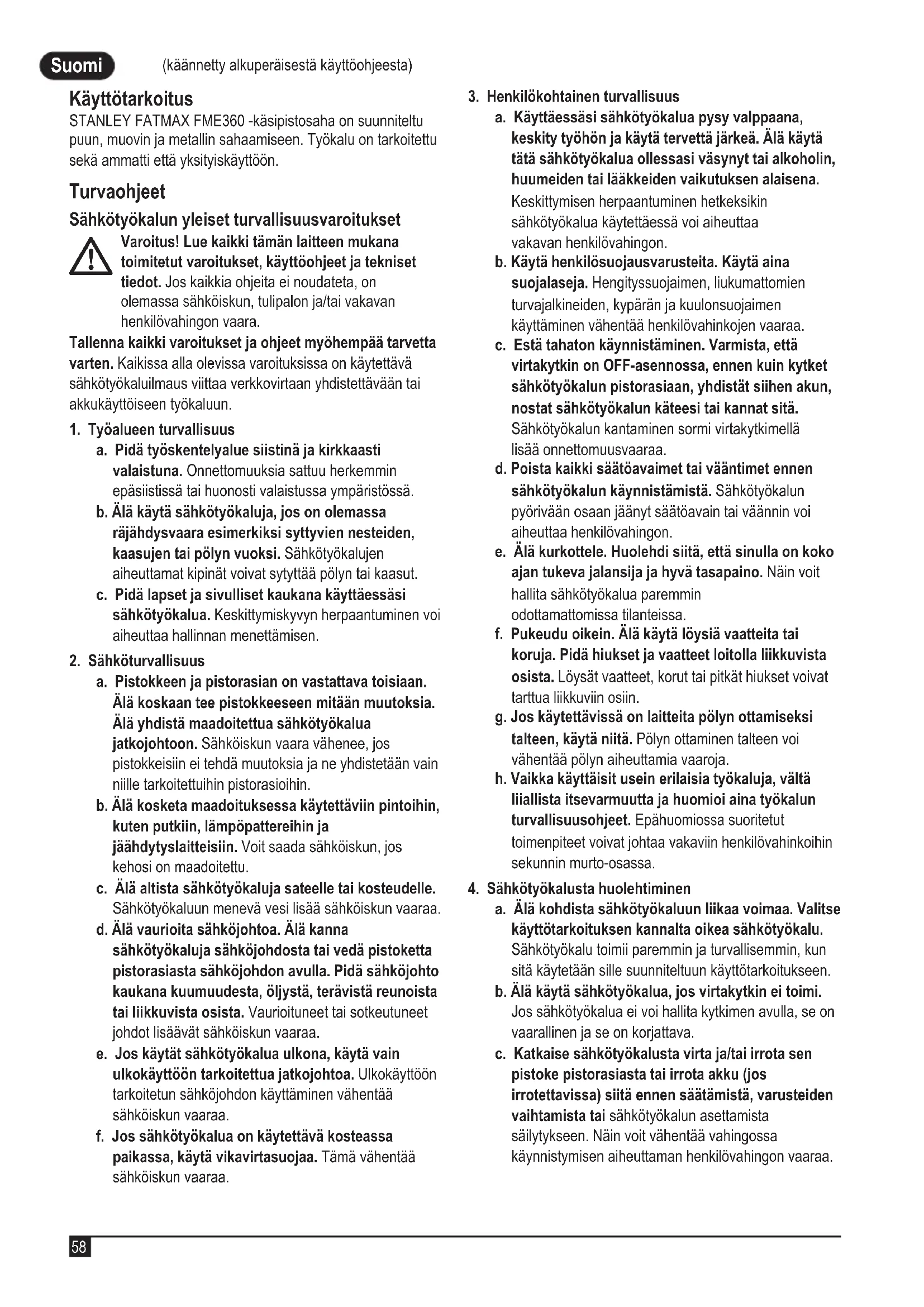 (käännetty alkuperäisestä käyttöohjeesta) Suomi (käännetty alkuperäisestä käyttöohjeesta) Käyttötarkoitus STANLEY FATMAX FME360 -käsipistosaha on suunniteltu puun, muovin ja metallin sahaamiseen. Työkalu on tarkoitettu sekä ammatti että yksityiskäyttöön. Turvaohjeet Sähkötyökalun yleiset turvallisuusvaroitukset