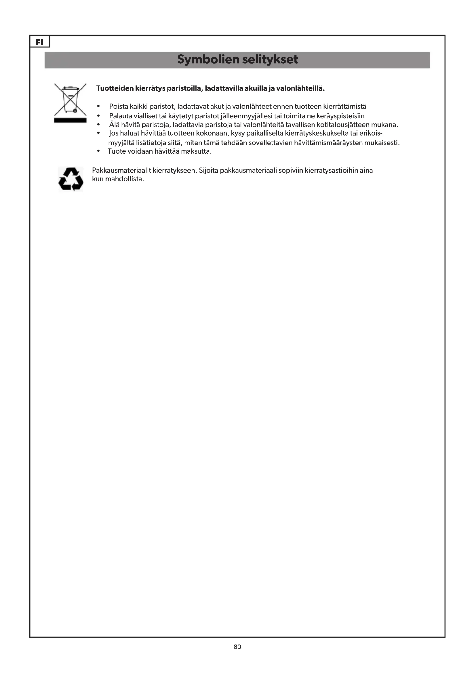 - Älä hävitä paristoja, ladattavia paristoja tai valonlähteitä tavallisen kotitalousjätteen mukana.