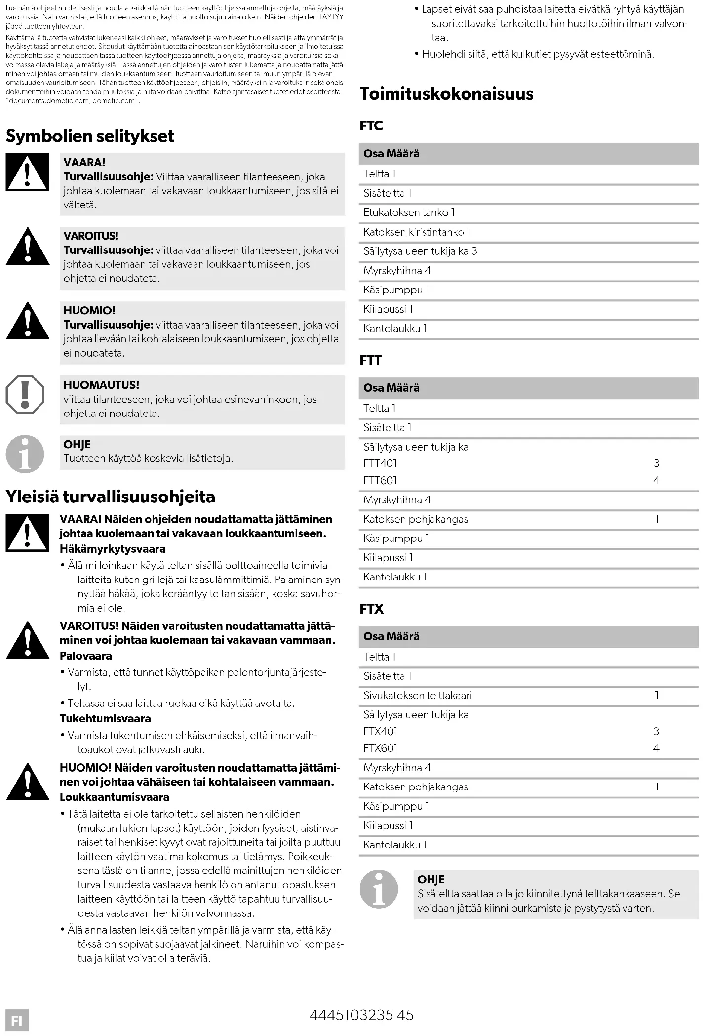 VAARA! Turvallisuusohje: Viittaa vaaralliseen tilanteeseen, joka johtaa kuolemaan tai vakavaan loukkaantumiseen, jos sitä ei vältetä. VAROITUS! Turvallisuusohje: viittaa vaaralliseen tilanteeseen, joka voi johtaa kuolemaan tai vakavaan loukkaantumiseen, jos ohjetta ei noudateta. HUOMIO! Turvallisuusohje: viittaa vaaralliseen tilanteeseen, joka voi johtaa lievään tai kohtalaiseen loukkaantumiseen, jos ohjetta ei noudateta. HUOMAUTUS! viittaa tilanteeseen, joka voi johtaa esinevahinkoon, jos ohjetta ei noudateta. OHJE Tuotteen käyttöä koskevia lisätietoja. Osa Määrä Teltta 1 Sisäteltta 1 Etukatoksen tanko 1 Katoksen kiristintanko 1 Säilytysalueen tukijalka 3 Myrskyhihna 4 Käsipumppu 1 Kiilapussi 1 Kantolaukku 1 Osa Määrä Teltta 1 Sisäteltta 1 Säilytysalueen tukijalka FTT401 FTT601