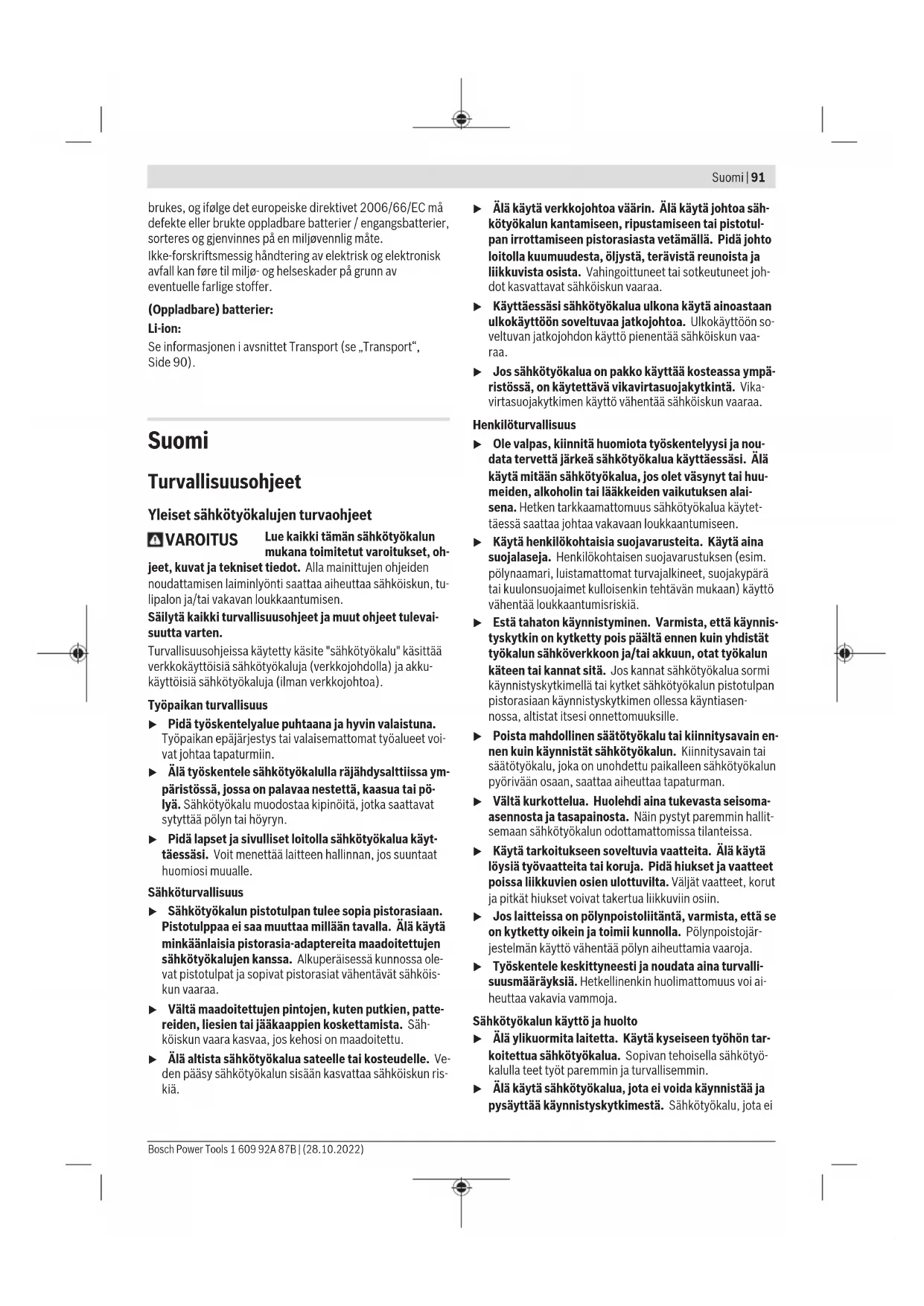 1,5 1,5 Näissä käyttöohjeissa ilmoitetut tärinä- ja melupäästötiedot on mitattu standardissa määritetyn mittausmenetelmän mu- kaan ja niitä voi käyttää sähkötyökalujen keskinäiseen vertai- luun. Ne soveltuvat myös tärinä- ja melupäästöjen alustavaan arviointiin. Ilmoitetut tärinä- ja melupäästöt vastaavat sähkötyökalun pääasiallisia käyttötapoja. Tärinä- ja melupäästöt saattavat kuitenkin poiketa ilmoitetuista arvoista, jos sähkötyökalua käytetään toisiin töihin, muilla käyttötarvikkeilla tai riittämät- tömästi huollettuna. Tämä saattaa suurentaa koko työsken- telyajan tärinä- ja melupäästöjä huomattavasti. Tärinä- ja melupäästöjen tarkaksi arvioimiseksi on huomioi- tava myös ne ajat, jolloin laite on sammutettuna tai tyhjä- käynnillä. Tämä voi vähentää huomattavasti koko työskente- lyajan tärinä- ja melupäästöjä. Määrittele tarvittavat lisävarotoimenpiteet käyttäjän suojele- miseksi tärinän aiheuttamilta haitoilta (esimerkiksi sähkötyö- kalujen ja käyttötarvikkeiden huolto, käsien pitäminen lämpi- minä ja työprosessien organisointi). Akku Bosch myy akkukäyttöisiä sähkötyökaluja myös ilman akkua. Pakkauksesta näet, sisältyykö akku sähkötyökalusi toimituk- seen. Akun lataminen u Käytä vain teknisissä tiedoissa ilmoitettuja latauslait- teita. Vain nämä latauslaitteet soveltuvat sähkötyökalus- sasi käytettävälle litiumioniakulle. Huomautus: kansainvälisten kuljetusmääräysten mukaisesti Li-ion-akut toimitetaan osittain ladattuina. Akun täyden suo- rituskyvyn varmistamiseksi akku tulee ladata täyteen ennen ensikäyttöä. Akun asentaminen Työnnä ladattu akku akun kiinnityskohtaan niin, että se lukit- tuu paikalleen. 1 609 92A 87B | (28.10.2022) Bosch Power ToolsSuomi | 95 Akun irrottaminen Kun haluat ottaa akun pois, paina akun vapautuspainiketta ja vedä akku irti. Älä irrota akkua väkisin. Akussaon 2 lukitusvaihetta, millä estetään akun irtoaminen, jos painat tahattomasti akunvapautuspainiketta. Sähkötyö- kalussa oleva akku pysyy paikallaan jousen avulla. Akun lataustilan näyttö Akun lataustilan näytön vihreät LED-valot ilmoittavat akun la- taustilan. Turvallisuussyistä lataustilan tarkistaminen on mahdollista vain sähkötyökalun ollessa pysähdyksissä. Kun haluat nähdä lataustilan, paina lataustilan näytön paini- ketta tai . Tämä on mahdollista myös akun ollessa irro- tettuna. Jos lataustilan näytön painikkeen painaminen ei sytytä yh- tään LED-valoa, akku on viallinen ja täytyy vaihtaa. Akkutyyppi GBA 18V... LED-valo Kapasiteetti 3vihreää LED-valoa palaa jatkuvasti 60–100% 2vihreää LED-valoa palaa jatkuvasti 30–60% 1vihreä LED-valo palaa jatkuvasti 5–30% 1vihreä LED-valo vilkkuu 0–5% Akkutyyppi ProCORE18V... LED-valo Kapasiteetti 5vihreää LED-valoa palaa jatkuvasti 80–100% 4vihreää LED-valoa palaa jatkuvasti 60–80% 3vihreää LED-valoa palaa jatkuvasti 40–60% 2vihreää LED-valoa palaa jatkuvasti 20–40% 1vihreä LED-valo palaa jatkuvasti 5–20% 1vihreä LED-valo vilkkuu 0–5% Ohjeita akun optimaaliseen käsittelyyn Suojaa akku kosteudelta ja vedeltä. Säilytä akkua vain –20...50°C lämpötilassa. Älä jätä akkua esimerkiksi kuumana kesäpäivänä pitkäksi ajaksi autoon. Puhdista akun tuuletusaukot säännöllisin väliajoin peh- meällä, puhtaalla ja kuivalla siveltimellä. Huomattavasti lyhentynyt käyntiaika latauksen jälkeen osoit- taa, että akku on elinikänsä lopussa ja täytyy vaihtaa uuteen. Huomioi hävitysohjeet. Asennus u Irrota akku, ennen kuin alat tehdä sähkötyökaluun liit- tyviä töitä (esim. huolto, käyttötarvikkeen vaihto, jne.). Irrota akku myös sähkötyökalun kuljetuksen ja säilytyksen ajaksi. Käynnistyskytkimen tahaton painal- lus aiheuttaa loukkaantumisvaaran. Sahanterän asennus/vaihto u Käytä työkäsineitä, kun asennat tai vaihdat sahante- rän. Käyttötarvikkeet ovat teräviä ja ne voivat kuumentua pitkäaikaisessa käytössä. Sahanterän valinta Tämän käyttöoppaan lopussa on suositeltavien sahanterien yleiskatsaus. Käytä vain T-kiinnityksellä varustettuja sahan- teriä. Sahanterä ei saa olla liian pitkä. Terän pituuden tulee sopia kyseiseen sahaustyöhön. Käytä jyrkkien kaarien sahaukseen kapeaa sahanterää. Sahanterän asennus (katsokuvaA) u Puhdista sahanterän varsi ennen sahanterän asenta- mista. Likaista vartta ei voi kiinnittää kunnolla. Paina SDS-vipua(3) eteenpäin vasteeseen saakka ja pidä painettuna. Työnnä sahanterä(17) (teräpuoli sahaussuun- taan) sahanterän kiinnittimen (2) pohjaan asti. Varmista, että asennettavan sahanterän selkä menee kun- nolla paikalleen ohjainrullan (16) uraan. u Tarkista, että sahanterä on tukevasti paikallaan. Löysä sahanterä voi irrota ja johtaa tapaturmaan. Sahanterän irrotus (katsokuvaB) Paina SDS-vipua(3) eteenpäin vasteeseen saakka ja irrota sahanterä(17). Liukutalla (katsokuvaC) Kun sahaat herkkien pintojen päällä, saat estettyä niiden naarmuuntumisen, kun asennat liukutallan (13) jalkalevyn (12) suojaksi. Kun haluat asentaa liukutallan (13), kiinnitä se edestä jalka- levyyn (12) ja paina sen takaosa ylös niin, että se lukkiutuu paikalleen. Repimissuoja (katsokuvaD) Repimissuojan (19) (lisätarvike) avulla voit estää sahattavan puulevyn pinnan repeytymisen. Repimissuojaa voi käyttää vain tiettyjen sahanterätyyppien kanssa ja vain 0° sahauskul- malla. Kun käytät sahauksessa repimissuojaa, jalkalevyä (12) ei saa siirtää taakse reunan lähellä sahauksen asen- toon. Työnnä repimissuoja(19) etukautta jalkalevyyn(12). Liukutallaa (13) käytettäessä repimissuojaa (19) ei asen- neta jalkalevyyn (12), vaan liukutallaan. Pölyn-/purunpoisto Työstettävistä materiaaleista syntyvä pöly (esimerkiksi lyijy- pitoinen pinnoite, tietyt puulaadut, kivi ja metalli) voi olla ter- veydelle vaarallista. Pölyn koskettaminen tai hengittäminen saattaa aiheut