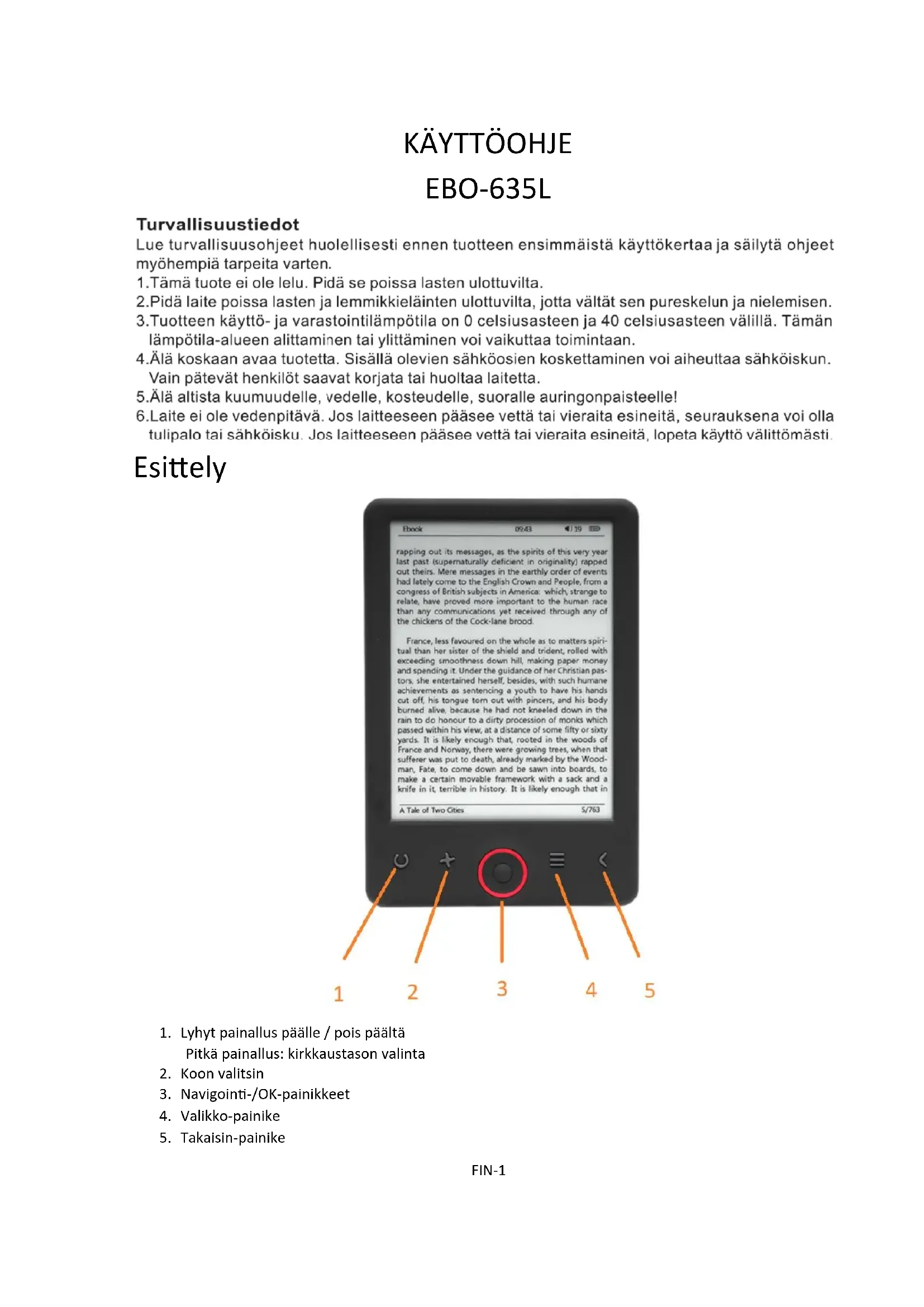 FIN-2Aloitusnäyttö: Äskettäinen luettujen osio esittelee 3 viimeksi avattua e-kirjaa. Juuri lisättyjen osio esittelee 4 viimeksi lisättyä e-kirjaa. Kirjasto Siirry Kirjasto-osioon, joka näyttää kaikki e-kirjat lukijassa (sekä sisäisessä muistissa että microSD:llä, jos sellainen on kytketty). Nimen oikealla puolella näytetään tiedostomuoto. Kirjasto-alivalikossa käyttäjä voi esittää luettelon e-kirjasuosikeista, hakea kirjoja, lajitella nimen/tekijän/äskettäin luetun/juuri lisätyn perusteella ja valita, miten tiedostot esitetään (luettelo tai pikkukuvakkeet – kansi). 1.Alivalikko lukemisen aikana Valintojen alivalikko voidaan avata e-kirjan lukemisen aikana. Paina Valikko-painiketta, kun e-kirja on avattuna, näyttämään mahdolliset valinnat. Huomaa, että lukemisen valikkovaihtoehdot ovat erilaisia, kun e- kirjoja luetaan eri muodoissa, sillä jokainen vaihtoehto ei ole käytettävissä jokaisesta tiedostomuotoa varten. 1.1. Lisää kirjanmerkki – lisää kirjanmerkki kirjaan, jota luet. 1.2. Kirjanmerkit – näytä tallennetut kirjanmerkit 1.3. Sisällysluettelo – näyttää sisällysluettelon, jos sellainen on saatavana (ei saatavana .txt-tiedostomuodon kanssa). 1.4. Lisää suosikkeihin – lisää luettavana oleva kirja suosikkien luetteloon. 1.5. Siirry sivulle – valitse sivu, jolle hypätään. 1.6. Haku – hae tiettyjä sanoja luettavana olevasta kirjasta. 1.7. Suurennuskoko – suurenna/pienennä tiedostossa (saatavana vain .pdf-tiedostomuodon kanssa). 1.8. Fonttikoko – suurenna/pienennä luettavana olevan tekstin fonttikokoa (ei saatavana .pdf- tiedostomuodon kanssa). 1.9. Fonttityyppi – muuta tekstin fonttityyppiä (saatavana vain .txt/.html/.fb2/.rtf/.mobi-tiedostomuotojen kanssa). 1.10. Rivivälit – muuta rivivälitystä (saatavana vain .txt/.html/.fb2/. rtf/.mobi-tiedostomuotojen kanssa). 1.11. Marginaali – muuta kirjan marginaaleja. 1.12. Pelkkä teksti – käyttäjä voi vaihtaa tiedoston esittämisestä .pdf-muodossa alkuperäisessä muodossaan tai pelkkänä tekstinä (saatavana vain .pdf-muodon kanssa). 1.13. Kierrä näyttöä – kiertää näyttöä 90º myötä- tai vastapäivään. 1.14. Käänteiset värit – esitä näytön värit käänteisinä (oletuksena tausta on valkoinen ja kirjaimet mustia. Käänteisessä muodossa tausta on musta ja kirjaimet valkoisia) (ei saatavana .pdf-tiedostomuodon kanssa). 1.15. Automaattinen sivun kääntäminen – ota käyttöön automaattinen sivun kääntäminen: 10 sekuntia/20 sekuntia/30 sekuntia/1 minuutti/2 minuuttia. 1.16. Päivitystila – valitse näytön päivitystaajuuden asetukset: jokaisen sivun jälkeen/3 sivun välein/5 sivun välein. 1.17. Tietoja kirjasta – näyttää tietoja avattuna olevasta e-kirjasta: nimi, tekijä, julkaisija ja muoto (jos saatavana). 1.18. Poistu – poistu alivalikosta (käyttäjä voi poistua myös painamalla Edellinen-painiketta). 1.19. Aseta linkki päälle – näyttää viiteluettelon (jos saatavana) (valinta saatavana vain PDF-, ePUB- ja mobi- tiedostomuotoja varten). e-kirjan sisältämien viitteiden näyttäminen: