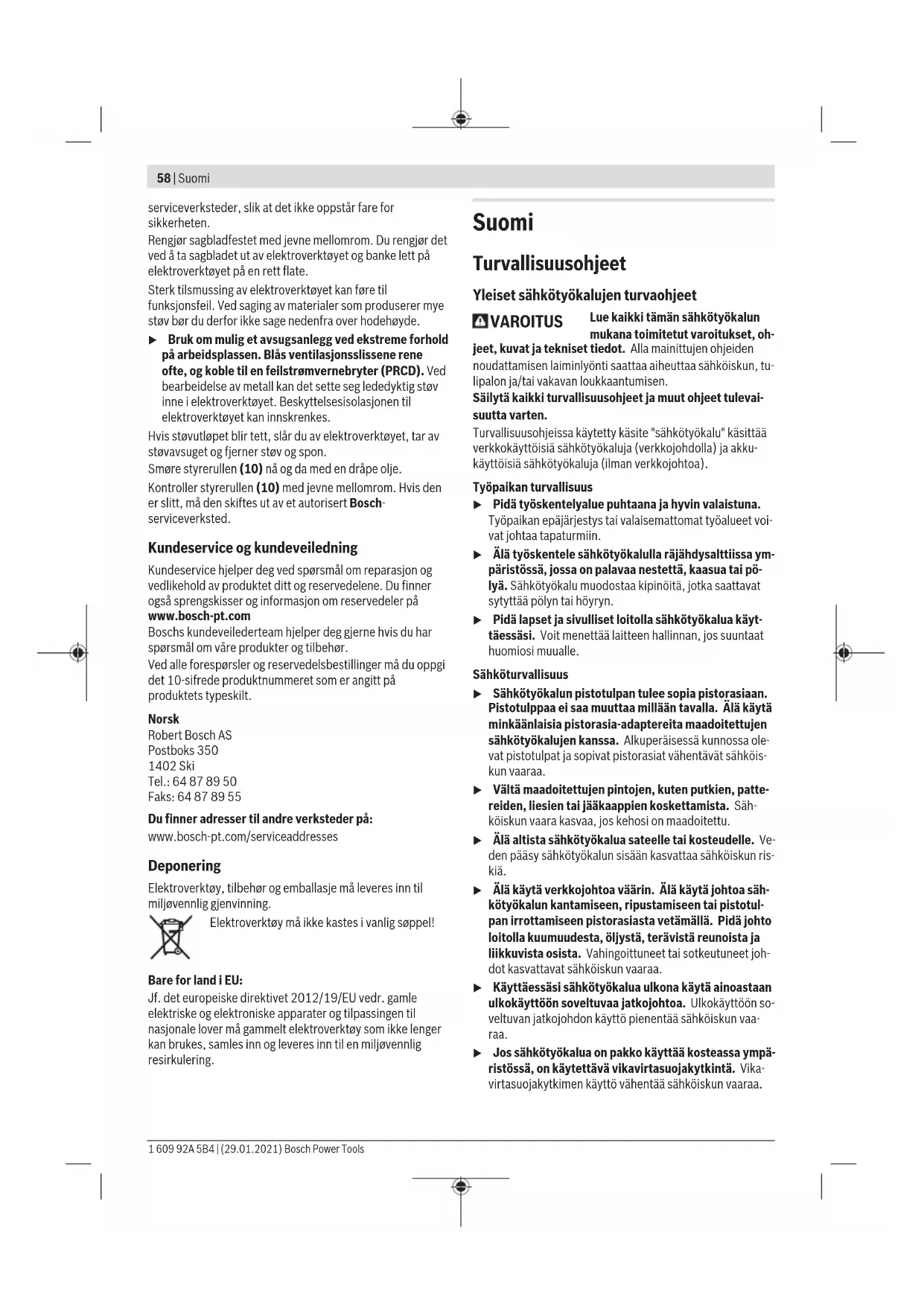 Näissä käyttöohjeissa ilmoitetut tärinä- ja melupäästötiedot on mitattu standardissa määritetyn mittausmenetelmän mu- kaan ja niitä voi käyttää sähkötyökalujen keskinäiseen vertai- luun. Ne soveltuvat myös tärinä- ja melupäästöjen alustavaan arviointiin. Ilmoitetut tärinä- ja melupäästöt vastaavat sähkötyökalun pääasiallisia käyttötapoja. Tärinä- ja melupäästöt saattavat kuitenkin poiketa ilmoitetuista arvoista, jos sähkötyökalua käytetään toisiin töihin, muilla käyttötarvikkeilla tai riittämät- tömästi huollettuna. Tämä saattaa suurentaa koko työsken- telyajan tärinä- ja melupäästöjä huomattavasti. Tärinä- ja melupäästöjen tarkaksi arvioimiseksi on huomioi- tava myös ne ajat, jolloin laite on sammutettuna tai tyhjä- käynnillä. Tämä voi vähentää huomattavasti koko työskente- lyajan tärinä- ja melupäästöjä. 1 609 92A 5B4 | (29.01.2021) Bosch Power ToolsSuomi | 61 Määrittele tarvittavat lisävarotoimenpiteet käyttäjän suojele- miseksi tärinän aiheuttamilta haitoilta (esimerkiksi sähkötyö- kalujen ja käyttötarvikkeiden huolto, käsien pitäminen lämpi- minä ja työprosessien organisointi). Asennus u Irrota pistotulppa pistorasiasta ennen kaikkia sähkö- työkaluun kohdistuvia töitä. Sahanterän asennus/vaihto u Käytä työkäsineitä, kun asennat tai vaihdat sahante- rän. Käyttötarvikkeet ovat teräviä ja ne voivat kuumentua pitkäaikaisessa käytössä. Sahanterän valinta Tämän käyttöoppaan lopussa on suositeltavien sahanterien yleiskatsaus. Käytä vain T-kiinnityksellä varustettuja sahan- teriä. Sahanterä ei saa olla liian pitkä. Terän pituuden tulee sopia kyseiseen sahaustyöhön. Käytä jyrkkien kaarien sahaukseen kapeaa sahanterää. Sahanterän asennus (katsokuvaA) u Puhdista sahanterän varsi ennen sahanterän asenta- mista. Likaista vartta ei voi kiinnittää kunnolla. Työnnä sahanterä (11) (teräpuoli sahaussuuntaan) sahante- rän kiinnittimen (9) pohjaan asti. Varmista, että asennettavan sahanterän selkä menee kun- nolla paikalleen ohjainrullan (10) uraan. u Tarkista, että sahanterä on tukevasti paikallaan. Löysä sahanterä voi irrota ja johtaa tapaturmaan. Sahanterän irrotus (katso kuva B) Siirrä sahanterän kiinnitintä (9) ylöspäin nuolen suuntaan ja irrota sahanterä (11). Repimissuoja (katsokuvaC) Repimissuojan (15) (lisätarvike) avulla voit estää sahattavan puulevyn pinnan repeytymisen. Repimissuojaa voi käyttää vain tiettyjen sahanterätyyppien kanssa ja vain 0° sahauskul- malla. Paina repimissuoja (15) alakautta kiinni jalkalevyyn (7). Pölyn-/purunpoisto Työstettävistä materiaaleista syntyvä pöly (esimerkiksi lyijy- pitoinen pinnoite, tietyt puulaadut, kivi ja metalli) voi olla ter- veydelle vaarallista. Pölyn koskettaminen tai hengittäminen saattaa aiheuttaa käyttäjälle tai lähellä oleville henkilöille al- lergisia reaktioita ja/tai hengitystiesairauksia. Tiettyjen pölylaatujen (esimerkiksi tammi- tai pyökkipöly) katsotaan aiheuttavan syöpää, varsikin puunsuojaukseen käytettävien lisäaineiden yhteydessä (kromaatti, puunsuoja- aine). Asbestipitoisia materiaaleja saavat käsitellä vain asiantuntevat ammattilaiset. – Käytä mahdollisuuksien mukaan materiaalille soveltuvaa pölynpoistoa. – Huolehdi työkohteen hyvästä tuuletuksesta. – Suosittelemme käyttämään suodatusluokan P2 hengitys- suojanaamaria. Noudata käsiteltäviä materiaaleja koskevia maakohtaisia määräyksiä. u Estä pölyn kertyminen työpisteeseen. Pöly saattaa olla herkästi syttyvää. Suojus Asenna suojus (13), ennen kuin kytket sähkötyökalun pölyn- poistoon. Asenna suojus (13) sähkötyökaluun niin, että pitimet lukkiu- tuvat rungossa oleviin aukkoihin. Irrota suojus (13) jiirisahauksissa tai jos työskentelet ilman pölynpoistoa. Purista tätä varten suojusta kummankin ulko- pitimen korkeudelta kokoon ja vedä suojus etukautta pois. Pölynpoiston kytkeminen Kytke imuletku (5) (lisätarvike) purunpoistoputkeen (6). Kytke imuletku (5) pölynimuriin (lisätarvike). Tämän käyttöoppaan lopussa olevassa yleiskatsaus neuvoo, miten sahan voi kytkeä erilaisiin pölynimureihin. Mikäli mahdollista, asenna repimissuoja (15), jotta saat opti- moitua pölynpoiston. Pölynimurin tulee soveltua työstettävälle materiaalille. Käytä erikoisimuria, jos imuroit terveydelle erittäin vaaralli- sia, syöpää aiheuttavia tai kuivia pölylaatuja. Käyttö Käyttötavat u Irrota pistotulppa pistorasiasta ennen kaikkia sähkö- työkaluun kohdistuvia töitä. Heiluriliikkeen säätö Heiluriliikkeen neliportainen säätö mahdollistaa sahausno- peuden, -tehon ja -jäljen optimaalisen sovituksen sahattavan materiaalin mukaan. Säätövivun (8) avulla voit säätää heiluriliikettä myös käytön aikana. Porras0 ei heiluriliikettä PorrasI pieni heiluriliike PorrasII keskisuuri heiluriliike PorrasIII suuri heiluriliike Voit määrittää kyseiseen käyttökohteeseen optimaalisesti sopivan heiluriliikkeen asennon koesahauksilla. Huomioi täl- löin seuraavat suositukset: – Mitä pienemmäksi säädät heiluriliikkeen asennon tai kyt- ket heiluriliikkeen kokonaan pois, sitä hienompi ja siis- timpi sahausjälki. – Kytke heiluriliike pois päältä, kun sahaat ohuita levyjä (esim. peltilevyt). – Käytä pientä heiluriliikettä, kun sahaat kovia materiaaleja (esim. teräs). – Käytä suurinta heiluriliikettä, kun sahaat pehmeitä materi- aaleja ja puun syiden suuntaisesti. Bosch Power Tools 1 609 92A 5B4 | (29.01.2021)62 | Suomi Jiirikulman asetus (katsokuvaD) Jalkalevyä (7) voi kallistaa jiirisahauksia varten maks. 45° oi- kealle tai vasemmalle. Repimissuojaa (15) ei voi käyttää jiirisahauksissa. – Ota repimissuoja (15) pois. – Avaa ruuvi (16) ja työnnä jalkalevyä (7) hieman sahante- rän (11) suuntaan. – Jalkalevyn oikealla ja vasemmalla puolella on lukitukset kohdissa 0° ja 45° jiirikulman tarkkaan säätöö