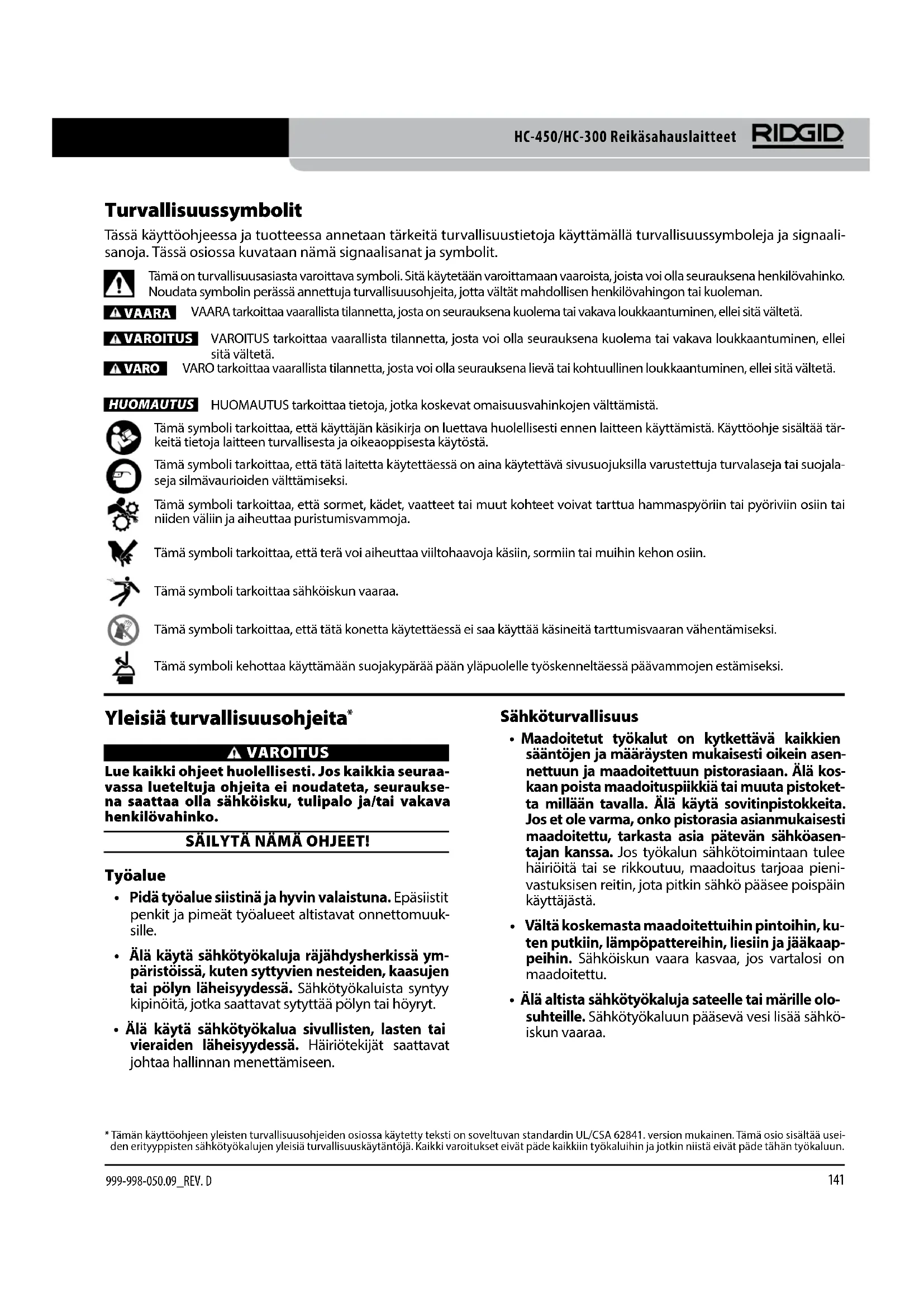 - Tämän käyttöohjeen yleisten turvallisuusohjeiden osiossa käytetty teksti on soveltuvan standardin UL/CSA 62841. version mukainen. Tämä osio sisältää usei- den erityyppisten sähkötyökalujen yleisiä turvallisuuskäytäntöjä. Kaikki varoitukset eivät päde kaikkiin työkaluihin ja jotkin niistä eivät päde tähän työkaluun.142 HC-450/HC-300 Reikäsahauslaitteet 999-998-050.09_REV. D • Älä vahingoita virtajohtoa. Älä koskaan käytä johtoa työkalun kantamiseen tai pistokkeen ir-rottamiseen pistorasiasta. Älä altista virtajohtoa kuumuudelle, öljylle, teräville reunoille tai liik-kuville osille. Vaihda vialliset johdot heti. Vialliset johdot lisäävät sähköiskun vaaraa.
