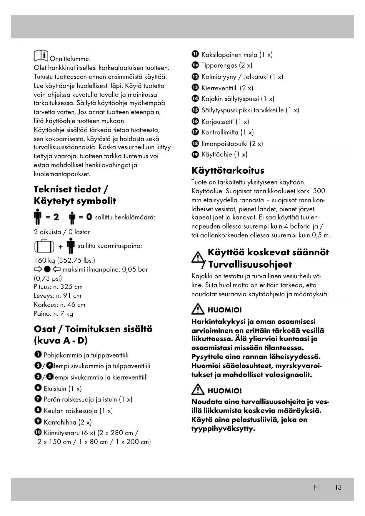 - 3 vuoden takuu Täyttää ISO 6185-1 –standardin asettamat vaatimukset, luokka III, tyyppi B FI13 Onnittelumme! Olet hankkinut itsellesi korkealaatuisen tuotteen. Tutustu tuotteeseen ennen ensimmäistä käyttöä. Lue käyttöohje huolellisesti läpi. Käytä tuotetta vain ohjeissa kuvatulla tavalla ja mainitussa tarkoituksessa. Säilytä käyttöohje myöhempää tarvetta varten. Jos annat tuotteen eteenpäin, liitä käyttöohje tuotteen mukaan. Käyttöohje sisältää tärkeää tietoa tuotteesta, sen kokoamisesta, käytöstä ja hoidosta sekä turvallisuussäännöistä. Koska vesiurheiluun liittyy tiettyjä vaaroja, tuotteen tarkka tuntemus voi estää mahdolliset henkilövahingot ja kuolemantapaukset. Tekniset tiedot / Käytetyt symbolit sallittu henkilömäärä: 2 aikuista / 0 lastar sallittu kuormituspaino: 160 kg (352,75 lbs.) maksimi ilmanpaine: 0,05 bar (0,73 psi) Pituus: n. 325 cm Leveys: n. 91 cm Korkeus: n. 46 cm Paino: n. 7 kg Osat / Toimituksen sisältö (kuva A - D) Pohjakammio ja tulppaventtiili / Alempi sivukammio ja tulppaventtiili / Ylempi sivukammio ja kierreventtiili Etuistuin (1 x) Perän roiskesuoja ja istuin (1 x) Keulan roiskesuoja (1 x) Kantohihna (2 x) Kiinnitysnaru (6 x) (2 x 280 cm / 2 x 150 cm / 1 x 80 cm / 1 x 200 cm) Kaksilapainen mela (1 x) Tipparengas (2 x) Kolmiotyyny / Jalkatuki (1 x) Kierreventtiili (2 x) Kajakin säilytyspussi (1 x) Säilytyspussi pikkutarvikkeille (1 x) Korjaussetti (1 x) Kontrollimitta (1 x) Ilmanpoistoputki (2 x) Käyttöohje (1 x) Käyttötarkoitus Tuote on tarkoitettu yksityiseen käyttöön. Käyttöalue: Suojaisat rannikkoalueet kork. 300 m:n etäisyydellä rannasta – suojaisat rannikon- läheiset vesistöt, pienet lahdet, pienet järvet, kapeat joet ja kanavat. Ei saa käyttää tuulen- nopeuden ollessa suurempi kuin 4 boforia ja / tai aallonkorkeuden ollessa suurempi kuin 0,5 m. Käyttöä koskevat säännöt / Turvallisuusohjeet Kajakki on testattu ja turvallinen vesiurheiluvä- line. Siitä huolimatta on erittäin tärkeää, että noudatat seuraavia käyttöohjeita ja määräyksiä: HUOMIO! Harkintakykysi ja oman osaamisesi arvioiminen on erittäin tärkeää vesillä liikuttaessa. Älä yliarvioi kuntoasi ja osaamistasi missään tilanteessa. Pysyttele aina rannan läheisyydessä. Huomioi sääolosuhteet, myrskyvaroi- tukset ja mahdolliset valosignaalit. HUOMIO! Noudata aina turvallisuusohjeita ja ves- illä liikkumista koskevia määräyksiä. Käytä aina pelastusliiviä, joka on tyyppihyväksytty. FI14 VAROITUS! Lasten tukehtumisvaara! Älä anna lasten leikkiä pakkausmateriaalilla tai tuotteella. VAROITUS! Jos kajakista on poistuttu, tulee siihen nousta takaisin keulasta tai perästä, sillä sivuilta nouseminen saattaa aiheuttaa kajakin kaatumisen. Loukkaantumisvaara! Varo maalta päin puhaltavaa tuulta! Varo maalta päin tulevaa virtausta! p. 18