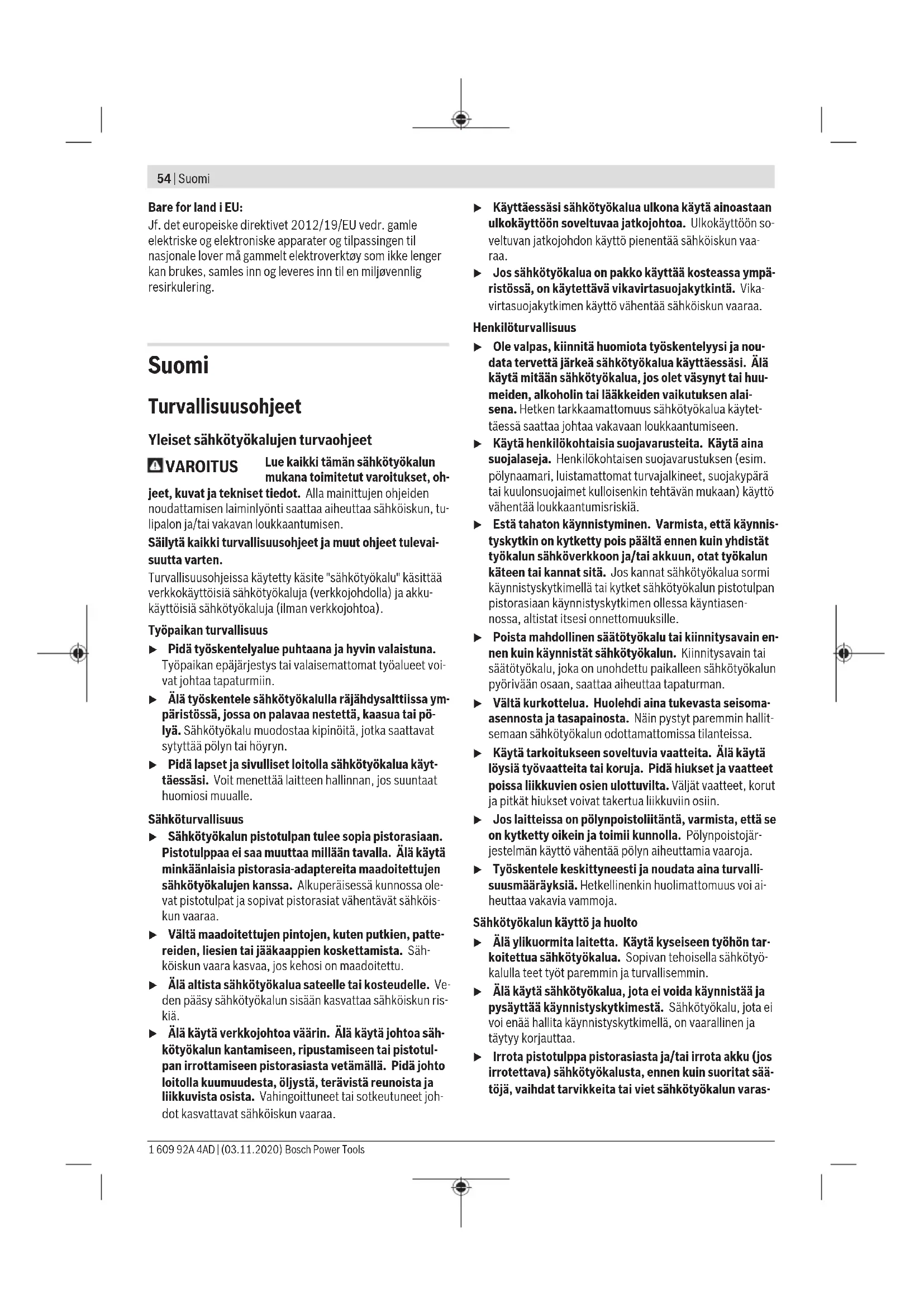 Legg slipebladet stramt rundt slipeplaten (6). Klem fast den fremre delen av slipebladet under den fremre klemlisten (12). Pass på at slipebladet (9) ikke er for kort og at det festes riktig. Sving klembøylen (11) tilbake til utgangsposisjonen, og lås den der. Slipeblad uten hull, f.eks. på rull eller metervare, kan perforeres til støvavsuget med hullverktøyet (13). Dette gjøres ved at elektroverktøyet med montert slipeblad trykkes mot hullverktøyet (se bilde F). For å ta av slipebladet (9) løsner du begge klembøylene (11) og trekker slipebladet ut av holderen. Valg av slipeblad Det finnes forskjellige slipeblad, som velges i samsvar med materialet som skal bearbeides og den ønskede materialfjerningen på overflaten: Grovhet Bearbeiding av alle trematerialer 40 – 240 Forsliping, for eksempel av grove, uhøvlede bjelker og bord grov 40, 60 Plansliping og glatting av små ujevnheter middels 80, 120 Ferdig- og finsliping av hardt tre fin 180, 240 Bearbeiding av malings-/lakksjikt hhv. grunnbing som fyller og sparkel 40 – 240 Avsliping av maling grov 40, 60 Sliping av mellomstrøksmaling middels 80, 120 Siste sliping av grunning før lakkering fin 180, 240 Støv-/sponavsuging Støv fra materialer som blyholdig maling, noen tresorter, mineraler og metall kan være helsefarlige. Berøring eller innånding av støv kan utløse allergiske reaksjoner og/eller åndedrettssykdommer hos brukeren eller personer som befinner seg i nærheten. Visse typer støv som eike- eller bøkestøv gjelder som kreftfremkallende, spesielt i kombinasjon med 1 609 92A 4AD | (03.11.2020) Bosch Power ToolsNorsk | 53 tilsetningsstoffer til trebearbeidelse (kromat, trebeskyttelsesmidler). Asbestholdig materiale må kun bearbeides av fagfolk. – Bruk helst et støvavsug som er egnet for dette materialet. – Sørg for god ventilasjon av arbeidsplassen. – Det anbefales å bruke en støvmaske med filterklasse P2. Følg ditt lands gyldige forskrifter for de materialene som skal bearbeides. u Unngå støv på arbeidsplassen. Støv kan lett antennes. Eget avsug med støvboks (se bilde G–J) Skyv støvboksen (2) på utblåsingsstussen (14). Nivået i støvboksen (2)er lett å kontrollere via den gjennomsiktige beholderen. For å tømme støvboksen (2) dreier du lett på den mens du trekker den bakover. Skru filterelementet (15) fra støvboksen (2). Tøm støvboksen. Bank lett på filteret (15) mot et fast underlag for å løsne støvet. Rengjør lamellene til filterelementet (15) med en myk børste. Merknad: For å sikre optimalt støvavsug må du tømme støvbeholderen (2) i tide og rengjøre filterelementet (15) regelmessig. Under arbeid på vertikale flater må du holde elektroverktøyet slik at støvboksen (2) vender ned. Eksternt avsug (se bilde K) Koble sugeslangen (16)(tilbehør) på utblåsingsstussen (14). Koble sugeslangen (16) til en støvsuger (tilbehør). Støvsugeren må være egnet til materialet som skal bearbeides. Ved oppsuging av spesielt helsefarlig, kreftfremkallende eller tørt støv må du bruke en spesialstøvsuger. Ved arbeid på loddrette flater må du alltid holde elektroverktøyet slik at sugeslangen vender ned. Bruk Igangsetting u Ta hensyn til strømspenningen! Spenningen til strømkilden må stemme overens med angivelsene på elektroverktøyets typeskilt. Elektroverktøy som er merket med 230V kan også brukes med 220V. Inn-/utkobling u Kontroller at du kan trykke på av/på-bryteren uten å slippe håndtaket. For å slå på elektroverktøyet vipper du av/på-bryteren (1) mot høyre til stillingen "I". For å slå av elektroverktøyet vipper du av/på-bryteren (1) mot høyre til stillingen "O". Arbeidshenvisninger u Før alle arbeider på elektroverktøyet utføres må støpselet trekkes ut av stikkontakten. u Vent til elektroverktøyet er stanset helt før du legger det fra deg. Materialfjerningskapasiteten ved sliping avhenger i stor grad av hvilket slipeblad som brukes. Bare feilfrie slipeblad gir gode sliperesultater og skåner elektroverktøyet. Slipebladene varer lenger hvis du passer på at presstrykket er jevnt. Hvis det brukes svært høyt presstrykk, fører det til større slitasje på elektroverktøyet og slipebladet, og ikke til at slipekapasiteten blir større. Bruk ikke et slipeblad som har blitt brukt til bearbeiding av metall, på andre materialer. Bruk bare originalt Bosch-slipetilbehør. Service og vedlikehold Vedlikehold og rengjøring u Før alle arbeider på elektroverktøyet utføres må støpselet trekkes ut av stikkontakten. u Hold selve elektroverktøyet og ventilasjonsslissene alltid rene, for å kunne arbeide bra og sikkert. Hvis det er nødvendig å skifte ut tilkoblingsledningen, må dette gjøres av Bosch eller godkjente Bosch- serviceverksteder, slik at det ikke oppstår fare for sikkerheten. Kundeservice og kundeveiledning Kundeservice hjelper deg ved spørsmål om reparasjon og vedlikehold av produktet ditt og reservedelene. Du finner også sprengskisser og informasjon om reservedeler på www.bosch-pt.com Boschs kundeveilederteam hjelper deg gjerne hvis du har spørsmål om våre produkter og tilbehør. Ved alle forespørsler og reservedelsbestillinger må du oppgi det 10‑sifrede produktnummeret som er angitt på produktets typeskilt. Norsk Robert Bosch AS Postboks 350 1402 Ski Tel.: 64 87 89 50 Faks: 64 87 89 55 Du finner adresser til andre verksteder på: www.bosch-pt.com/serviceaddresses Deponering Elektroverktøy, tilbehør og emballasje må leveres inn til miljøvennlig gjenvinning. Elektroverktøy må ikke kastes i vanlig søppel! Bosch Power Tools 1 609 92A 4AD | (03.11.2020)54 | Suomi Bare for land i EU: Jf. det europeiske direktivet 2012/19/EU vedr. gamle elektriske og elektroniske apparater og tilpassingen til nasjonale lover må gammelt elektroverktøy som ikke lenger kan brukes, samles inn og leveres inn til en miljøvennlig resirkulering. Suomi Turvallisuusohjeet Yleiset sähkötyökalujen turvaohjeet VAROITUS Lue kaikki tämän