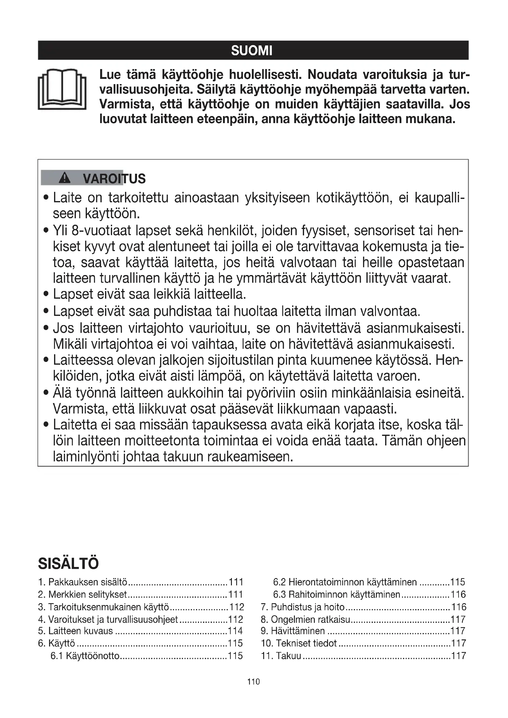 löin laitteen moitteetonta toimintaa ei voida enää taata. Tämän ohjeen laiminlyönti johtaa takuun raukeamiseen. SISÄLTÖ111