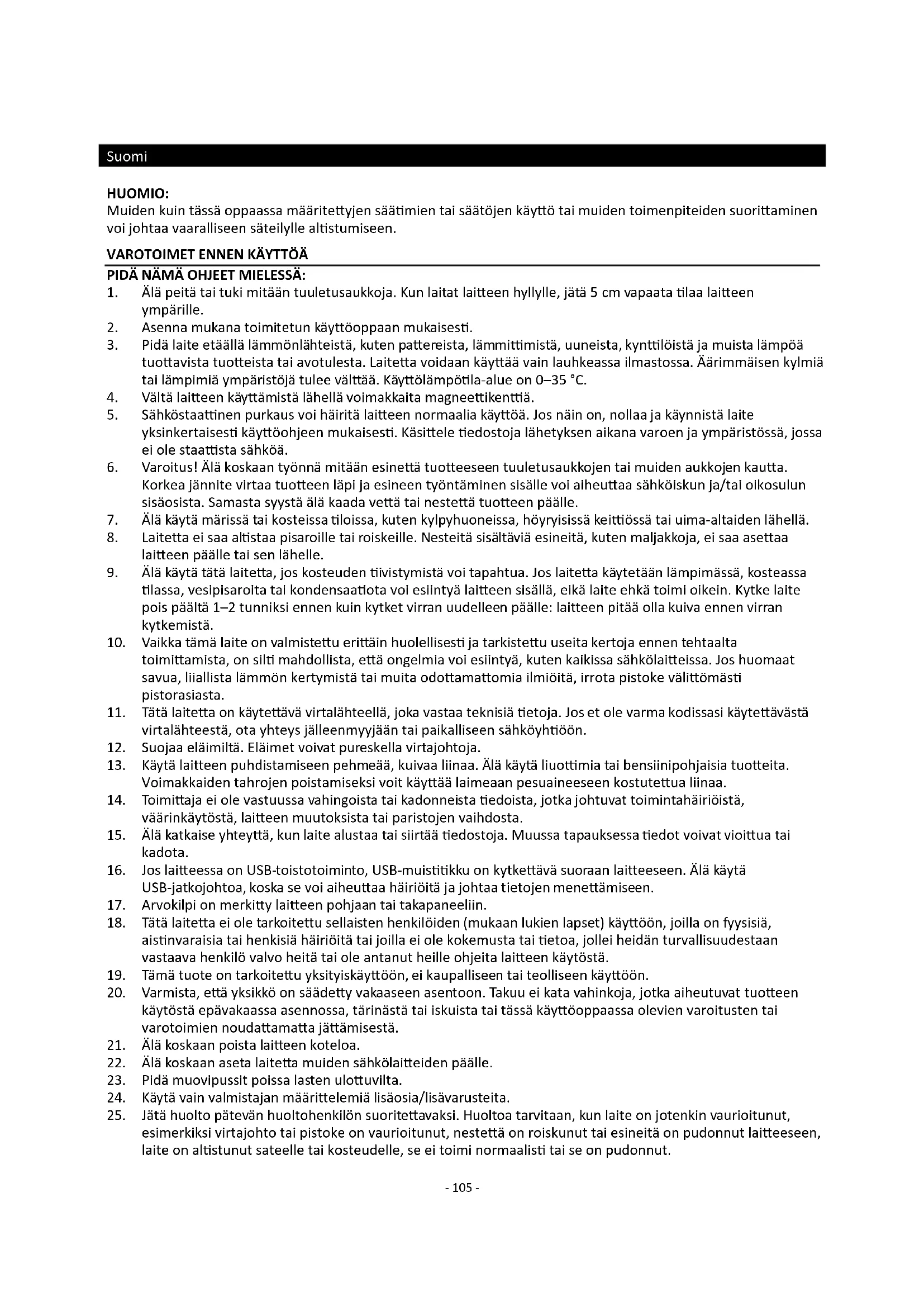 25. Jätä huolto pätevän huoltohenkilön suoritettavaksi. Huoltoa tarvitaan, kun laite on jotenkin vaurioitunut,