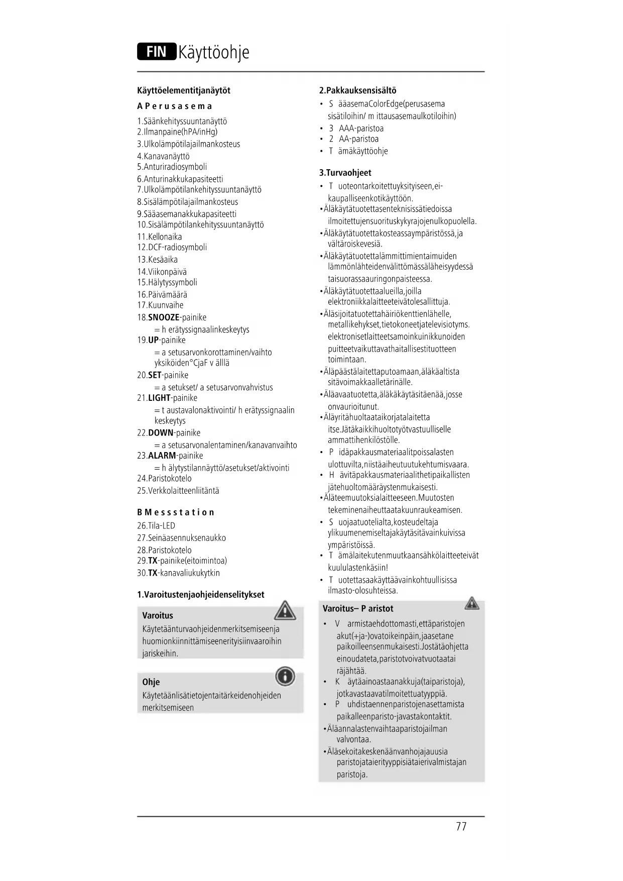 - Tuotetta saa käyttää vain kohtuullisissa ilmasto-olosuhteissa. Varoitus –Paristot