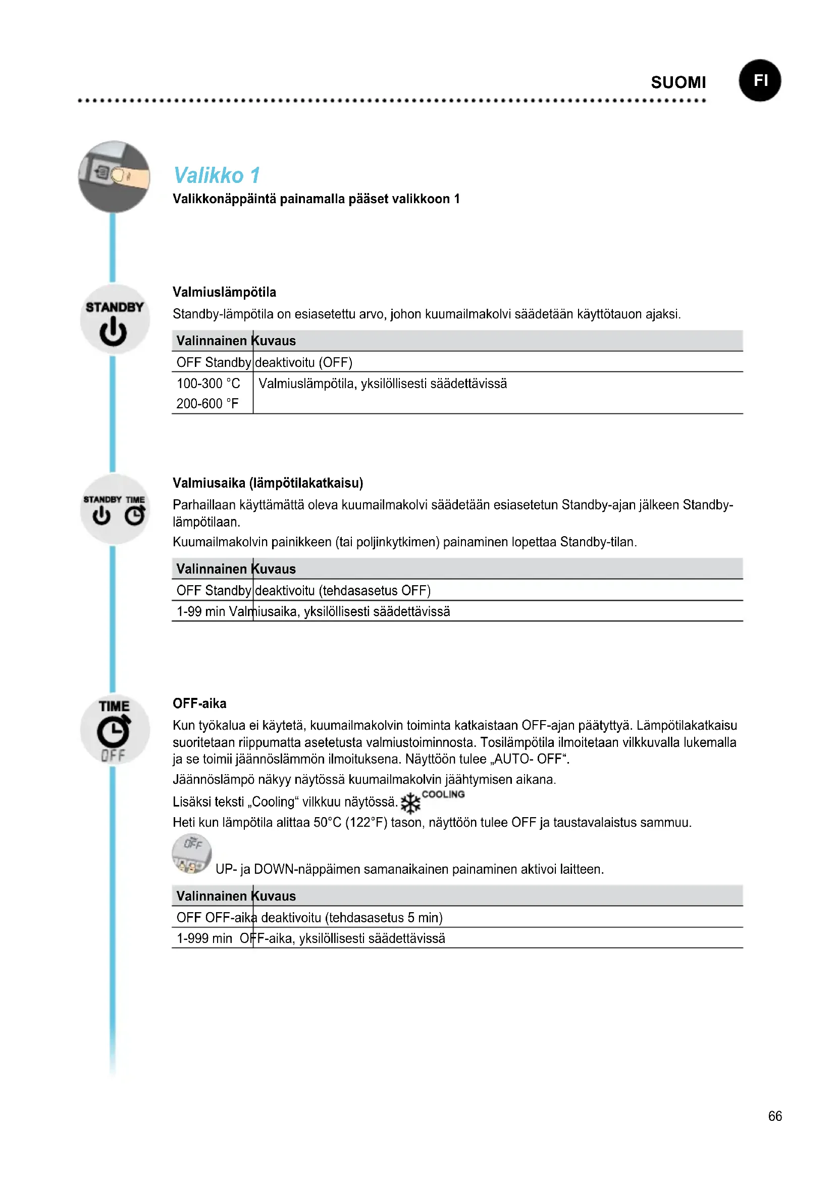 DANSK66 Valikko 1 Valikkonäppäintä painamalla pääset valikkoon 1 Valmiuslämpötila Standby-lämpötila on esiasetettu arvo, johon kuumailmakolvi säädetään käyttötauon ajaksi. Valinnainen Kuvaus OFF Standby deaktivoitu (OFF) 100-300 °C 200-600 °F Valmiuslämpötila, yksilöllisesti säädettävissä Valmiusaika (lämpötilakatkaisu) Parhaillaan käyttämättä oleva kuumailmakolvi säädetään esiasetetun Standby-ajan jälkeen Standby- lämpötilaan. Kuumailmakolvin painikkeen (tai poljinkytkimen) painaminen lopettaa Standby-tilan. Valinnainen Kuvaus OFF Standby deaktivoitu (tehdasasetus OFF) 1-99 min Valmiusaika, yksilöllisesti säädettävissä OFF-aika Kun työkalua ei käytetä, kuumailmakolvin toiminta katkaistaan OFF-ajan päätyttyä. Lämpötilakatkaisu suoritetaan riippumatta asetetusta valmiustoiminnosta. Tosilämpötila ilmoitetaan vilkkuvalla lukemalla ja se toimii jäännöslämmön ilmoituksena. Näyttöön tulee „AUTO- OFF“. Jäännöslämpö näkyy näytössä kuumailmakolvin jäähtymisen aikana. Lisäksi teksti „Cooling“ vilkkuu näytössä. Heti kun lämpötila alittaa 50°C (122°F) tason, näyttöön tulee OFF ja taustavalaistus sammuu. UP- ja DOWN-näppäimen samanaikainen painaminen aktivoi laitteen. Valinnainen Kuvaus OFF OFF-aika deaktivoitu (tehdasasetus 5 min) 1-999 min OFF-aika, yksilöllisesti säädettävissä