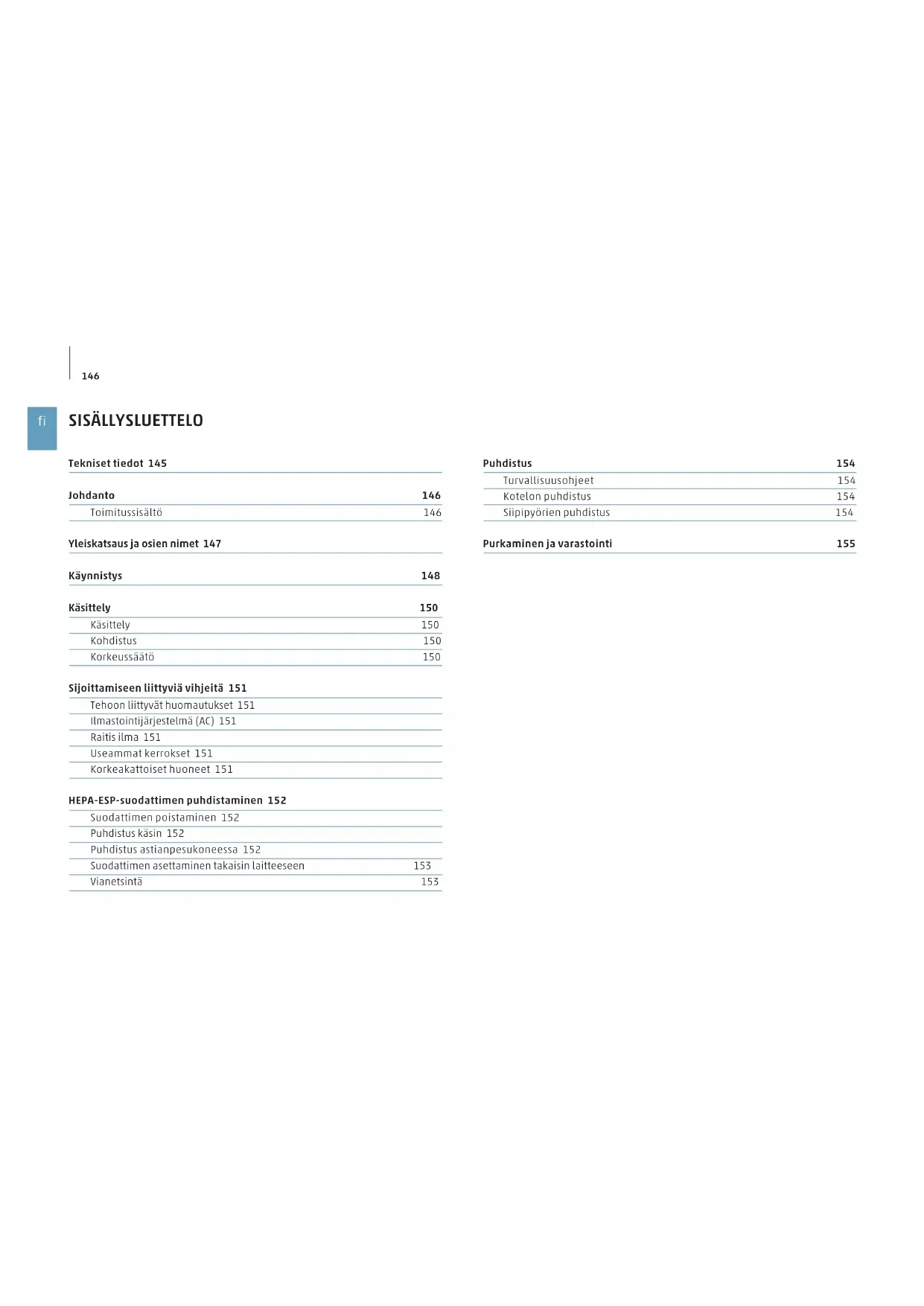 SISÄLLYSLUETTELO Tekniset tiedot 145 Johdanto 146 Toimitussisältö 146 Yleiskatsaus ja osien nimet 147 Käynnistys 148 Käsittely 150 Käsittely 150 Kohdistus 150 Korkeussäätö 150 Sijoittamiseen liittyviä vihjeitä 151 Tehoon liittyvät huomautukset 151 Ilmastointijärjestelmä (AC) 151 Raitis ilma 151 Useammat kerrokset 151 Korkeakattoiset huoneet 151 HEPA-ESP-suodattimen puhdistaminen 152 Suodattimen poistaminen 152 Puhdistus käsin 152 Puhdistus astianpesukoneessa 152 Suodattimen asettaminen takaisin laitteeseen 153 Vianetsintä 153 Puhdistus 154 Turvallisuusohjeet 154 Kotelon puhdistus 154 Siipipyörien puhdistus 154 Purkaminen ja varastointi 155147