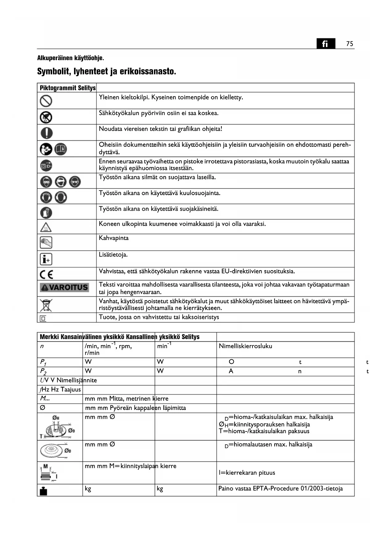 Alkuperäinen käyttöohje. Symbolit, lyhenteet ja erikoissanasto. Piktogrammit Selitys Yleinen kieltokilpi. Kyseinen toimenpide on kielletty. Sähkötyökalun pyöriviin osiin ei saa koskea. Noudata viereisen tekstin tai grafiikan ohjeita! Oheisiin dokumentteihin sekä käyttöohjeisiin ja yleisiin turvaohjeisiin on ehdottomasti pereh- dyttävä. Ennen seuraavaa työvaihetta on pistoke irrotettava pistorasiasta, koska muutoin työkalu saattaa käynnistyä epähuomiossa itsestään. Työstön aikana silmät on suojattava laseilla. Työstön aikana on käytettävä kuulosuojainta. Työstön aikana on käytettävä suojakäsineitä. Koneen ulkopinta kuumenee voimakkaasti ja voi olla vaaraksi. Kahvapinta Lisätietoja. Vahvistaa, että sähkötyökalun rakenne vastaa EU-direktiivien suosituksia. Teksti varoittaa mahdollisesta vaarallisesta tilanteesta, joka voi johtaa vakavaan työtapaturmaan tai jopa hengenvaaraan. Vanhat, käytöstä poistetut sähkötyökalut ja muut sähkökäyttöiset laitteet on hävitettävä ympä- ristöystävällisesti johtamalla ne kierrätykseen. Tuote, jossa on vahvistettu tai kaksoiseristys Merkki Kansainvälinen yksikkö Kansallinen yksikkö Selitys