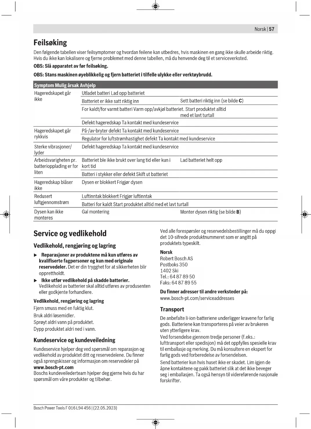 Symboler Nedenstående symboler er viktige for lesing og forståelse av driftsinstruksen. Legg merke til symbolene og deres betydning. En riktig tolkning av symbolene hjelper deg med å bruke produktet på en bedre og sikrere måte. Symbol Betydning Bevegelsesretning Innkobling Utkobling CLICK! Hørbar støy Tilbehør F 016 L94 456 | (22.05.2023) Bosch Power ToolsNorsk | 57 Feilsøking Den følgende tabellen viser feilsymptomer og hvordan feilene kan utbedres, hvis maskinen en gang ikke skulle arbeide riktig. Hvis du ikke kan lokalisere og fjerne problemet med denne tabellen, må du henvende deg til et serviceverksted. OBS: Slå apparatet av før feilsøking. OBS: Stans maskinen øyeblikkelig og fjern batteriet i tilfelle ulykke eller verktøybrudd. Symptom Mulig årsak Avhjelp Hageredskapet går ikke Utladet batteri Lad opp batteriet Batteriet er ikke satt riktig inn Sett batteri riktig inn (se bilde C) For kaldt/for varmt batteri Varm opp/avkjøl batteriet. Start produktet alltid med et lavt turtall Defekt hageredskap Ta kontakt med kundeservice Hageredskapet går rykkvis På-/av-bryter defekt Ta kontakt med kundeservice Regulator for luftstrømhastighet defekt Ta kontakt med kundeservice Sterke vibrasjoner/ lyder Defekt hageredskap Ta kontakt med kundeservice Arbeidsvarigheten pr. batteriopplading er for liten Batteriet ble ikke brukt over lang tid eller kun i kort tid Lad batteriet helt opp Batteri i stykker eller defekt Skift ut batteriet Hageredskap blåser ikke Dysen er blokkert Frigjør dysen Redusert luftgjennomstrøm Luftinntak blokkert Frigjør luftinntak Batteri for kaldt Start produktet alltid med et lavt turtall Dysen kan ikke monteres Gal montering Monter dysen riktig (se bilde B) Service og vedlikehold Vedlikehold, rengjøring og lagring u Reparasjoner av produktene må kun utføres av kvalifiserte fagpersoner og kun med originale reservedeler. Det er din trygghet for at sikkerheten blir opprettholdt. u Ikke utfør vedlikehold på skadde batterier. Vedlikehold av batterier skal alltid utføres av produsenten eller godkjente forhandlere. Vedlikehold, rengjøring og lagring Fjern smuss med en fuktig klut. Bruk aldri løsemidler. Sprøyt aldri vann på produktet. Dypp produktet aldri ned i vann. Kundeservice og kundeveiledning Kundeservice hjelper deg ved spørsmål om reparasjon og vedlikehold av produktet ditt og reservedelene. Du finner også sprengskisser og informasjon om reservedeler på www.bosch-pt.com Boschs kundeveilederteam hjelper deg gjerne hvis du har spørsmål om våre produkter og tilbehør. Ved alle forespørsler og reservedelsbestillinger må du oppgi det 10‑sifrede produktnummeret som er angitt på produktets typeskilt. Norsk Robert Bosch AS Postboks 350 1402 Ski Tel.: 64 87 89 50 Faks: 64 87 89 55 Du finner adresser til andre verksteder på: www.bosch-pt.com/serviceaddresses Transport De anbefalte li-ion-batteriene underligger kravene for farlig gods. Batteriene kan transporteres på veier av brukeren uten ytterligere krav. Ved forsendelse gjennom tredje personer (f.eks.: lufttransport eller spedisjon) må det oppfylles spesielle krav til emballasje og merking. Du må konsultere en ekspert for farlig gods ved forberedelse av forsendelsen. Send batterier kun hvis huset ikke er skadet. Lim igjen de åpne kontaktene og pakk batteriet slik at det ikke beveger seg i emballasjen. Ta også hensyn til videreførende nasjonale forskrifter. Bosch Power Tools F 016 L94 456 | (22.05.2023)58 | Suomi Deponering Produkter, batterier, tilbehør og emballasje må leveres inn til miljøvennlig gjenvinning. Produkter og batterier må ikke kastes som vanlig husholdningsavfall! Bare for land i EU: Iht. det europeiske direktivet 2012/19/EU om gamle redskap og iht. det europeiske direktivet 2006/66/EF må defekte eller oppbrukte batterier/oppladbare batterier samles inn adskilt og leveres inn til en miljøvennlig resirkulering. Ikke-forskriftsmessig håndtering av elektrisk og elektronisk avfall kan føre til miljø- og helseskader på grunn av eventuelle farlige stoffer. (Oppladbare) batterier: Li-ion: Se informasjonen i avsnittet Transport (se „Transport“, Side57). Suomi Turvallisuusohjeita Puutarhalaitteessa olevien tunnuskuvien selitykset Yleiset varoitusohjeet. Lue käyttöohje huolellisesti. Älä käytä sateella. VAROITUS: Varo pois sinkoutuvia osia. VAROITUS: Pidä ympäristössä olevia loitolla. Pidä kädet, jalat ja löysät vaatteet loitolla au- koista tuotteen käydessä. Pyörivä puhallin. Pidä kädet, jalat pitkät hiuk- set ja löysät vaatteet loitolla aukoista tuotteen käydessä. Käytä silmä- ja kuulonsuojaimia. VAROITUS: Irrota akku ennen huoltotöitä. Sähkötyökalujen yleiset turvallisuusohjeet VAROITUS Lue kaikki tämän sähkötyökalun mukana toimitetut varoitukset, oh- jeet, kuvat ja tekniset tiedot. Alla mainittujen ohjeiden noudattamisen laiminlyönti saattaa aiheuttaa sähköiskun, tu- lipalon ja/tai vakavan loukkaantumisen. Säilytä kaikki turvallisuusohjeet ja muut ohjeet tulevai- suutta varten. Turvallisuusohjeissa käytetty käsite "sähkötyökalu" käsittää verkkokäyttöisiä sähkötyökaluja (verkkojohdolla) ja akku- käyttöisiä sähkötyökaluja (ilman verkkojohtoa). Työpaikan turvallisuus u Pidä työskentelyalue puhtaana ja hyvin valaistuna. Työpaikan epäjärjestys tai valaisemattomat työalueet voi- vat johtaa tapaturmiin. u Pidä lapset ja sivulliset loitolla sähkötyökalua käyt- täessäsi. Voit menettää laitteen hallinnan, jos suuntaat huomiosi muualle. u Käytön aikana ei ympäristössä 3 m säteellä saa olla muita ihmisiä tai eläimiä. Likaa ei tulisi koskaan puhal- taa lähellä olevien henkilöiden suuntaan. u Varo tuotetta käytettäessä vaaroja, joita ei voi kuulla.u Varo, että et kompastu laitteeseen, jos olet jättänyt sen makaamaan maahan. u Käyttäjä on vastuussa onnettomuuksista ja toisille ih- misille tai heidän omaisuudelleen aiheuttamistaan vaurioista. Sähköturvallisuus u Vält