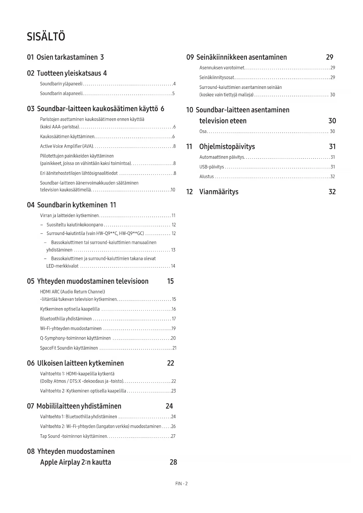 - Soundbar ühildub AirPlay2-ga, mis on installitud iOS 13.4 või uuemasse versiooni.FIN - 2 SISÄLTÖ 01 Osien tarkastaminen 3 02 Tuotteen yleiskatsaus 4 Soundbarin yläpaneeli . . . . . . . . . . . . . . . . . . . . . . . . . . . . . . . . . . . . . . . . . . . . . .4 Soundbarin alapaneeli. . . . . . . . . . . . . . . . . . . . . . . . . . . . . . . . . . . . . . . . . . . . . .5 03 Soundbar-laitteen kaukosäätimen käyttö 6 Paristojen asettaminen kaukosäätimeen ennen käyttöä (kaksi AAA-paristoa). . . . . . . . . . . . . . . . . . . . . . . . . . . . . . . . . . . . . . . . . . . . . . . .6 Kaukosäätimen käyttäminen. . . . . . . . . . . . . . . . . . . . . . . . . . . . . . . . . . . . . . . .6 Active Voice Amplier (AVA). . . . . . . . . . . . . . . . . . . . . . . . . . . . . . . . . . . . . . . . .8 Piilotettujen painikkeiden käyttäminen (painikkeet, joissa on vähintään kaksi toimintoa). . . . . . . . . . . . . . . . . . . . . .8 Eri äänitehostetilojen lähtösignaalitiedot . . . . . . . . . . . . . . . . . . . . . . . . . . . .8 Soundbar-laitteen äänenvoimakkuuden säätäminen television kaukosäätimellä. . . . . . . . . . . . . . . . . . . . . . . . . . . . . . . . . . . . . . . . .10 04 Soundbarin kytkeminen 11 Virran ja laitteiden kytkeminen. . . . . . . . . . . . . . . . . . . . . . . . . . . . . . . . . . . . . 11 ‒ Suositeltu kaiutinkokoonpano . . . . . . . . . . . . . . . . . . . . . . . . . . . . . . . . . . 12 ‒ Surround-kaiutintila (vain HW-Q9**C, HW-Q9**GC) . . . . . . . . . . . . . 12 ‒ Bassokaiuttimen tai surround-kaiuttimien manuaalinen yhdistäminen . . . . . . . . . . . . . . . . . . . . . . . . . . . . . . . . . . . . . . . . . . . . . . . . . 13 ‒ Bassokaiuttimen ja surround-kaiuttimien takana olevat LED-merkkivalot . . . . . . . . . . . . . . . . . . . . . . . . . . . . . . . . . . . . . . . . . . . . . . 14 05 Yhteyden muodostaminen televisioon 15 HDMI ARC (Audio Return Channel) -liitäntää tukevan television kytkeminen. . . . . . . . . . . . . . . . . . . . . . . . . . . . 15 Kytkeminen optisella kaapelilla . . . . . . . . . . . . . . . . . . . . . . . . . . . . . . . . . . . .16 Bluetoothilla yhdistäminen . . . . . . . . . . . . . . . . . . . . . . . . . . . . . . . . . . . . . . . . 17 Wi-Fi-yhteyden muodostaminen . . . . . . . . . . . . . . . . . . . . . . . . . . . . . . . . . . .19 Q-Symphony-toiminnon käyttäminen . . . . . . . . . . . . . . . . . . . . . . . . . . . . . .20 SpaceFit Soundin käyttäminen . . . . . . . . . . . . . . . . . . . . . . . . . . . . . . . . . . . . . 21 06 Ulkoisen laitteen kytkeminen 22 Vaihtoehto 1: HDMI-kaapelilla kytkentä (Dolby Atmos / DTS:X -dekoodaus ja -toisto). . . . . . . . . . . . . . . . . . . . . . . . .22 Vaihtoehto 2: Kytkeminen optisella kaapelilla . . . . . . . . . . . . . . . . . . . . . . .23 07 Mobiililaitteen yhdistäminen 24 Vaihtoehto 1: Bluetoothilla yhdistäminen . . . . . . . . . . . . . . . . . . . . . . . . . . .24 Vaihtoehto 2: Wi-Fi-yhteyden (langaton verkko) muodostaminen . . . . .26 Tap Sound -toiminnon käyttäminen. . . . . . . . . . . . . . . . . . . . . . . . . . . . . . . . .27 08 Yhteyden muodostaminen Apple Airplay 2:n kautta 28 09 Seinäkiinnikkeen asentaminen 29 Asennuksen varotoimet. . . . . . . . . . . . . . . . . . . . . . . . . . . . . . . . . . . . . . . . . . . .29 Seinäkiinnitysosat. . . . . . . . . . . . . . . . . . . . . . . . . . . . . . . . . . . . . . . . . . . . . . . . .29 Surround-kaiuttimien asentaminen seinään (koskee vain tiettyjä malleja) . . . . . . . . . . . . . . . . . . . . . . . . . . . . . . . . . . . . . . 30 10 Soundbar-laitteen asentaminen television eteen 30 Osa. . . . . . . . . . . . . . . . . . . . . . . . . . . . . . . . . . . . . . . . . . . . . . . . . . . . . . . . . . . . . . 30 11 Ohjelmistopäivitys 31 Automaattinen päivitys. . . . . . . . . . . . . . . . . . . . . . . . . . . . . . . . . . . . . . . . . . . . 31 USB-päivitys . . . . . . . . . . . . . . . . . . . . . . . . . . . . . . . . . . . . . . . . . . . . . . . . . . . . . .31 AIustus . . . . . . . . . . . . . . . . . . . . . . . . . . . . . . . . . . . . . . . . . . . . . . . . . . . . . . . . . . .32 12 Vianmääritys 32FIN - 3 01 OSIEN TARKASTAMINEN SOUNDBAR Soundbar-päälaite Soundbar-kaukosäädin ja paristot Bassokaiutin POWER x 2 x 4 tai 2 Surround-kaiutin (valinnainen) (vasen/oikea) Virtajohto (bassokaiutin, surround-kaiutin, Soundbar) (valinnainen) HDMI-kaapeli x 2 x 2 (M4 x L10) Seinäkiinnitin Pidikeruuvi Ruuvi x 2 x 4 Seinäkiinnitinkannatin Kumitassu