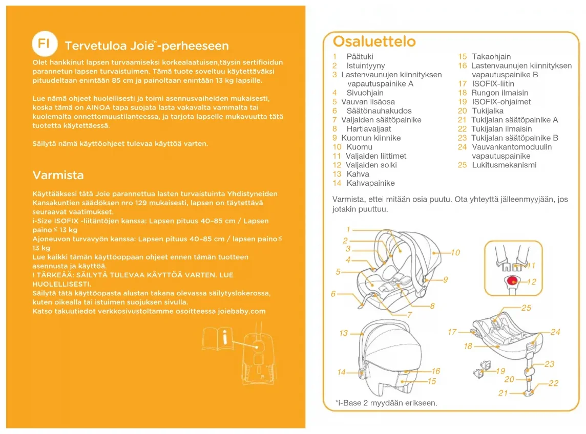 -perheeseen Olet hankkinut lapsen turvaamiseksi korkealaatuisen﹐täysin sertifioidun parannetun lapsen turvaistuimen. Tämä tuote soveltuu käytettäväksi pituudeltaan enintään 85 cm ja painoltaan enintään 13 kg lapsille.Lue nämä ohjeet huolellisesti ja toimi asennusvaiheiden mukaisesti﹐ koska tämä on AINOA tapa suojata lasta vakavalta vammalta tai kuolemalta onnettomuustilanteessa﹐ ja tarjota lapselle mukavuutta tätä tuotetta käytettäessä.Säilytä nämä käyttöohjeet tulevaa käyttöä varten. Varmista Käyttääksesi tätä Joie parannettua lasten turvaistuinta Yhdistyneiden Kansakuntien säädöksen nro 129 mukaisesti﹐ lapsen on täytettävä seuraavat vaatimukset.i-Size ISOFIX -liitäntöjen kanssa: Lapsen pituus 40–85 cm / Lapsen paino 13 kgAjoneuvon turvavyön kanssa: Lapsen pituus 40–85 cm / lapsen paino