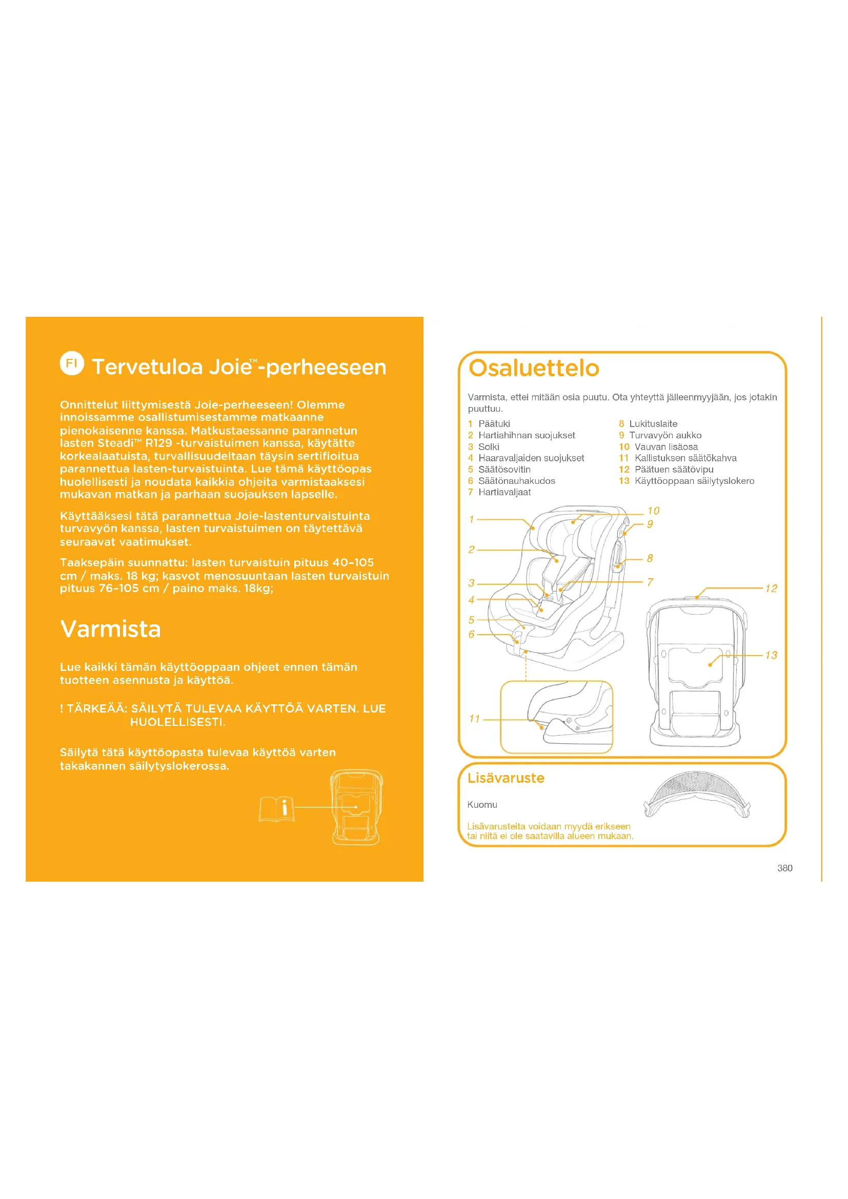-perheeseen Onnittelut liittymisestä Joie-perheeseen! Olemme innoissamme osallistumisestamme matkaanne pienokaisenne kanssa. Matkustaessanne parannetun lasten Steadi™ R129 -turvaistuimen kanssa, käytätte korkealaatuista, turvallisuudeltaan täysin sertifioitua parannettua lasten-turvaistuinta. Lue tämä käyttöopas huolellisesti ja noudata kaikkia ohjeita varmistaaksesi mukavan matkan ja parhaan suojauksen lapselle.Käyttääksesi tätä parannettua Joie-lastenturvaistuinta turvavyön kanssa, lasten turvaistuimen on täytettävä seuraavat vaatimukset.Taaksepäin suunnattu: lasten turvaistuin pituus 40–105 cm / maks. 18 kg; kasvot menosuuntaan lasten turvaistuin pituus 76–105 cm / paino maks. 18kg; Varmista Lue kaikki tämän käyttöoppaan ohjeet ennen tämän tuotteen asennusta ja käyttöä.! TÄRKEÄÄ: SÄILYTÄ TULEVAA KÄYTTÖÄ VARTEN. LUE HUOLELLISESTI.Säilytä tätä käyttöopasta tulevaa käyttöä varten takakannen säilytyslokerossa.