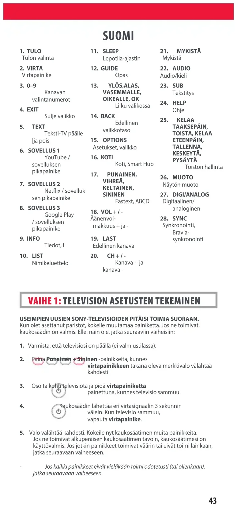 SVERIGE43 SUOMI USEIMPIEN UUSIEN SONY-TELEVISIOIDEN PITÄISI TOIMIA SUORAAN. Kun olet asettanut paristot, kokeile muutamaa painiketta. Jos ne toimivat, kaukosäädin on valmis. Ellei näin ole, jatka seuraaviin vaiheisiin: