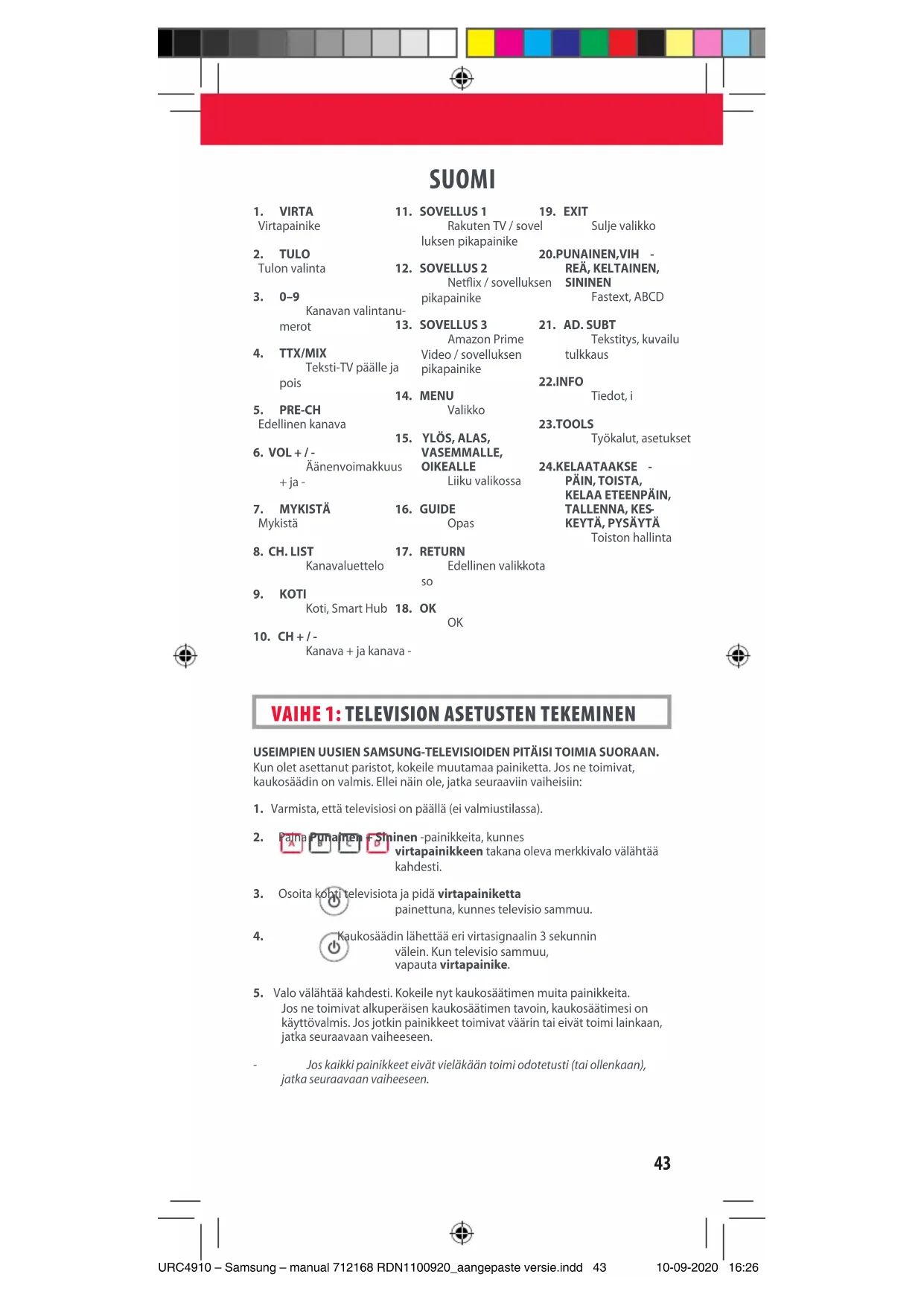 SVERIGE URC4910 – Samsung – manual 712168 RDN1100920_aangepaste versie.indd 42URC4910 – Samsung – manual 712168 RDN1100920_aangepaste versie.indd 42 10-09-2020 16:2610-09-2020 16:2643 SUOMI USEIMPIEN UUSIEN SAMSUNG-TELEVISIOIDEN PITÄISI TOIMIA SUORAAN. Kun olet asettanut paristot, kokeile muutamaa painiketta. Jos ne toimivat, kaukosäädin on valmis. Ellei näin ole, jatka seuraaviin vaiheisiin: