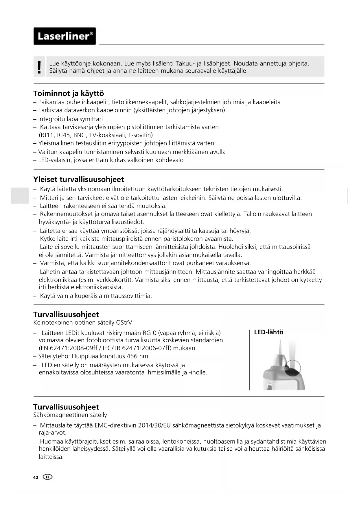 Toiminnot ja käyttö – Paikantaa puhelinkaapelit, tietoliikennekaapelit, sähköjärjestelmien johtimia ja kaapeleita – Tarkistaa dataverkon kaapeloinnin (yksittäisten johtojen järjestyksen) – Integroitu läpäisymittari – Kattava tarvikesarja yleisimpien pistoliittimien tarkistamista varten (RJ11, RJ45, BNC, TV-koaksiaali, F-sovitin) – Yleismallinen testausliitin erityyppisten johtojen liittämistä varten – Valitun kaapelin tunnistaminen selvästi kuuluvan merkkiäänen avulla – LED-valaisin, jossa erittäin kirkas valkoinen kohdevalo Yleiset turvallisuusohjeet – Käytä laitetta yksinomaan ilmoitettuun käyttötarkoitukseen teknisten tietojen mukaisesti. – Mittari ja sen tarvikkeet eivät ole tarkoitettu lasten leikkeihin. Säilytä ne poissa lasten ulottuvilta. – Laitteen rakenteeseen ei saa tehdä muutoksia. – Rakennemuutokset ja omavaltaiset asennukset laitteeseen ovat kiellettyjä. Tällöin raukeavat laitteen hyväksyntä- ja käyttöturvallisuustiedot. – Laitetta ei saa käyttää ympäristöissä, joissa räjähdysalttiita kaasuja tai höyryjä. – Kytke laite irti kaikista mittauspiireistä ennen paristolokeron avaamista. – Laite ei sovellu mittausten suorittamiseen jännitteisistä johdoista. Huolehdi siksi, että mittauspiirissä ei ole jännitettä. Varmista jännitteettömyys jollakin asianmukaisella tavalla. – Varmista, että kaikki suurjännitekondensaattorit ovat purkaneet varauksensa. – Lähetin antaa tarkistettavaan johtoon mittausjännitteen. Mittausjännite saattaa vahingoittaa herkkää elektroniikkaa (esim. verkkokortit). Varmista siksi ennen mittausta, että tarkistettavat johdot on kytketty irti herkistä elektroniikkaosista. – Käytä vain alkuperäisiä mittaussovittimia. Turvallisuusohjeet Keinotekoinen optinen säteily OStrV Turvallisuusohjeet Sähkömagneettinen säteily – Laitteen LEDit kuuluvat riskiryhmään RG 0 (vapaa ryhmä, ei riskiä) voimassa olevien fotobioottista turvallisuutta koskevien standardien (EN 62471:2008-09ff / IEC/TR 62471:2006-07ff) mukaan. – Säteilyteho: Huippuaallonpituus 456 nm. – LEDien säteily on määräysten mukaisessa käytössä ja ennakoitavissa olosuhteissa vaaratonta ihmissilmälle ja -iholle. – Mittauslaite täyttää EMC-direktiivin 2014/30/EU sähkömagneettista sietokykyä koskevat vaatimukset ja raja-arvot. – Huomaa käyttörajoitukset esim. sairaaloissa, lentokoneissa, huoltoasemilla ja sydäntahdistimia käyttävien henkilöiden läheisyydessä. Säteilyllä voi olla vaarallisia vaikutuksia tai se voi aiheuttaa häiriöitä sähköisissä laitteissa. LED-lähtöMultiCable-Checker