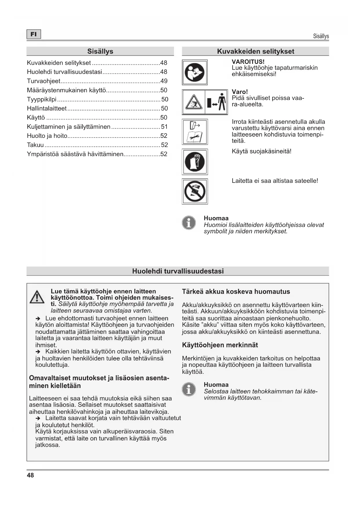 - Lue tämä käyttöohje ennen laitteen käyttöönottoa. Toimi ohjeiden mukaises- ti. Säilytä käyttöohje myöhempää tarvetta ja laitteen seuraavaa omistajaa varten. Î Lue ehdottomasti turvaohjeet ennen laitteen käytön aloittamista! Käyttöohjeen ja turvaohjeiden noudattamatta jättäminen saattaa vahingoittaa laitetta ja vaarantaa laitteen käyttäjän ja muut ihmiset. Î Kaikkien laitetta käyttöön ottavien, käyttävien ja huoltavien henkilöiden tulee olla tehtäviinsä koulutettuja. Omavaltaiset muutokset ja lisäosien asenta- minen kielletään Laitteeseen ei saa tehdä muutoksia eikä siihen saa asentaa lisäosia. Sellaiset muutokset saattaisivat aiheuttaa henkilövahinkoja ja aiheuttaa laitevikoja. Î Laitetta saavat korjata vain tehtävään valtuutetut ja koulutetut henkilöt. Käytä korjauksissa vain alkuperäisvaraosia. Siten varmistat, että laite on turvallinen käyttää myös jatkossa. Tärkeä akkua koskeva huomautus Akku/akkuyksikkö on asennettu käyttövarteen kiin- teästi. Akkuun/akkuyksikköön kohdistuvia toimenpi- teitä saa suorittaa ainoastaan pienkonehuolto. Käsite ”akku” viittaa siten myös koko käyttövarteen, jossa akku/akkuyksikkö on kiinteästi asennettuna. Käyttöohjeen merkinnät Merkintöjen ja kuvakkeiden tarkoitus on helpottaa ja nopeuttaa käyttöohjeen ja laitteen turvallista käyttöä. Huomaa Selostaa laitteen tehokkaimman tai käte- vimmän käyttötavan. Sisällys Kuvakkeiden selitykset p. 48
