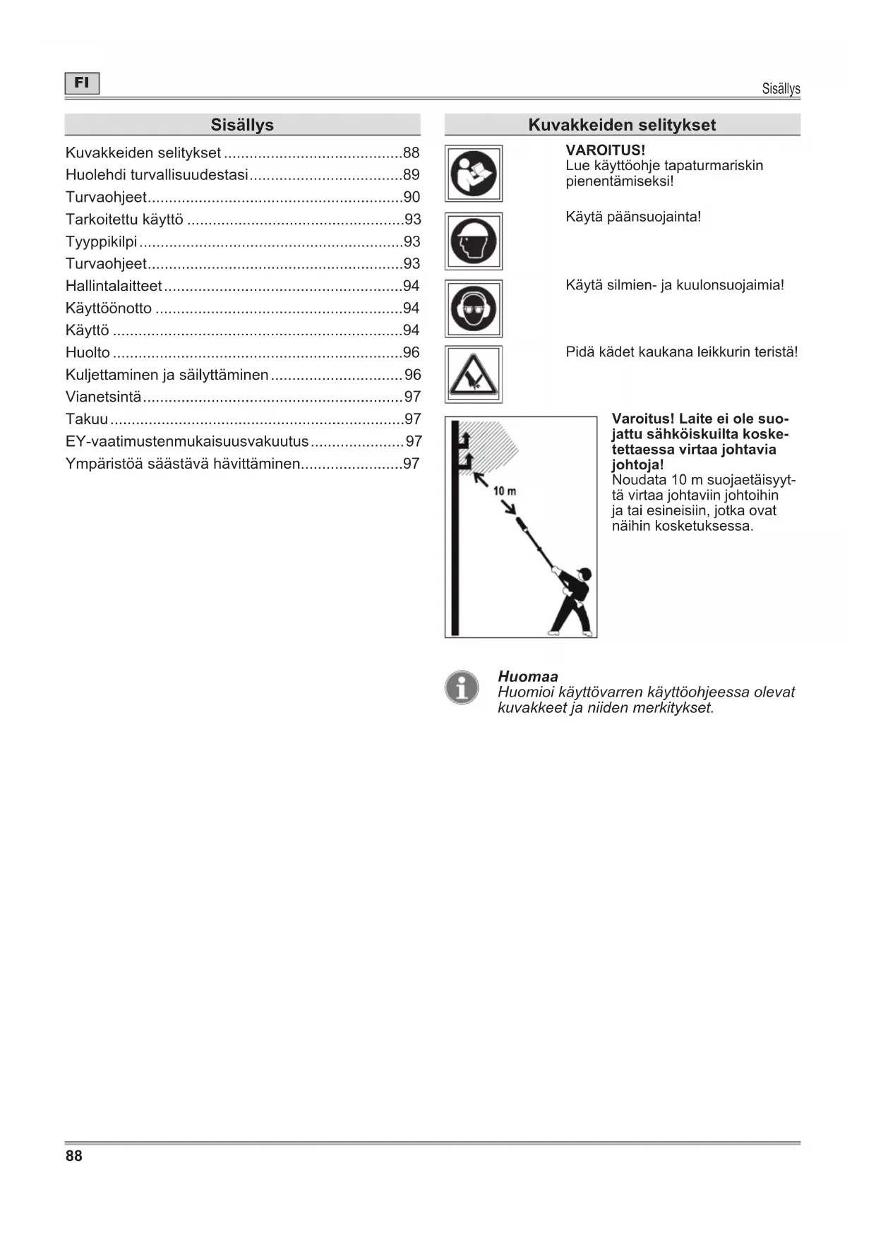 - Ympäristöä säästävä hävittäminen Kuvakkeiden selitykset VAROITUS! Lue käyttöohje tapaturmariskin pienentämiseksi! Käytä päänsuojainta! Käytä silmien- ja kuulonsuojaimia! Pidä kädet kaukana leikkurin teristä! Varoitus! Laite ei ole suo- jattu sähköiskuilta koske- tettaessa virtaa johtavia johtoja! Noudata 10 m suojaetäisyyt- tä virtaa johtaviin johtoihin ja tai esineisiin, jotka ovat näihin kosketuksessa. Huomaa Huomioi käyttövarren käyttöohjeessa olevat kuvakkeet ja niiden merkitykset.Kuvakkeiden selitykset p. 97