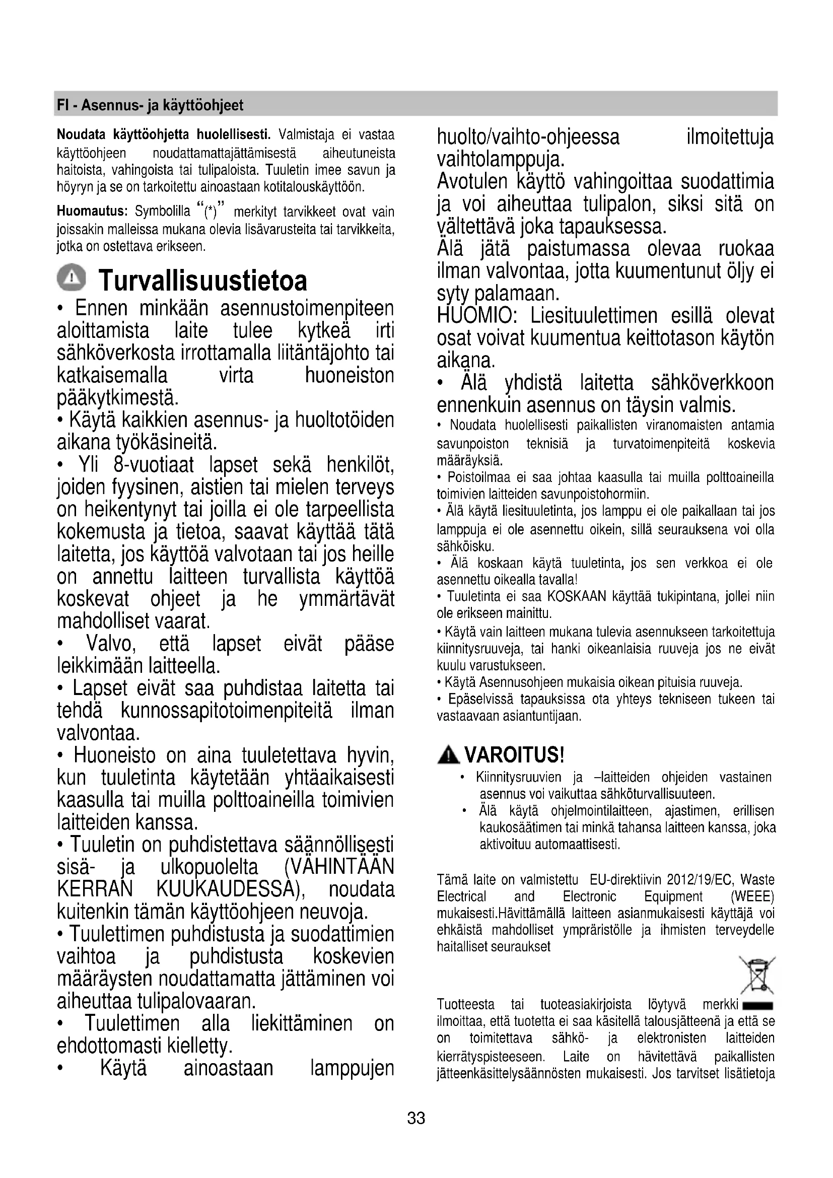 - Älä käytä ohjelmointilaitteen, ajastimen, erillisen kaukosäätimen tai minkä tahansa laitteen kanssa, joka aktivoituu automaattisesti. Tämä laite on valmistettu EU-direktiivin 2012/19/EC, Waste Electrical and Electronic Equipment (WEEE) mukaisesti.Hävittämällä laitteen asianmukaisesti käyttäjä voi ehkäistä mahdolliset ympräristölle ja ihmisten terveydelle haitalliset seuraukset Tuotteesta tai tuoteasiakirjoista löytyvä merkki ilmoittaa, että tuotetta ei saa käsitellä talousjätteenä ja että se on toimitettava sähkö- ja elektronisten laitteiden kierrätyspisteeseen. Laite on hävitettävä paikallisten jätteenkäsittelysäännösten mukaisesti. Jos tarvitset lisätietoja34 laitteen käsittelystä, palautuksesta ja kierrätyksestä, ota yhteys paikalliseen viranomaiseen, jätehuoltoon tai liikkeeseen josta tuote on ostettu. Laitteisto suunniteltu, testattu ja valmistettu seuraavien standardien mukaisesti: