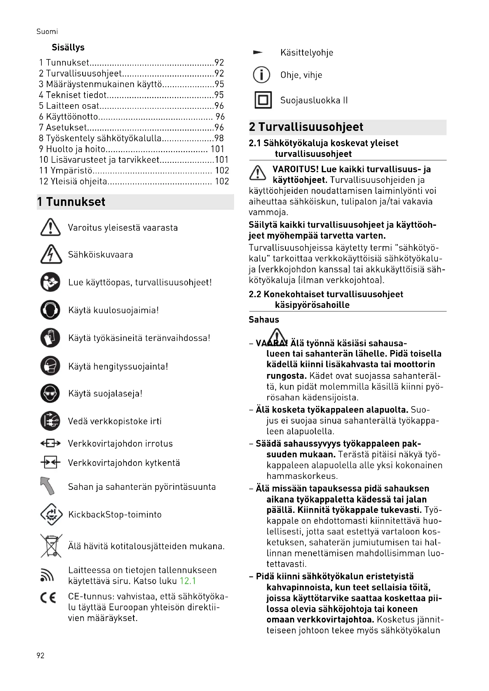 - 12 Yleisiä ohjeita 1 Tunnukset Varoitus yleisestä vaarasta Sähköiskuvaara Lue käyttöopas, turvallisuusohjeet! Käytä kuulosuojaimia! Käytä työkäsineitä teränvaihdossa! Käytä hengityssuojainta! Käytä suojalaseja! Vedä verkkopistoke irti Verkkovirtajohdon irrotus Verkkovirtajohdon kytkentä Sahan ja sahanterän pyörintäsuunta KickbackStop-toiminto Älä hävitä kotitalousjätteiden mukana. Laitteessa on tietojen tallennukseen käytettävä siru. Katso luku 12.1 CE-tunnus: vahvistaa, että sähkötyöka lu täyttää Euroopan yhteisön direktii vien määräykset. Käsittelyohje Ohje, vihje Suojausluokka II 2 Turvallisuusohjeet p. 102
