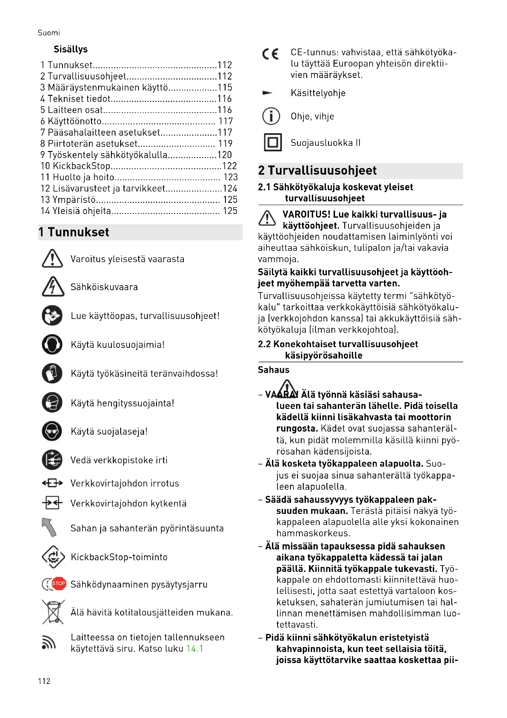 - 14 Yleisiä ohjeita 1 Tunnukset Varoitus yleisestä vaarasta Sähköiskuvaara Lue käyttöopas, turvallisuusohjeet! Käytä kuulosuojaimia! Käytä työkäsineitä teränvaihdossa! Käytä hengityssuojainta! Käytä suojalaseja! Vedä verkkopistoke irti Verkkovirtajohdon irrotus Verkkovirtajohdon kytkentä Sahan ja sahanterän pyörintäsuunta KickbackStop-toiminto STOP Sähködynaaminen pysäytysjarru Älä hävitä kotitalousjätteiden mukana. Laitteessa on tietojen tallennukseen käytettävä siru. Katso luku 14.1 CE-tunnus: vahvistaa, että sähkötyöka lu täyttää Euroopan yhteisön direktii vien määräykset. Käsittelyohje Ohje, vihje Suojausluokka II 2 Turvallisuusohjeet p. 125