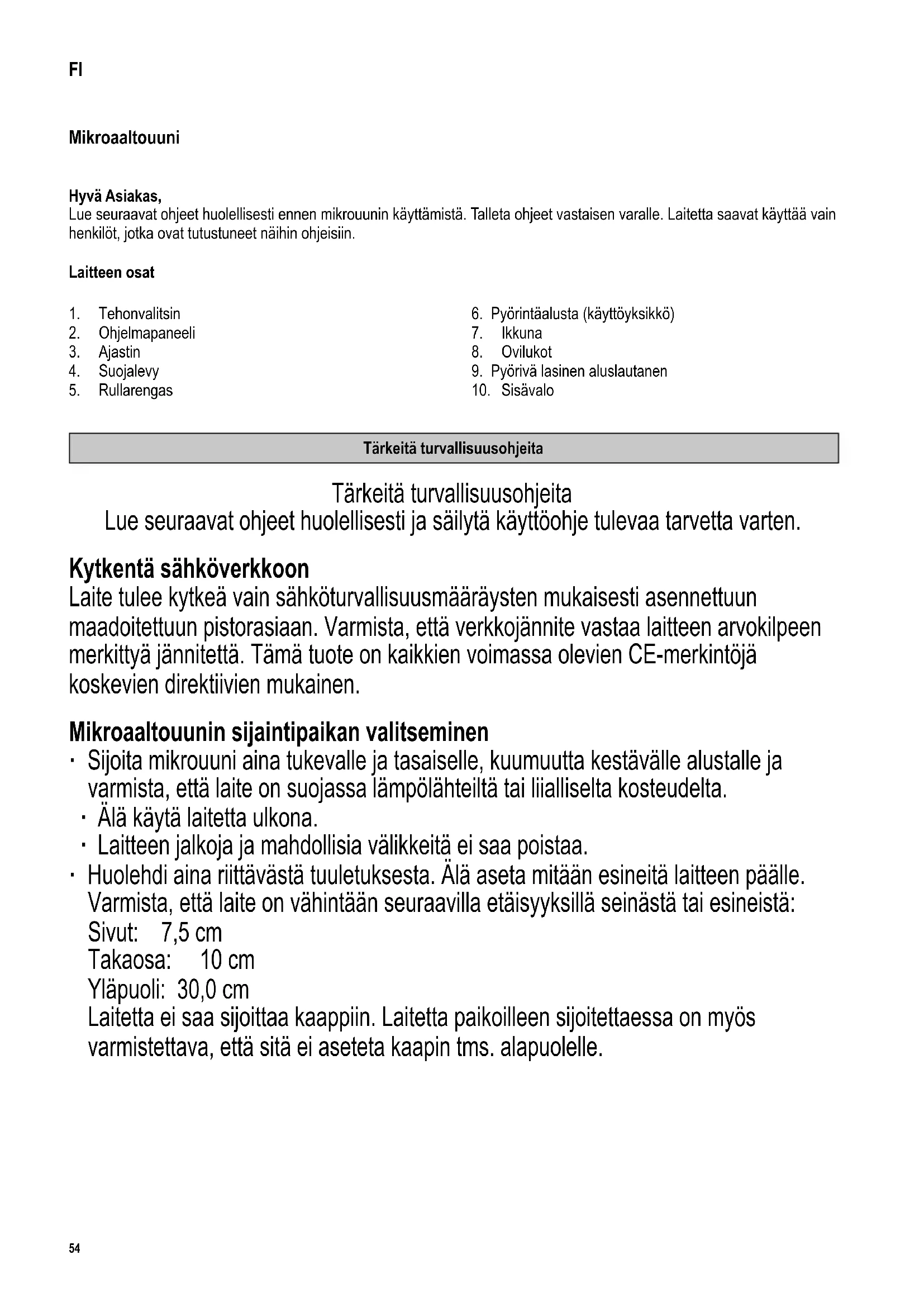Tärkeitä turvallisuusohjeita Tärkeitä turvallisuusohjeita Lue seuraavat ohjeet huolellisesti ja säilytä käyttöohje tulevaa tarvetta varten. Kytkentä sähköverkkoon Laite tulee kytkeä vain sähköturvallisuusmääräysten mukaisesti asennettuun maadoitettuun pistorasiaan. Varmista, että verkkojännite vastaa laitteen arvokilpeen merkittyä jännitettä. Tämä tuote on kaikkien voimassa olevien CE-merkintöjä koskevien direktiivien mukainen. Mikroaaltouunin sijaintipaikan valitseminen ∙ Sijoita mikrouuni aina tukevalle ja tasaiselle, kuumuutta kestävälle alustalle ja varmista, että laite on suojassa lämpölähteiltä tai liialliselta kosteudelta. ∙ Älä käytä laitetta ulkona. ∙ Laitteen jalkoja ja mahdollisia välikkeitä ei saa poistaa. ∙ Huolehdi aina riittävästä tuuletuksesta. Älä aseta mitään esineitä laitteen päälle. Varmista, että laite on vähintään seuraavilla etäisyyksillä seinästä tai esineistä: Sivut: 7,5 cm Takaosa: 10 cm Yläpuoli: 30,0 cm Laitetta ei saa sijoittaa kaappiin. Laitetta paikoilleen sijoitettaessa on myös varmistettava, että sitä ei aseteta kaapin tms. alapuolelle.55 142 x 208 mm Tärkeää ∙ Varoitus: Jotkut ruoat syttyvät helposti palamaan. Älä koskaan poistu paikalta laitteen ollessa toimintakunnossa. ∙ Tämä mikroaaltouuni on tarkoitettu vain ruuan sulattamiseen, kuumentamiseen ja kypsentämiseen. Varoitus: Jos ruokaa tai vaatteita yritetään kuivata tai lämpötyynyjä, kotitossuja, sieniä, märkiä puhdistusriepuja jne. lämmittää, seurauksena voi olla vammoja, palaminen tai tulipalo. ∙ Valmistaja ei vastaa mahdollisista laitteen väärinkäytöstä tai käyttöohjeiden laiminlyömisestä johtuvista vaurioista. ∙ Vain mikroaaltouuniin sopivia astioita saa käyttää. Metalliastioita ja -säiliöitä ei saa käyttää ruokien ja juomien lämmittämiseen mikroaaltouunissa. Katso lisätietoja kohdasta ’Käytä aina mikrouuniin sopivia astioita’. ∙ Tätä laitetta ei ole tarkoitettu käytettäväksi erillisen ajastimen tai kaukosäätimen kanssa. ∙ Tätä laitetta saavat käyttää lapset (vähintään 8-vuotiaat) sekä henkilöt, joilla on fyysisesti, aistillisesti tai henkisesti rajoittunut toimintakyky tai joilla on puuttuvat tai vajavaiset tiedot laitteen toiminnasta, mikäli heitä valvotaan tai ohjataan laitteen käytössä ja he ymmärtävät täysin kaikki käyttöön liittyvät vaarat ja turvatoimenpiteet. ∙ Lasten ei saa antaa leikkiä laitteella. ∙ Lasten ei saa antaa tehdä laitteen puhdistus- tai huoltotoimenpiteitä, elleivät he ole aikuisen valvonnassa. ∙ Laite ja sen liitäntäjohto täytyy aina pitää alle 8-vuotiaiden ulottumattomissa. ∙ Sähköiskun välttämiseksi älä puhdista laitetta vedellä äläkä upota sitä veteen. ∙ Laitetta ei saa puhdistaa höyrypesurilla. ∙ Katkaise aina virta laitteesta ja irrota pistotulppa pistorasiasta: - ennen laitteen puhdistamista ja, - mahdollisen toimintahäiriön sattuessa. - jokaisen käyttökerran jälkeen. ∙ Kun irrotat pistotulpan pistorasiasta, älä vedä liitäntäjohdosta vaan tartu aina pistotulppaan. Älä tartu virtapistokkeeseen märin käsin.