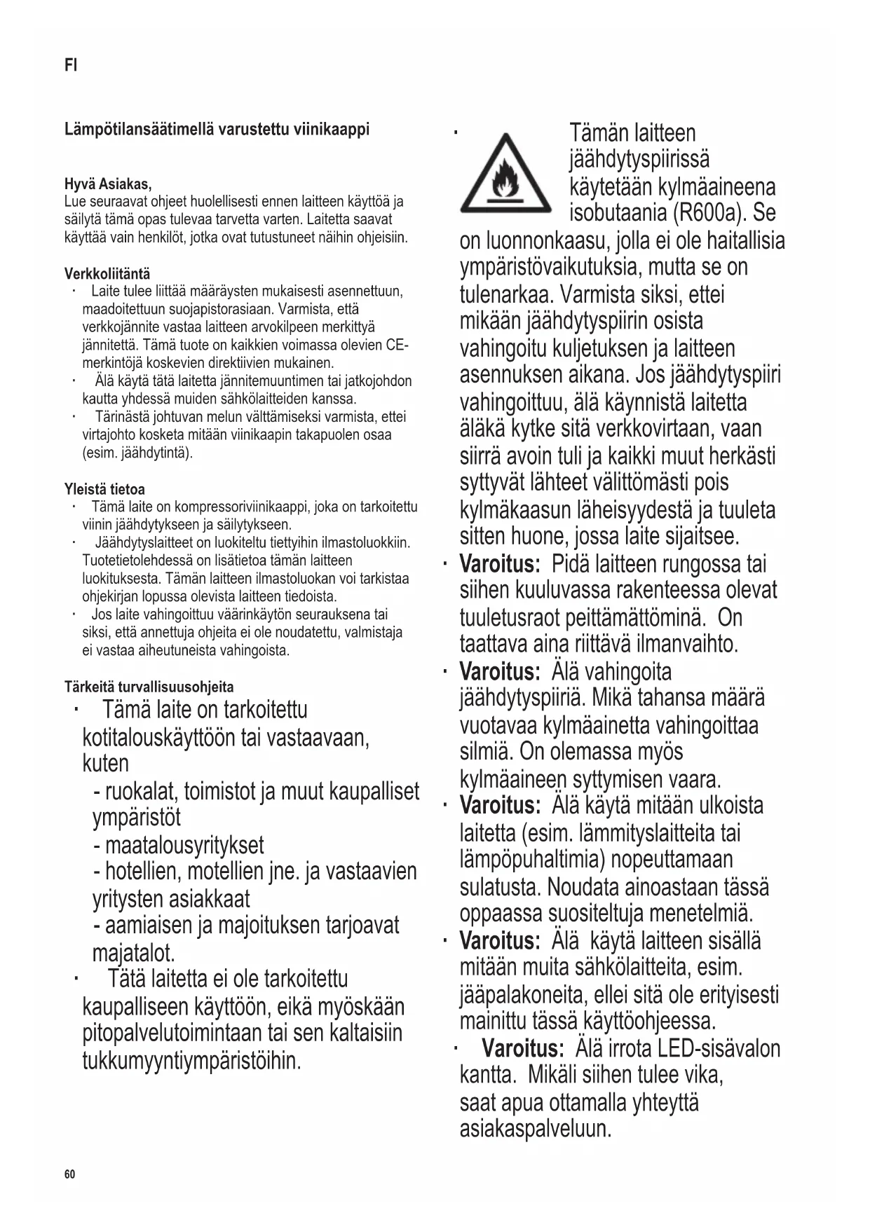 Tämän laitteen jäähdytyspiirissä käytetään kylmäaineena isobutaania (R600a). Se on luonnonkaasu, jolla ei ole haitallisia ympäristövaikutuksia, mutta se on tulenarkaa. Varmista siksi, ettei mikään jäähdytyspiirin osista vahingoitu kuljetuksen ja laitteen asennuksen aikana. Jos jäähdytyspiiri vahingoittuu, älä käynnistä laitetta äläkä kytke sitä verkkovirtaan, vaan siirrä avoin tuli ja kaikki muut herkästi syttyvät lähteet välittömästi pois kylmäkaasun läheisyydestä ja tuuleta sitten huone, jossa laite sijaitsee. ∙ Varoitus: Pidä laitteen rungossa tai siihen kuuluvassa rakenteessa olevat tuuletusraot peittämättöminä. On taattava aina riittävä ilmanvaihto. ∙ Varoitus: Älä vahingoita jäähdytyspiiriä. Mikä tahansa määrä vuotavaa kylmäainetta vahingoittaa silmiä. On olemassa myös kylmäaineen syttymisen vaara. ∙ Varoitus: Älä käytä mitään ulkoista laitetta (esim. lämmityslaitteita tai lämpöpuhaltimia) nopeuttamaan sulatusta. Noudata ainoastaan tässä oppaassa suositeltuja menetelmiä. ∙ Varoitus: Älä käytä laitteen sisällä mitään muita sähkölaitteita, esim. jääpalakoneita, ellei sitä ole erityisesti mainittu tässä käyttöohjeessa. ∙ Varoitus: Älä irrota LED-sisävalon kantta. Mikäli siihen tulee vika, saat apua ottamalla yhteyttä asiakaspalveluun. FI61 142 x 208 mm ∙ Koko laite, mukaan lukien sen virtajohto, on tarkastettava perusteellisesti kuljetusvaurioiden varalta ennen verkkovirtaan liittämistä. Jos tällaisia vaurioita löytyy, laitetta ei saa liittää verkkovirtaan. ∙ Valittaessa laitteen paikkaa, varmista ettei sähköjohto ole jäänyt kiinni tai vahingoittunut. ∙ Älä sijoita siirrettäviä pistorasioita tai siirrettäviä virtalähteitä laitteen perään. ∙ Tätä laitetta ei ole tarkoitettu räjähdysherkkien aineiden säilytykseen kuten aerosolipurkkien, joissa on tulenarkaa ponneainetta. ∙ Jos laite myydään, annetaan ulkopuoliselle tai hävitetään sopivassa kierrätyslaitoksessa, on kiinnitettävä huomiota eristyskaasuna toimivan syklopentaanin sekä kylmäaineen (R 600 a) olemassaoloon. Lisätietoa oikein kierrätyksestä on osassa Jätehuolto. ∙ Jotta turvallisuusmääräyksiä noudatetaan ja vaarat vältetään, vain valmistajan valtuuttama huoltohenkilöstö saa tehdä laitteeseen korjauksia tai muutoksia mukaan lukien vaihtaa virtajohdon. ∙ Tätä laitetta saavat käyttää lapset (vähintään 8-vuotiaat) sekä henkilöt, joilla on fyysisesti, aistillisesti tai henkisesti rajoittunut toimintakyky tai joilla on puuttuvat tai vajavaiset tiedot laitteen toiminnasta, mikäli heitä valvotaan tai ohjataan laitteen käytössä ja he ymmärtävät täysin kaikki käyttöön liittyvät vaarat ja turvatoimenpiteet. ∙ Yli 3-vuotiaat lapset voivat täyttää ja tyhjentää laitteen. ∙ Lasten ei saa antaa leikkiä laitteella. ∙ Lasten ei saa antaa tehdä laitteen puhdistus- tai huoltotoimenpiteitä, elleivät he ole valvonnassa. ∙ Säännölliseen puhdistukseen suosittelemme lämpimän veden ja miedon puhdistusaineen käyttöä. Yksityiskohtaisia tietoja laitteen puhdistuksesta on osassa Laitteen puhdistus ja hoito. ∙ Sähköiskun vaaran välttämiseksi älä puhdista laitetta nesteillä äläkä upota sitä nesteisiin. ∙ Varoitus: Älä irrota LED-sisävalon kantta. Mikäli siihen tulee vika, saat apua ottamalla yhteyttä asiakaspalveluun. Välttääksesi ruoan pilaantumisen, noudata seuraavia ohjeita: ∙ Oven avaaminen pitkäksi aikaa voi aiheuttaa huomattavan lämpötilan nousun laitteen lokeroissa. Varmista, että ovi on suljettu oikein eivätkä viinipullot ole oven esteenä. ∙ Siivoa usein pinnat, jotka ovat kosketuksessa ruokaan ja näkyvillä oleviin kuivatusjärjestelmiin. ∙ Jos laite on pitkään tyhjillään, kytke laite pois päältä, puhdista se ja jätä ovi auki homehtumisen välttämiseksi. ∙ Tämä laite on tarkoitettu vain viinin säilytykseen. ∙ Jotta henkilövammojen tai viinikaapin vaurioitumisen vaara vältetään, laitetta saadaan kuljettaa ainoastaan sen alkuperäispakkauksessa. Laitteen poistamiseen pakkauksesta sekä asennukseen tarvitaan 2 henkilöä.62 142 x 208 mm ∙ Pyörillä olevaa laitetta saa kuljettaa vain lyhyitä matkoja. ∙ Varoitus: Pidä lapset poissa pakkausmateriaalien luota potentiaalisen vaaratilanteen esim. tukehtumisvaaran vuoksi. ∙ Virtajohto on tarkistettava säännöllisesti vaurioiden varalta. Jos johdossa on vikaa, laitetta ei saa enää käyttää. ∙ Älä aseta tulipalon vaaran välttämiseksi mitään lämpöä tuottavia sähkölaitteita jääkaapin päälle. Älä sijoita mitään nestettä sisältäviä astioita laitteen päälle. Siten estetään nesteiden valuminen tai vuotaminen ja siten sähköeristyksen vaurioituminen. ∙ Älä peitä, muuta tai irrota ulosvedettäviä puualustoja. Sisäpuolen ilmankierto on aina varmistettava. ∙ Älä nojaa äläkä kohdista kohtuutonta painoa hyllyihin, oveen jne. ∙ Laitteen kaatumisen välttämiseksi puualustoja ei saa vetää samanaikaisesti ulos. ∙ Suojaa viinikaapin sisustaa aina avoimilta liekeiltä ja muilta syttymislähteiltä. ∙ Irrota pistoke seinäpistorasiasta - kun ilmenee mikä tahansa vika, - puhdistuksen ajaksi, - ennen huolto- tai korjaustöiden suorittamista. ∙ Kun irrotat pistokkeen pistorasiasta, älä vedä liitäntäjohdosta vaan tartu aina pistokkeeseen. ∙ Valmistaja pidättää itsellään oikeuden teknisiin muutoksiin. Laitteen osat