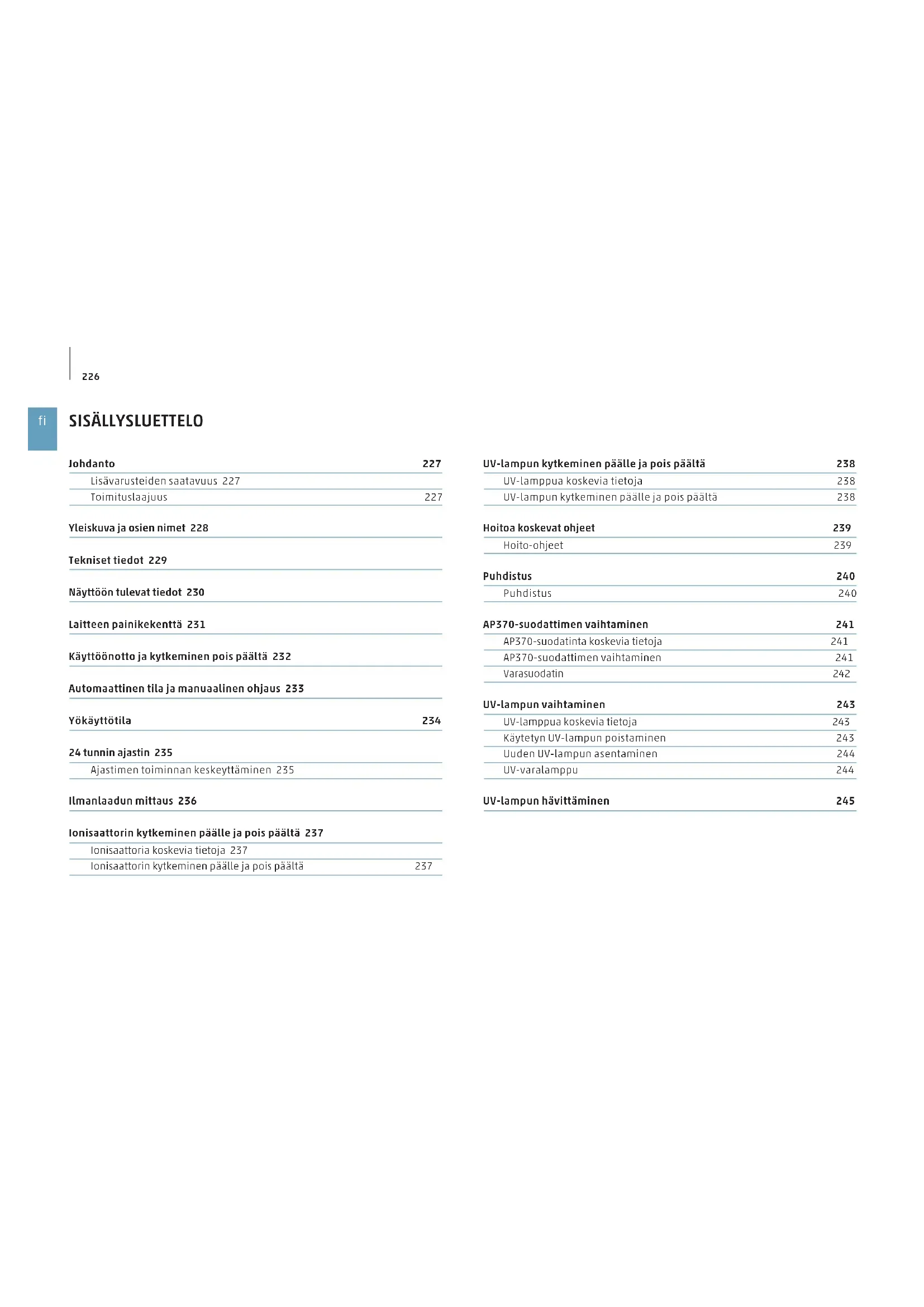 SISÄLLYSLUETTELO Johdanto 227 Lisävarusteiden saatavuus 227 Toimituslaajuus 227 Yleiskuva ja osien nimet 228 Tekniset tiedot 229 Näyttöön tulevat tiedot 230 Laitteen painikekenttä 231 Käyttöönotto ja kytkeminen pois päältä 232 Automaattinen tila ja manuaalinen ohjaus 233 Yökäyttötila 234 24 tunnin ajastin 235 Ajastimen toiminnan keskeyttäminen 235 Ilmanlaadun mittaus 236 Ionisaattorin kytkeminen päälle ja pois päältä 237 Ionisaattoria koskevia tietoja 237 Ionisaattorin kytkeminen päälle ja pois päältä 237 UV-lampun kytkeminen päälle ja pois päältä 238 UV-lamppua koskevia tietoja 238 UV-lampun kytkeminen päälle ja pois päältä 238 Hoitoa koskevat ohjeet 239 Hoito-ohjeet 239 Puhdistus 240 Puhdistus 240 AP370-suodattimen vaihtaminen 241 AP370-suodatinta koskevia tietoja 241 AP370-suodattimen vaihtaminen 241 Varasuodatin 242 UV-lampun vaihtaminen 243 UV-lamppua koskevia tietoja 243 Käytetyn UV-lampun poistaminen 243 Uuden UV-lampun asentaminen 244 UV-varalamppu 244 UV-lampun hävittäminen 245227
