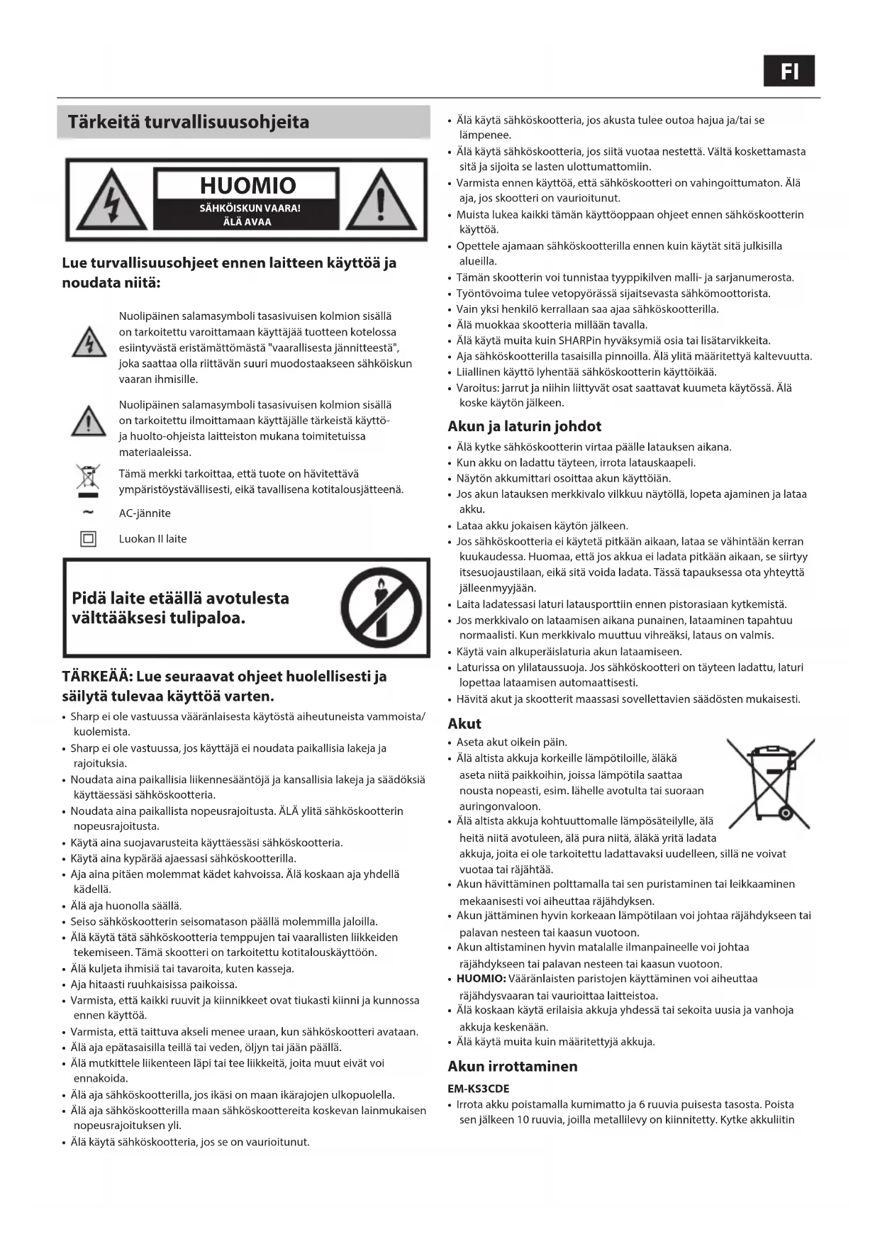 4 kertaa. https://www.sharpconsumer.com/sharp-life-appFI Vianmääritys Sähköskootteri ei liiku käynnistyksen jälkeen. Syy / toiminto Jarru ei ole palautunut täysin, mikä keskeyttää virransyötön. / Nollaa jarru manuaalisesti. Tämä voidaan tehdä painamalla jarruvipu takaisin normaaliasentoonsa. Sähköskootteri liikkuu hitaalla nopeudella tai ei liiku lainkaan. Syy / toiminto Akun varaustila on matala. / Akku on vaihdettava. Moottori käynnistyy ja sammuu jälkeen. Syy / toiminto Akun varaustila on matala. / Akku on vaihdettava. Ohjain on vaurioitunut. / Ohjain on vaihdettava. Akkuliitäntä on väljä. / Akkuliitännät on tarkistettava. Akkua ei voi ladata tai se on latautunut hitaasti. Syy / toiminto Jännite on väärä. / Akku on vaihdettava. Akku ei lataudu. Akun käyttöikä on tullut loppuun. / Akku on vaihdettava. Akkulaturi ei toimita virtaa. / Vaihda akkulaturi. Latausjohto on vahingoittunut. / Vaihda akkulaturi. Virhekoodit Virhekoodeja saatetaan näyttää. Sähköskootteri lakkaa toimimasta näissä olosuhteissa. E0 – Kommunikaatiovirhe E1 – Epänormaali virta E2 – Kaasuvivun toimintahäiriö E3 – Jarrujen toimintahäiriö E4 – MOS-vika / Ylivirtavika E5 – Hall-anturivika / Moottorivika E6 – Moottorivika E7 – Matalajännitevirhe Jos kohtaat ongelmia, joita ei voida ratkaista, ota yhteyttä jälleenmyyjään tai SHARPin tukeen saadaksesi neuvoja.72 Tekniset tiedot Malli EM-KS3CDE EM-KS4CDE Koko avattuna (L x K x P mm:nä) 560 x 1230 x 1060 560 x 1230 x 1180 Koko taitettuna (L x K x P mm:nä) 560 x 455 x 1060 560 x 500 x 1180 Pyörän koko (tuumaa) 8,5 10 Pohjalevyn koko (L x P mm:nä) 162 x 460 160 x 483 Pohjalevy ohjaustangon yläosaan (mm) 1 020 1 025 Maasta pohjalevyyn (mm) 145 180 Muut tekniset tiedot Jarrutyyppi Levyjarru / sähköjarru / jalkajarru Levyjarru / Rumpujarru / sähköjarru Moottorityyppi harjaton energiaa säästävä moottori Ajopyörä Etu Taka Enimmäisnousukulma (astetta) 15° Enimmäiskuorma (kg) 120 Enimmäisnopeus (km/h) 20 20 Moottoriteho (Wattia) 350 W 350 W Ajomatka täyteen ladattuna (km) 25 40 Rengaspaine – 2,5 bar (36 psi) Pyörätyyppi hunajakennorengas täytettävä rengas Paino (kg) 16 19,3 USB-latauspistoke 5 V; 0,5 A Akku Akkutyyppi (Ah) 18650 litiumakku Akkukapasiteetti (A/tunti) 7,5 10 Akku (jännite) 36 Akku (teho) 270 360 Latausaika (tuntia) 4–5 6–8 Akkulaturi Teho - lataaminen 87 % Mallinimi FY0634201500 Tulo 100 - 240 V AC, 50/60 Hz, 1,8 A (Maks.) Verkkoliitäntätyyppi ”Kuva 8” -tyyppinen. Johto - C7, laturi - C8 Lähtö 42 V DC, 1,5 A Valmistaja ja osoite Shenzhen Fuyuandian Power Co., Ltd. 8F, A9 Bldg, Tiarui Industrial Park, Fuyong Town, Baoan District, Shenzhen, Guangdong, ChinaFI Bluetooth Versio LE5.0 /BT7L 8.30 Suurin lähetetty teho 10 dbm Taajuuskaistat 2,4 GHz Liitettävyys Käytetään liittämään mobiililaite sähköskootteriin sovelluskäyttöä varten Standardit Bluetooth®-sanamerkki ja logot ovat Bluetooth SIG:n omistamia ja rekisteröimiä tavaramerkkejä. - Toimintaympäristö Lämpötila -10 °C - +45 °C Varastointilämpötila -10 °C - +25 °C Suhteellinen kosteus jopa 75% RH OSANA JATKUVAN KEHITTÄMISEN PERIAATETTAMME PIDÄTÄMME OIKEUDEN MUUTTAA LAITTEEN MUOTOILUA ILMAN ERILLISTÄ ILMOITUSTA.74 Consignes de sécurité importantes ATTENTION