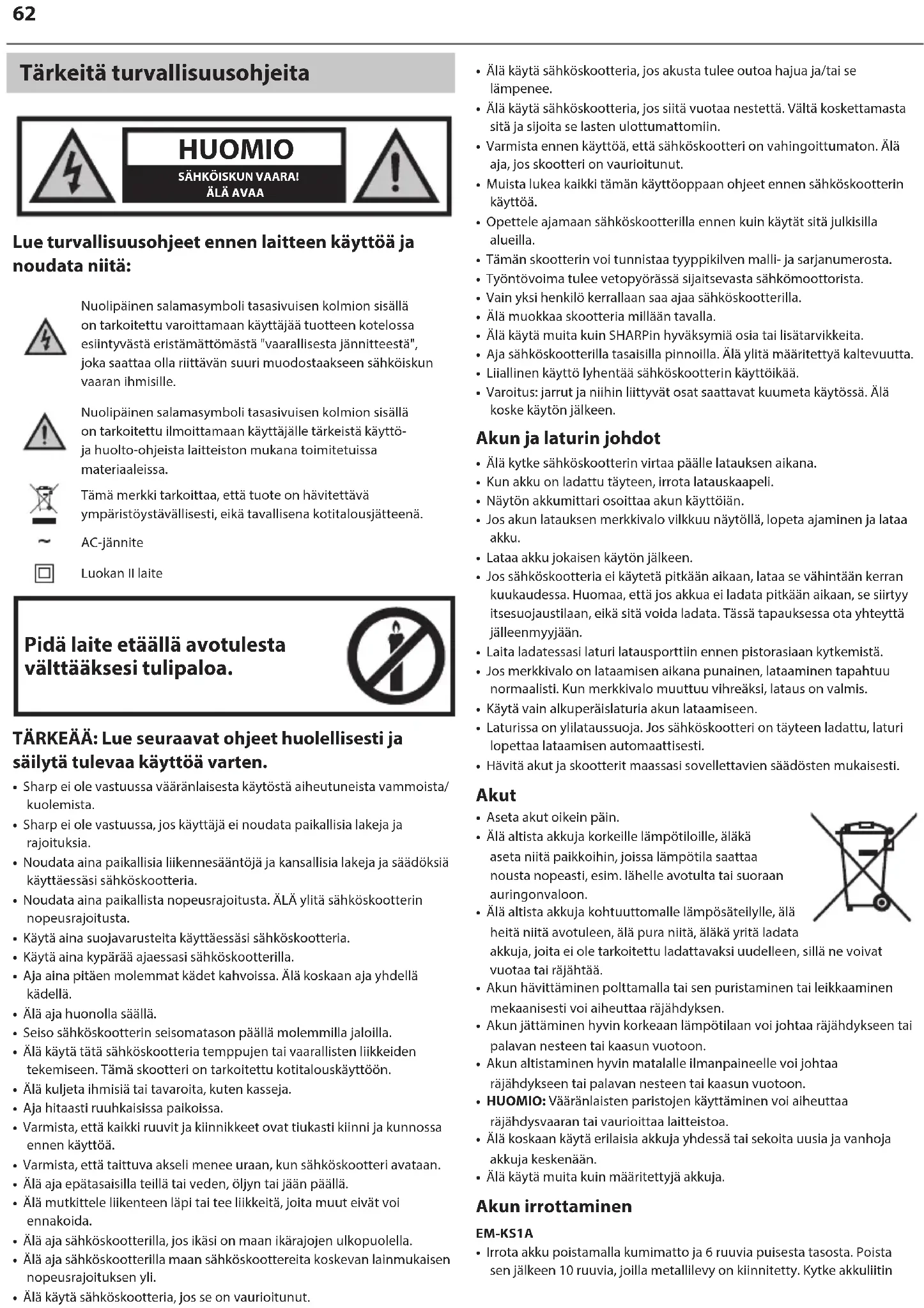 - Sharp ei ole vastuussa vääränlaisesta käytöstä aiheutuneista vammoista/kuolemista.• Sharp ei ole vastuussa, jos käyttäjä ei noudata paikallisia lakeja ja rajoituksia.• Noudata aina paikallisia liikennesääntöjä ja kansallisia lakeja ja säädöksiä käyttäessäsi sähköskootteria.• Noudata aina paikallista nopeusrajoitusta. ÄLÄ ylitä sähköskootterin nopeusrajoitusta.• Käytä aina suojavarusteita käyttäessäsi sähköskootteria.• Käytä aina kypärää ajaessasi sähköskootterilla.• Aja aina pitäen molemmat kädet kahvoissa. Älä koskaan aja yhdellä kädellä.• Älä aja huonolla säällä.• Seiso sähköskootterin seisomatason päällä molemmilla jaloilla.• Älä käytä tätä sähköskootteria temppujen tai vaarallisten liikkeiden tekemiseen. Tämä skootteri on tarkoitettu kotitalouskäyttöön.• Älä kuljeta ihmisiä tai tavaroita, kuten kasseja.• Aja hitaasti ruuhkaisissa paikoissa.• Varmista, että kaikki ruuvit ja kiinnikkeet ovat tiukasti kiinni ja kunnossa ennen käyttöä.• Varmista, että taittuva akseli menee uraan, kun sähköskootteri avataan.• Älä aja epätasaisilla teillä tai veden, öljyn tai jään päällä.• Älä mutkittele liikenteen läpi tai tee liikkeitä, joita muut eivät voi ennakoida.• Älä aja sähköskootterilla, jos ikäsi on maan ikärajojen ulkopuolella.• Älä aja sähköskootterilla maan sähköskoottereita koskevan lainmukaisen nopeusrajoituksen yli.• Älä käytä sähköskootteria, jos se on vaurioitunut.• Älä käytä sähköskootteria, jos akusta tulee outoa hajua ja/tai se lämpenee.• Älä käytä sähköskootteria, jos siitä vuotaa nestettä. Vältä koskettamasta sitä ja sijoita se lasten ulottumattomiin.• Varmista ennen käyttöä, että sähköskootteri on vahingoittumaton. Älä aja, jos skootteri on vaurioitunut.• Muista lukea kaikki tämän käyttöoppaan ohjeet ennen sähköskootterin käyttöä.• Opettele ajamaan sähköskootterilla ennen kuin käytät sitä julkisilla alueilla.• Tämän skootterin voi tunnistaa tyyppikilven malli- ja sarjanumerosta.• Työntövoima tulee vetopyörässä sijaitsevasta sähkömoottorista.• Vain yksi henkilö kerrallaan saa ajaa sähköskootterilla.• Älä muokkaa skootteria millään tavalla.• Älä käytä muita kuin SHARPin hyväksymiä osia tai lisätarvikkeita.• Aja sähköskootterilla tasaisilla pinnoilla. Älä ylitä määritettyä kaltevuutta.• Liiallinen käyttö lyhentää sähköskootterin käyttöikää.• Varoitus: jarrut ja niihin liittyvät osat saattavat kuumeta käytössä. Älä koske käytön jälkeen. Akun ja laturin johdot