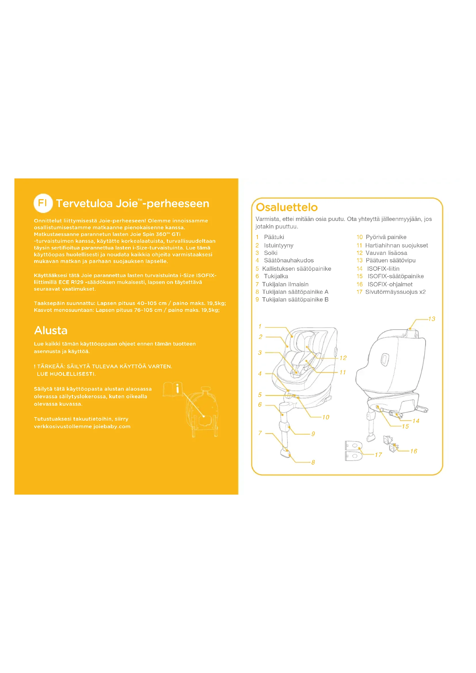 -perheeseen Onnittelut liittymisestä Joie-perheeseen! Olemme innoissamme osallistumisestamme matkaanne pienokaisenne kanssa. Matkustaessanne parannetun lasten Joie Spin 360™ GTi -turvaistuimen kanssa, käytätte korkealaatuista, turvallisuudeltaan täysin sertifioitua parannettua lasten i-Size-turvaistuinta. Lue tämä käyttöopas huolellisesti ja noudata kaikkia ohjeita varmistaaksesi mukavan matkan ja parhaan suojauksen lapselle.Käyttääksesi tätä Joie parannettua lasten turvaistuinta i-Size ISOFIX-liittimillä ECE R129 -säädöksen mukaisesti, lapsen on täytettävä seuraavat vaatimukset.Taaksepäin suunnattu: Lapsen pituus 40–105 cm / paino maks. 19,5kg;Kasvot menosuuntaan: Lapsen pituus 76–105 cm / paino maks. 19,5kg; Alusta Lue kaikki tämän käyttöoppaan ohjeet ennen tämän tuotteen asennusta ja käyttöä.! TÄRKEÄÄ: SÄILYTÄ TULEVAA KÄYTTÖÄ VARTEN.LUE HUOLELLISESTI.Säilytä tätä käyttöopasta alustan alaosassa olevassa säilytyslokerossa, kuten oikealla olevassa kuvassa.Tutustuaksesi takuutietoihin, siirry verkkosivustollemme joiebaby.com Osaluettelo 1 Päätuki2 Istuintyyny3 Solki4 Säätönauhakudos5 Kallistuksen säätöpainike6 Tukijalka7 Tukijalan ilmaisin8 Tukijalan säätöpainike A9 Tukijalan säätöpainike B10 Pyörivä painike11 Hartiahihnan suojukset12 Vauvan lisäosa13 Päätuen säätövipu 14 ISOFIX-liitin15 ISOFIX-säätöpainike16 ISOFIX-ohjaimet17 Sivutörmäyssuojus x2Varmista, ettei mitään osia puutu. Ota yhteyttä jälleenmyyjään, jos jotakin puuttuu.