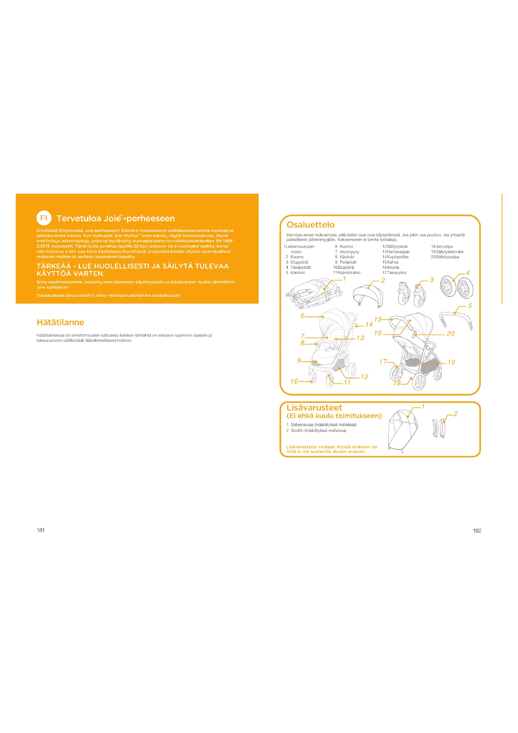 -perheeseen Onnittelut liittymisestä Joie-perheeseen! Olemme innoissamme osallistumisestamme matkaanne pienokaisenne kanssa. Kun matkustat Joie mytrax™ pron kanssa, käytät korkealaatuisia, täysin sertifioituja lastenvaunuja, jotka on hyväksytty eurooppalaisten turvallisuusstandardien EN 1888-2:2018 mukaisesti. Tämä tuote soveltuu lapsille 22 kg:n painoon tai 4-vuotiaaksi saakka, kumpi vain toteutuu ensin. Lue tämä käyttöopas huolellisesti ja noudata kaikkia ohjeita varmistaaksesi mukavan matkan ja parhaan suojauksen lapselle. TÄRKEÄÄ - LUE HUOLELLISESTI JA SÄILYTÄ TULEVAA KÄYTTÖÄ VARTEN. Siirry osoitteeseemme Joiebaby.com lataamaan käyttöoppaita ja tutustumaan muihin jännittäviin Joie-tuotteisiin!Tutustuaksesi takuutietoihin, siirry verkkosivustollemme joiebaby.com Hätätilanne Hätätilanteessa tai onnettomuuden sattuessa kaikkein tärkeintä on ensiavun saaminen lapselle ja hakeutuminen välittömästi lääketieteelliseen hoitoon.