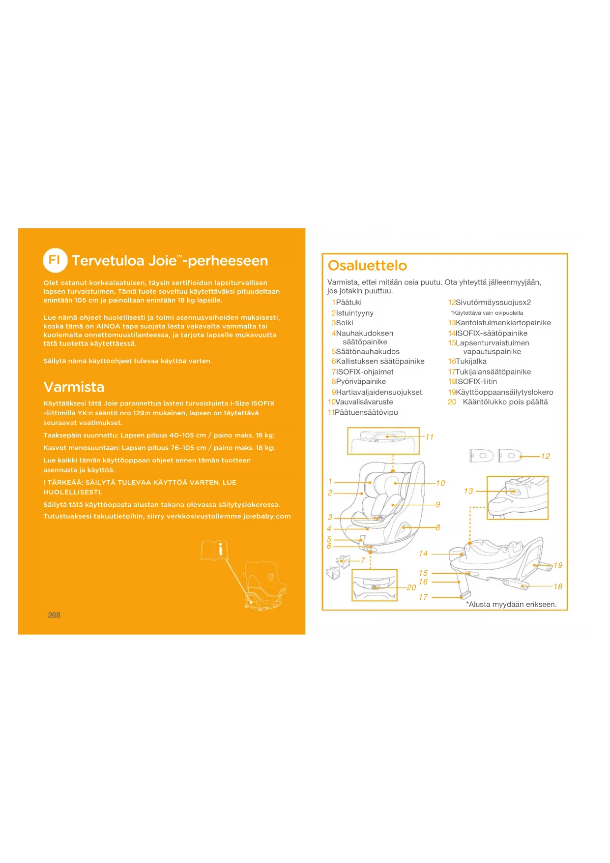-perheeseen Olet ostanut korkealaatuisen﹐ täysin sertifioidun lapsiturvallisen lapsen turvaistuimen. Tämä tuote soveltuu käytettäväksi pituudeltaan enintään 105 cm ja painoltaan enintään 18 kg lapsille.Lue nämä ohjeet huolellisesti ja toimi asennusvaiheiden mukaisesti﹐ koska tämä on AINOA tapa suojata lasta vakavalta vammalta tai kuolemalta onnettomuustilanteessa﹐ ja tarjota lapselle mukavuutta tätä tuotetta käytettäessä.Säilytä nämä käyttöohjeet tulevaa käyttöä varten. Varmista Käyttääksesi tätä Joie parannettua lasten turvaistuinta i-Size ISOFIX -liittimillä YK:n sääntö nro 129:n mukainen﹐ lapsen on täytettävä seuraavat vaatimukset.Taaksepäin suunnattu: Lapsen pituus 40–105 cm / paino maks. 18 kg;Kasvot menosuuntaan: Lapsen pituus 76–105 cm / paino maks. 18 kg;Lue kaikki tämän käyttöoppaan ohjeet ennen tämän tuotteen asennusta ja käyttöä.! TÄRKEÄÄ: SÄILYTÄ TULEVAA KÄYTTÖÄ VARTEN. LUE HUOLELLISESTI.Säilytä tätä käyttöopasta alustan takana olevassa säilytyslokerossa.Tutustuaksesi takuutietoihin﹐ siirry verkkosivustollemme joiebaby.com Osaluettelo 1 Päätuki 2 Istuintyyny 3 Solki 4 Nauhakudoksen säätöpainike 5 Säätönauhakudos 6 Kallistuksen säätöpainike 7 ISOFIX-ohjaimet 8 Pyörivä painike 9 Hartiavaljaiden suojukset10 Vauvalisävaruste11 Päätuen säätövipu12 Sivutörmäyssuojus x2 *Käytettävä vain ovipuolella13 Kantoistuimen kiertopainike14 ISOFIX-säätöpainike15 Lapsen turvaistuimen vapautuspainike16 Tukijalka17 Tukijalan säätöpainike18 ISOFIX-liitin19 Käyttöoppaan säilytyslokero20 Kääntölukko pois päältäVarmista, ettei mitään osia puutu. Ota yhteyttä jälleenmyyjään, jos jotakin puuttuu. *Alusta myydään erikseen.