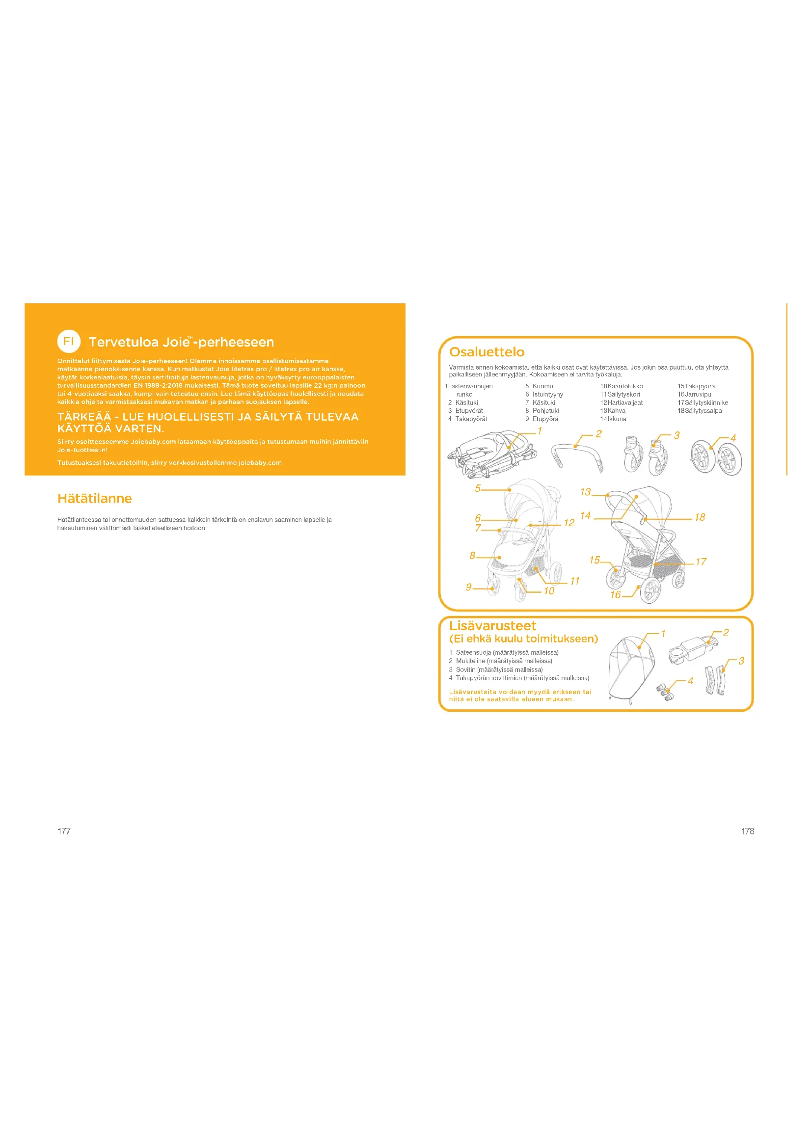 -perheeseen Onnittelut liittymisestä Joie-perheeseen! Olemme innoissamme osallistumisestamme matkaanne pienokaisenne kanssa. Kun matkustat Joie litetrax pro / litetrax pro air kanssa, käytät korkealaatuisia, täysin sertifioituja lastenvaunuja, jotka on hyväksytty eurooppalaisten turvallisuusstandardien EN 1888-2:2018 mukaisesti. Tämä tuote soveltuu lapsille 22 kg:n painoon tai 4-vuotiaaksi saakka, kumpi vain toteutuu ensin. Lue tämä käyttöopas huolellisesti ja noudata kaikkia ohjeita varmistaaksesi mukavan matkan ja parhaan suojauksen lapselle. TÄRKEÄÄ - LUE HUOLELLISESTI JA SÄILYTÄ TULEVAA KÄYTTÖÄ VARTEN. Siirry osoitteeseemme Joiebaby.com lataamaan käyttöoppaita ja tutustumaan muihin jännittäviin Joie-tuotteisiin!Tutustuaksesi takuutietoihin, siirry verkkosivustollemme joiebaby.com Hätätilanne Hätätilanteessa tai onnettomuuden sattuessa kaikkein tärkeintä on ensiavun saaminen lapselle ja hakeutuminen välittömästi lääketieteelliseen hoitoon. 1 Lastenvaunujen runko 2 Käsituki 3 Etupyörät 4 Takapyörät 5 Kuomu 6 Istuintyyny 7 Käsituki 8 Pohjetuki 9 Etupyörä 10 Kääntölukko 11 Säilytyskori 12 Hartiavaljaat 13 Kahva 14 Ikkuna 15 Takapyörä 16 Jarruvipu 17 Säilytyskiinnike 18 Säilytyssalpa Osaluettelo Varmista ennen kokoamista, että kaikki osat ovat käytettävissä. Jos jokin osa puuttuu, ota yhteyttä paikalliseen jälleenmyyjään. Kokoamiseen ei tarvita työkaluja. Lisävarusteet (Ei ehkä kuulu toimitukseen) 1 Sateensuoja (määrätyissä malleissa)2 Mukiteline (määrätyissä malleissa)3 Sovitin (määrätyissä malleissa)4 Takapyörän sovittimien (määrätyissä malleissa)Lisävarusteita voidaan myydä erikseen tai niitä ei ole saatavilla alueen mukaan.
