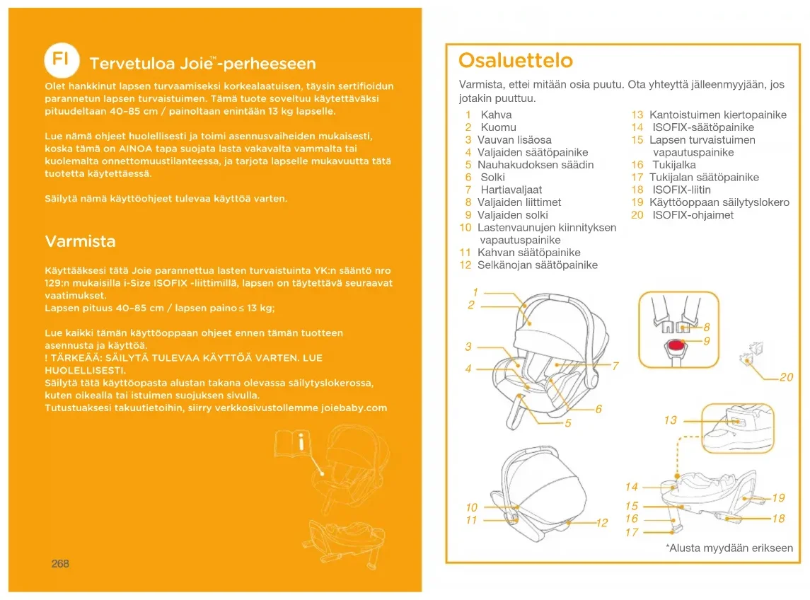 -perheeseen Olet hankkinut lapsen turvaamiseksi korkealaatuisen﹐ täysin sertifioidun parannetun lapsen turvaistuimen. Tämä tuote soveltuu käytettäväksi pituudeltaan 40–85 cm / painoltaan enintään 13 kg lapselle.Lue nämä ohjeet huolellisesti ja toimi asennusvaiheiden mukaisesti﹐ koska tämä on AINOA tapa suojata lasta vakavalta vammalta tai kuolemalta onnettomuustilanteessa﹐ ja tarjota lapselle mukavuutta tätä tuotetta käytettäessä.Säilytä nämä käyttöohjeet tulevaa käyttöä varten. Varmista Käyttääksesi tätä Joie parannettua lasten turvaistuinta YK:n sääntö nro 129:n mukaisilla i-Size ISOFIX -liittimillä﹐ lapsen on täytettävä seuraavat vaatimukset.Lapsen pituus 40–85 cm / lapsen paino 13 kg;Lue kaikki tämän käyttöoppaan ohjeet ennen tämän tuotteen asennusta ja käyttöä.! TÄRKEÄÄ: SÄILYTÄ TULEVAA KÄYTTÖÄ VARTEN. LUE HUOLELLISESTI.Säilytä tätä käyttöopasta alustan takana olevassa säilytyslokerossa﹐ kuten oikealla tai istuimen suojuksen sivulla.Tutustuaksesi takuutietoihin﹐ siirry verkkosivustollemme joiebaby.com Varmista, ettei mitään osia puutu. Ota yhteyttä jälleenmyyjään, jos jotakin puuttuu. 1 Kahva 2 Kuomu 3 Vauvan lisäosa 4 Valjaiden säätöpainike 5 Nauhakudoksen säädin 6 Solki 7 Hartiavaljaat 8 Valjaiden liittimet 9 Valjaiden solki 10 Lastenvaunujen kiinnityksen vapautuspainike 11 Kahvan säätöpainike 12 Selkänojan säätöpainike Osaluettelo 13 Kantoistuimen kiertopainike 14 ISOFIX-säätöpainike 15 Lapsen turvaistuimen vapautuspainike 16 Tukijalka 17 Tukijalan säätöpainike 18 ISOFIX-liitin 19 Käyttöoppaan säilytyslokero 20 ISOFIX-ohjaimet *Alusta myydään erikseen