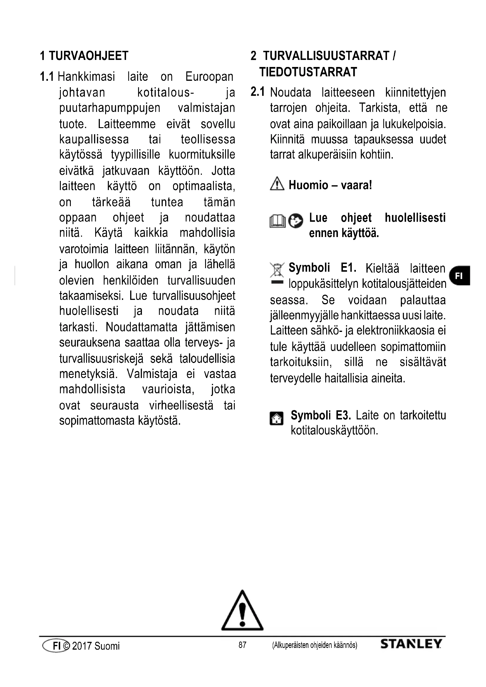 Noudata laitteeseen kiinnitettyjen tarrojen ohjeita. Tarkista, että ne ovat aina paikoillaan ja lukukelpoisia. Kiinnitä muussa tapauksessa uudet tarrat alkuperäisiin kohtiin. Huomio – vaara! Lue ohjeet huolellisesti ennen käyttöä. Symboli E1. Kieltää laitteen loppukäsittelyn kotitalousjätteiden seassa. Se voidaan palauttaa jälleenmyyjälle hankittaessa uusi laite. Laitteen sähkö- ja elektroniikkaosia ei tule käyttää uudelleen sopimattomiin tarkoituksiin, sillä ne sisältävät terveydelle haitallisia aineita. Symboli E3. Laite on tarkoitettu kotitalouskäyttöön.88 (Alkuperäisten ohjeiden käännös) FI © 2017 Suomi