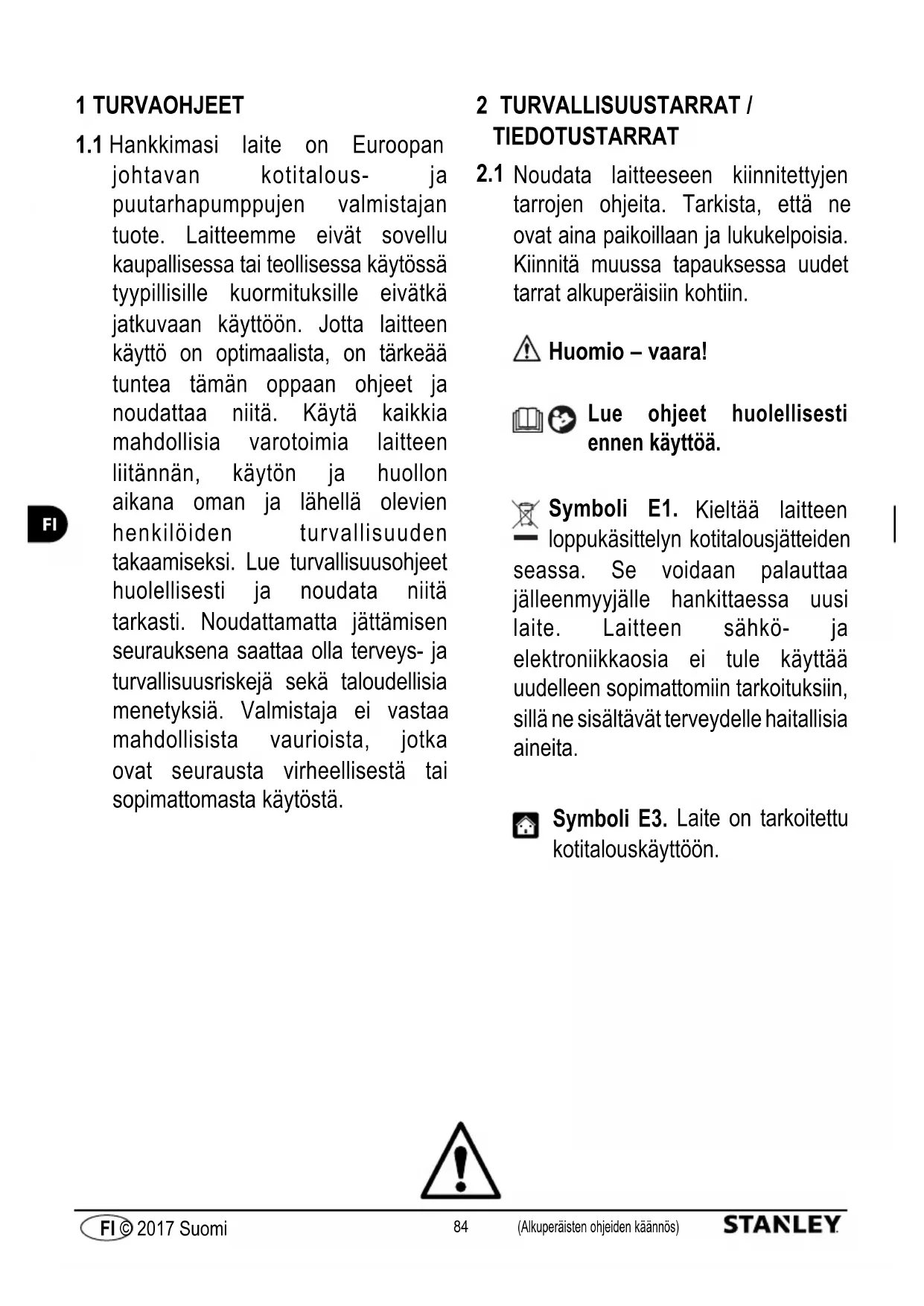Noudata laitteeseen kiinnitettyjen tarrojen ohjeita. Tarkista, että ne ovat aina paikoillaan ja lukukelpoisia. Kiinnitä muussa tapauksessa uudet tarrat alkuperäisiin kohtiin. Huomio – vaara! Lue ohjeet huolellisesti ennen käyttöä. Symboli E1. Kieltää laitteen loppukäsittelyn kotitalousjätteiden seassa. Se voidaan palauttaa jälleenmyyjälle hankittaessa uusi laite. Laitteen sähkö- ja elektroniikkaosia ei tule käyttää uudelleen sopimattomiin tarkoituksiin, sillä ne sisältävät terveydelle haitallisia aineita. Symboli E3. Laite on tarkoitettu kotitalouskäyttöön.85 (Alkuperäisten ohjeiden käännös) FI © 2017 Suomi