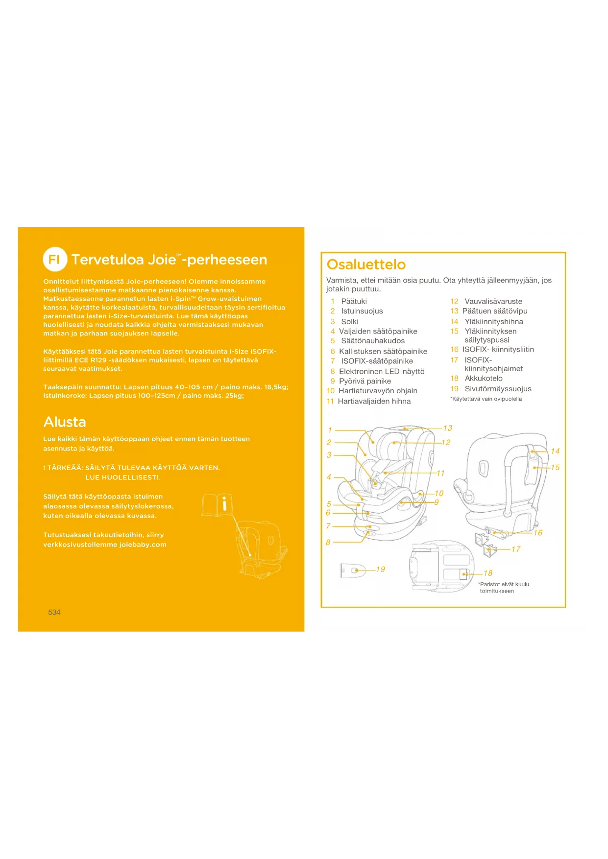 -perheeseen Onnittelut liittymisestä Joie-perheeseen! Olemme innoissamme osallistumisestamme matkaanne pienokaisenne kanssa. Matkustaessanne parannetun lasten i-Spin™ Grow-uvaistuimen kanssa, käytätte korkealaatuista, turvallisuudeltaan täysin sertifioitua parannettua lasten i-Size-turvaistuinta. Lue tämä käyttöopas huolellisesti ja noudata kaikkia ohjeita varmistaaksesi mukavan matkan ja parhaan suojauksen lapselle.Käyttääksesi tätä Joie parannettua lasten turvaistuinta i-Size ISOFIX-liittimillä ECE R129 -säädöksen mukaisesti, lapsen on täytettävä seuraavat vaatimukset.Taaksepäin suunnattu: Lapsen pituus 40–105 cm / paino maks. 18,5kg;Istuinkoroke: Lapsen pituus 100–125cm / paino maks. 25kg; Alusta Lue kaikki tämän käyttöoppaan ohjeet ennen tämän tuotteen asennusta ja käyttöä.! TÄRKEÄÄ: SÄILYTÄ TULEVAA KÄYTTÖÄ VARTEN.LUE HUOLELLISESTI.Säilytä tätä käyttöopasta istuimen alaosassa olevassa säilytyslokerossa, kuten oikealla olevassa kuvassa.Tutustuaksesi takuutietoihin, siirry verkkosivustollemme joiebaby.com Osaluettelo 1 Päätuki 2 Istuinsuojus 3 Solki 4 Valjaiden säätöpainike 5 Säätönauhakudos 6 Kallistuksen säätöpainike 7 ISOFIX-säätöpainike 8 Elektroninen LED-näyttö 9 Pyörivä painike10 Hartiaturvavyön ohjain11 Hartiavaljaiden hihna12 Vauvalisävaruste13 Päätuen säätövipu14 Yläkiinnityshihna15 Yläkiinnityksen säilytyspussi16 ISOFIX- kiinnitysliitin17 ISOFIX-kiinnitysohjaimet18 Akkukotelo19 SivutörmäyssuojusVarmista, ettei mitään osia puutu. Ota yhteyttä jälleenmyyjään, jos jotakin puuttuu.