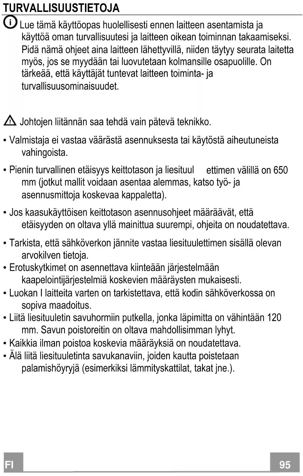 - Tilassa täytyy olla asianmukainen tuuletus kun liesituuletinta käytetään samanaikaisesti kaasulla tai muilla polttoaineilla toimivien laitteiden kanssa (ei koske laitteita, jotka poistavat tilaan vain ilmaa).
