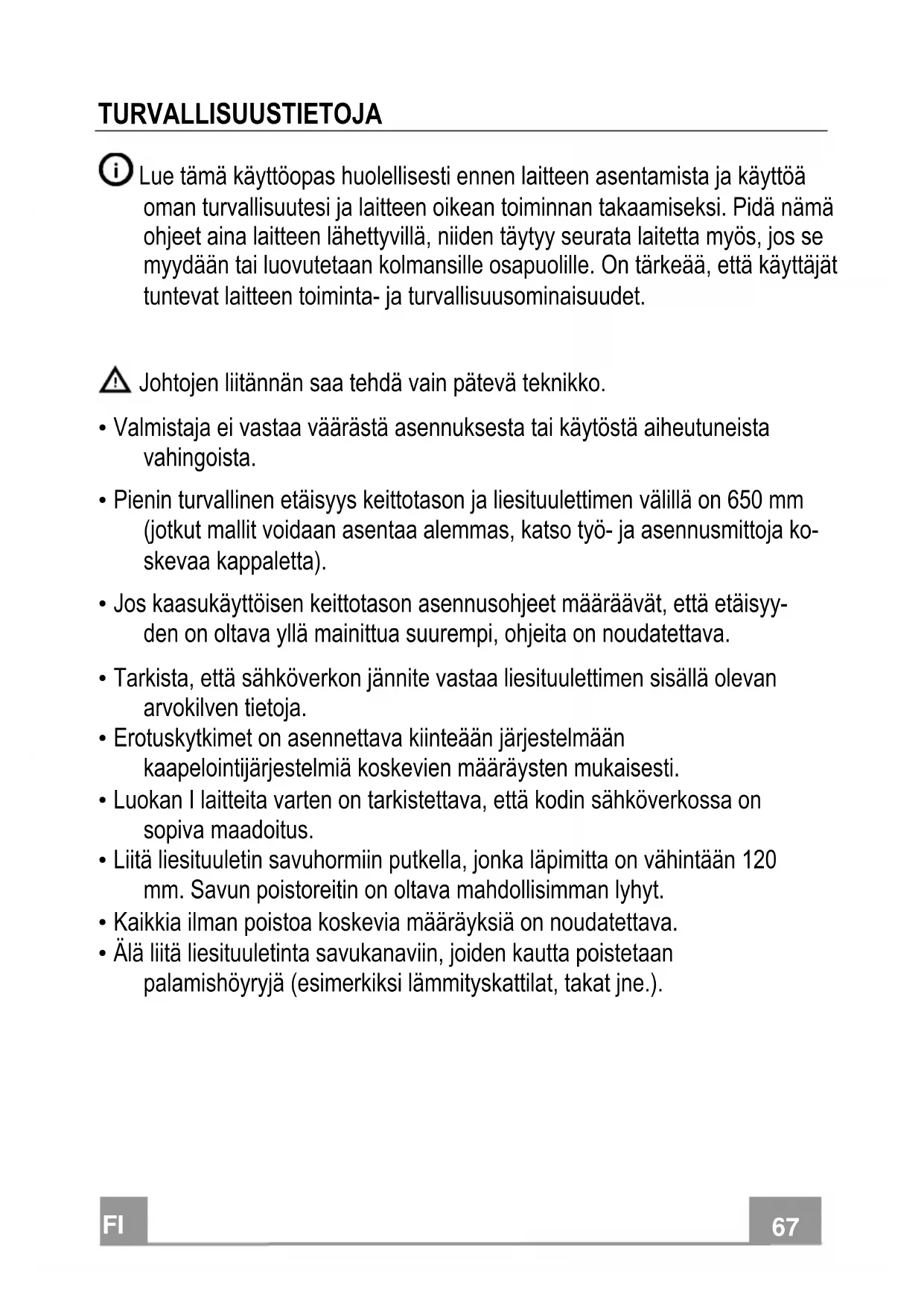- Älä liitä liesituuletinta savukanaviin, joiden kautta poistetaan palamishöyryjä (esimerkiksi lämmityskattilat, takat jne.).FI