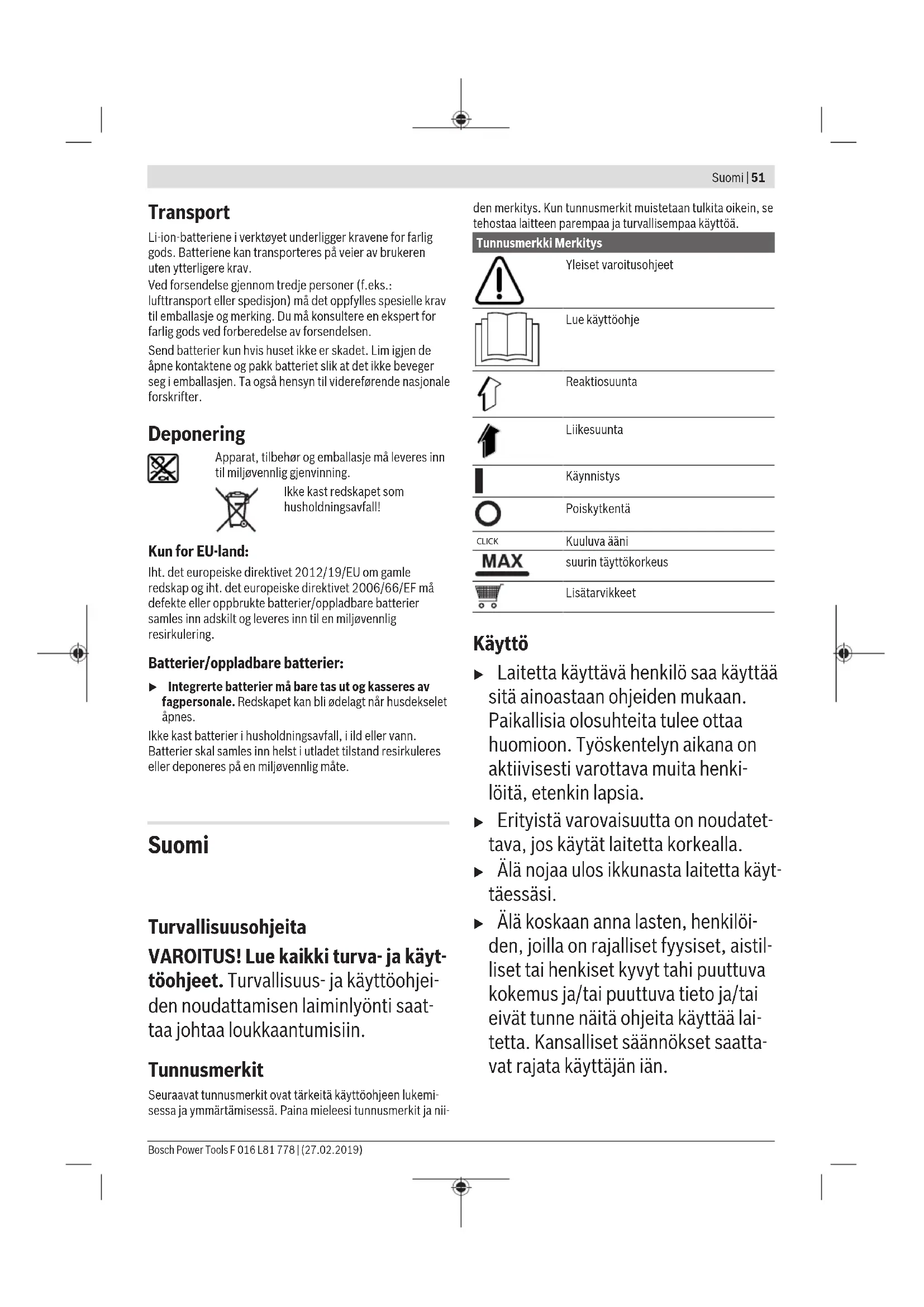 Rengjøre mikrofiberklut L 166 Tilbehør M 166 Bosch Power Tools F 016 L81 778 | (27.02.2019)50 | Norsk Igangsetting Merk: Batteriet er delvis ladet ved levering. For å sikre full effekt fra batteriet, må du lade det fullstendig opp i ladeapparatet før førstegangs bruk. Batteriet kan lades opp til enhver tid uten at levetiden forkortes. Det skader ikke batteriet å avbryte oppladingen. Batteriet er beskyttet mot total utladning. Redskapet stanser når batteriet er utladet. Opplading av batteriet (se bilde A og C) Merknad: Micro-USB-kontakten (20) for tilkobling av Micro- USB-kabelen (17) befinner seg i grepet. Når batteriladingen er lav, blinker batteri-ladeindikatoren (4) grønt. Batteriet skal lades opp når batteri-ladeindikatoren (4) blinker rødt. Slå redskapet av og lad opp batteriet. Forbind redskapet ved hjelp av den medleverte Micro-USB- kabelen (17) med ladeapparatet (18). Sett ladeapparatet (18) inn i stikkontakten. Ladingen starter. Under oppladingen blir maskinens grep oppvarmet. Dette er normalt. Batteri-ladeindikatoren (4) lyser kontinuerlig rødt under oppladingen. Når batteriet er ladet opp fullstendig, lyser batteri-ladeindikatoren (4) kontinuerlig grønt. Koble ladeapparatet fra strømnettet når oppladingen er avsluttet. Følg informasjonene om kassering. Feilsøking Symptomer Mulig årsak Løsning Redskap starter ikke Utladet batteri Lad opp batteri For kaldt/for varmt batteri Varm opp/avkjøl batteriet Innskrenket eller overhodet ingen sugeeffekt Sugehode blokkert Fjern blokkering i sugehodet Lås er borte Erstatt lås Redskap kobler ut For kaldt/for varmt batteri Varm opp/avkjøl batteriet Sugehode blokkert Fjern blokkering i sugehodet Vann renner ut av redskapet Sprayapplikator er ikke riktig montert Monter sprayapplikator riktig Batteri lader ikke Ladeapparat ikke riktig tilkoblet Kontroller ladeapparat og USB-kabelforbindelser For kaldt/for varmt batteri Varm opp/avkjøl batteriet Striper på vinduet Viskerblad skadet Skift ut viskerblad (tilbehør) Brukt for mye kraft Bruk mindre kraft Brukt for liten kraft Bruk mer kraft Vedlikehold og rengjøring (se bilde J−K) Rengjør redskapet alltid grundig etter bruk. Fjern sugehode fra hovedlegeme og skyll dette. Mens du fjerner sugehodet (2) fra redskapet, fyll spillvanntanken (7) med rent, varmt vann gjennom åpningen i sugehodet inntil max-linjen. IKKE fyll spillvanntanken (7) gjennom tømmeåpningen. Rist redskapet og hell vannet ut gjennom låsen (8). Pleie sugehode Beskytt sugehodet mot skader under lagringen. Unngå at papir eller papp berører viskerbladet, plasten kan derved bli skadet. På plasten kan det sees flekker og linjer. Detter normalt og har ingen innflytelse på rengjøringseffekten. Tekstiler Mikrofiberkluter: 67% polyester, 14% polyamid, 19% polypropylen Kundeservice og kundeveiledning www.bosch-pt.de Ved alle forespørsler og reservedelsbestillinger må du oppgi det 10‑sifrede produktnummeret som er angitt på produktets typeskilt. Norsk Robert Bosch AS Postboks 350 1402 Ski Tel.: 64 87 89 50 Faks: 64 87 89 55 F 016 L81 778 | (27.02.2019) Bosch Power ToolsSuomi | 51 Transport Li-ion-batteriene i verktøyet underligger kravene for farlig gods. Batteriene kan transporteres på veier av brukeren uten ytterligere krav. Ved forsendelse gjennom tredje personer (f.eks.: lufttransport eller spedisjon) må det oppfylles spesielle krav til emballasje og merking. Du må konsultere en ekspert for farlig gods ved forberedelse av forsendelsen. Send batterier kun hvis huset ikke er skadet. Lim igjen de åpne kontaktene og pakk batteriet slik at det ikke beveger seg i emballasjen. Ta også hensyn til videreførende nasjonale forskrifter. Deponering Apparat, tilbehør og emballasje må leveres inn til miljøvennlig gjenvinning. Ikke kast redskapet som husholdningsavfall! Kun for EU‑land: Iht. det europeiske direktivet 2012/19/EU om gamle redskap og iht. det europeiske direktivet 2006/66/EF må defekte eller oppbrukte batterier/oppladbare batterier samles inn adskilt og leveres inn til en miljøvennlig resirkulering. Batterier/oppladbare batterier: u Integrerte batterier må bare tas ut og kasseres av fagpersonale. Redskapet kan bli ødelagt når husdekselet åpnes. Ikke kast batterier i husholdningsavfall, i ild eller vann. Batterier skal samles inn helst i utladet tilstand resirkuleres eller deponeres på en miljøvennlig måte. Suomi Turvallisuusohjeita VAROITUS! Lue kaikki turva- ja käyt- töohjeet. Turvallisuus- ja käyttöohjei- den noudattamisen laiminlyönti saat- taa johtaa loukkaantumisiin. Tunnusmerkit Seuraavat tunnusmerkit ovat tärkeitä käyttöohjeen lukemi- sessa ja ymmärtämisessä. Paina mieleesi tunnusmerkit ja nii- den merkitys. Kun tunnusmerkit muistetaan tulkita oikein, se tehostaa laitteen parempaa ja turvallisempaa käyttöä. Tunnusmerkki Merkitys Yleiset varoitusohjeet Lue käyttöohje Reaktiosuunta Liikesuunta Käynnistys Poiskytkentä CLICK! Kuuluva ääni suurin täyttökorkeus Lisätarvikkeet Käyttö u Laitetta käyttävä henkilö saa käyttää sitä ainoastaan ohjeiden mukaan. Paikallisia olosuhteita tulee ottaa huomioon. Työskentelyn aikana on aktiivisesti varottava muita henki- löitä, etenkin lapsia. u Erityistä varovaisuutta on noudatet- tava, jos käytät laitetta korkealla. u Älä nojaa ulos ikkunasta laitetta käyt- täessäsi. u Älä koskaan anna lasten, henkilöi- den, joilla on rajalliset fyysiset, aistil- liset tai henkiset kyvyt tahi puuttuva kokemus ja/tai puuttuva tieto ja/tai eivät tunne näitä ohjeita käyttää lai- tetta. Kansalliset säännökset saatta- vat rajata käyttäjän iän. Bosch Power Tools F 016 L81 778 | (27.02.2019)52 | Suomi u Lapsia tulee valvoa ja varmistaa, että he eivät leiki laitteen kanssa. u Käyttäjä on vastuussa työalueella olevista sivullisista. Käyttö u Älä suuntaa laitteesta tulevaa suih- kua lähellä olevia henkilöitä tai eläi- miä kohti. u Älä suuntaa suihkutuslaitteesta tule- vaa suihkua sähkö