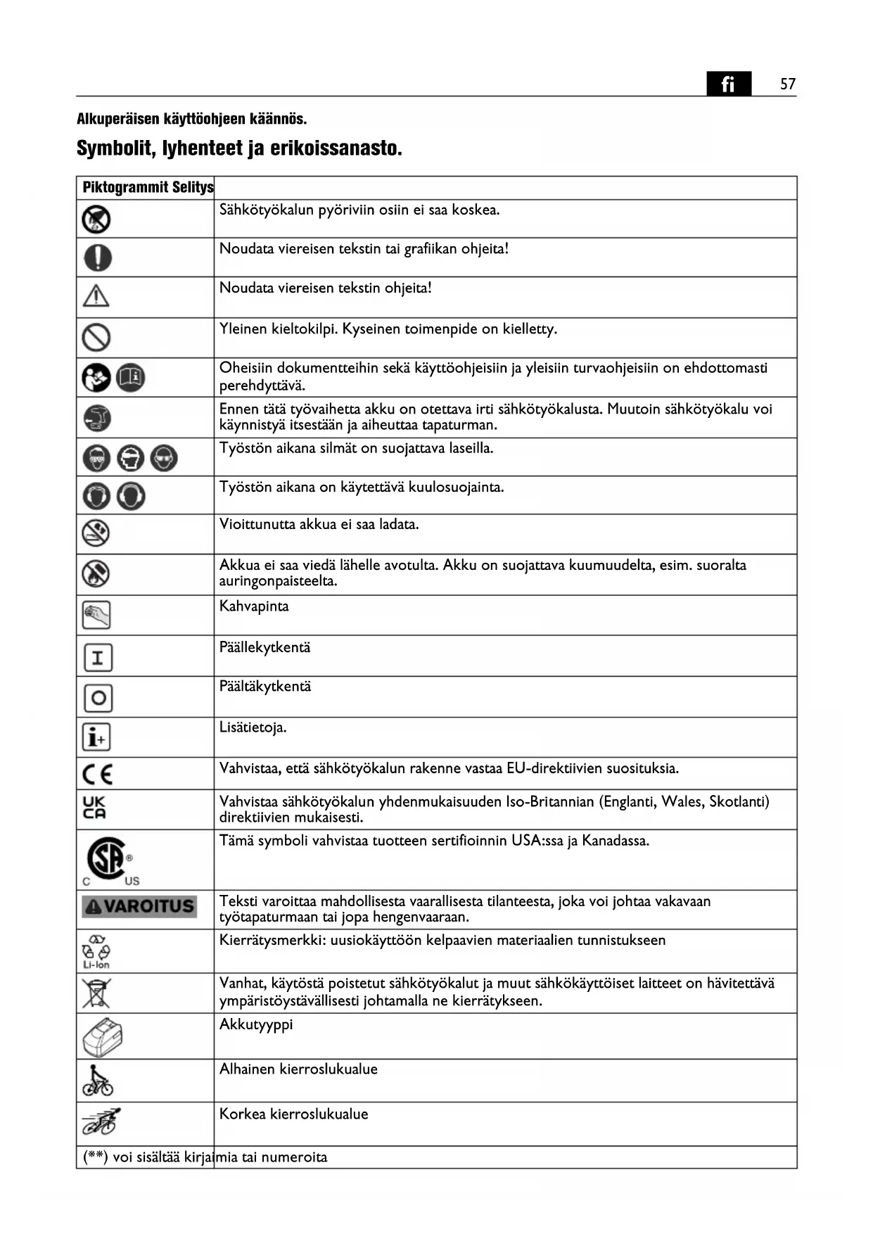 Alkuperäisen käyttöohjeen käännös. Symbolit, lyhenteet ja erikoissanasto. Piktogrammit Selitys Sähkötyökalun pyöriviin osiin ei saa koskea. Noudata viereisen tekstin tai grafiikan ohjeita! Noudata viereisen tekstin ohjeita! Yleinen kieltokilpi. Kyseinen toimenpide on kielletty. Oheisiin dokumentteihin sekä käyttöohjeisiin ja yleisiin turvaohjeisiin on ehdottomasti perehdyttävä. Ennen tätä työvaihetta akku on otettava irti sähkötyökalusta. Muutoin sähkötyökalu voi käynnistyä itsestään ja aiheuttaa tapaturman. Työstön aikana silmät on suojattava laseilla. Työstön aikana on käytettävä kuulosuojainta. Vioittunutta akkua ei saa ladata. Akkua ei saa viedä lähelle avotulta. Akku on suojattava kuumuudelta, esim. suoralta auringonpaisteelta. Kahvapinta Päällekytkentä Päältäkytkentä Lisätietoja. Vahvistaa, että sähkötyökalun rakenne vastaa EU-direktiivien suosituksia. Vahvistaa sähkötyökalun yhdenmukaisuuden Iso-Britannian (Englanti, Wales, Skotlanti) direktiivien mukaisesti. Tämä symboli vahvistaa tuotteen sertifioinnin USA:ssa ja Kanadassa. Teksti varoittaa mahdollisesta vaarallisesta tilanteesta, joka voi johtaa vakavaan työtapaturmaan tai jopa hengenvaaraan. Kierrätysmerkki: uusiokäyttöön kelpaavien materiaalien tunnistukseen Vanhat, käytöstä poistetut sähkötyökalut ja muut sähkökäyttöiset laitteet on hävitettävä ympäristöystävällisesti johtamalla ne kierrätykseen. Akkutyyppi Alhainen kierroslukualue Korkea kierroslukualue (**) voi sisältää kirjaimia tai numeroita58