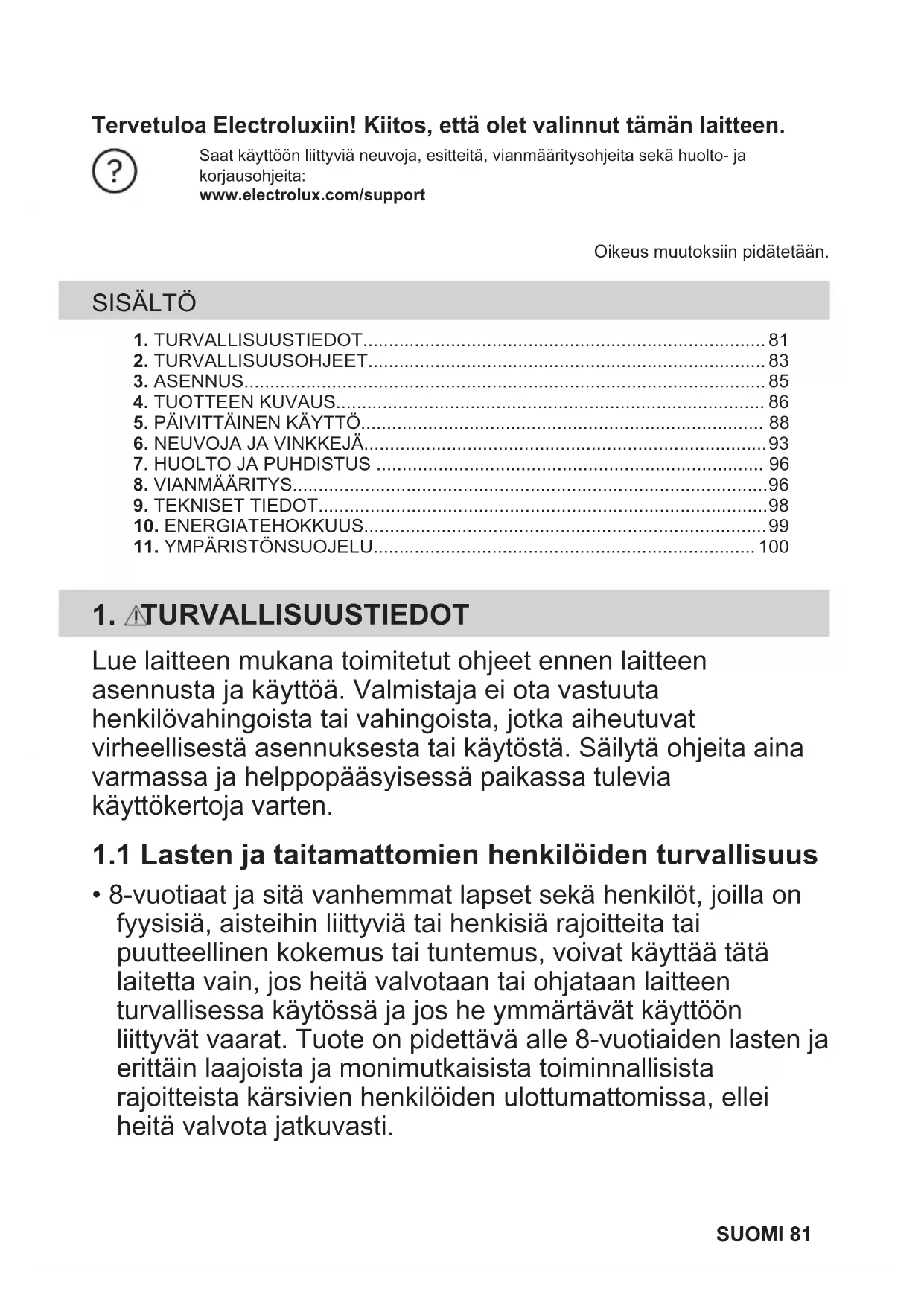 Recycle materials with the symbol . Put the packaging in relevant containers to recycle it. Help protect the environment and human health by recycling waste of electrical and electronic appliances. Do not dispose of appliances marked with the symbol with the household waste. Return the product to your local recycling facility or contact your municipal office. 80 ENGLISHTervetuloa Electroluxiin! Kiitos, että olet valinnut tämän laitteen. Table title.Saat käyttöön liittyviä neuvoja, esitteitä, vianmääritysohjeita sekä huolto- jakorjausohjeita:www.electrolux.com/supportOikeus muutoksiin pidätetään. SISÄLTÖ