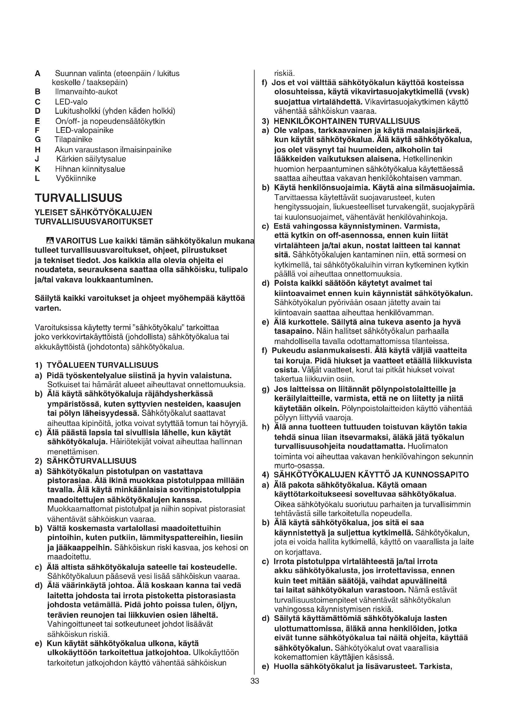a) Älä pakota sähkötyökalua. Käytä omaan käyttötarkoitukseesi soveltuvaa sähkötyökalua. Oikea sähkötyökalu suoriutuu parhaiten ja turvallisimmin tehtävästä sille tarkoitetulla nopeudella. b) Älä käytä sähkötyökalua, jos sitä ei saa käynnistettyä ja suljettua kytkimellä. Sähkötyökalun, jota ei voida hallita kytkimellä, käyttö on vaarallista ja laite on korjattava. c) Irrota pistotulppa virtalähteestä ja/tai irrota akku sähkötyökalusta, jos irrotettavissa, ennen kuin teet mitään säätöjä, vaihdat apuvälineitä tai laitat sähkötyökalun varastoon. Nämä estävät turvallisuustoimenpiteet vähentävät sähkötyökalun vahingossa käynnistymisen riskiä. d) Säilytä käyttämättömiä sähkötyökaluja lasten ulottumattomissa, äläkä anna henkilöiden, jotka eivät tunne sähkötyökalua tai näitä ohjeita, käyttää sähkötyökalun. Sähkötyökalut ovat vaarallisia kokemattomien käyttäjien käsissä. e) Huolla sähkötyökalut ja lisävarusteet. Tarkista, A Suunnan valinta (eteenpäin / lukitus keskelle / taaksepäin) B Ilmanvaihto-aukot C LED-valo D Lukitusholkki (yhden käden holkki) E On/o- ja nopeudensäätökytkin F LED-valopainike G Tilapainike H Akun varaustason ilmaisinpainike