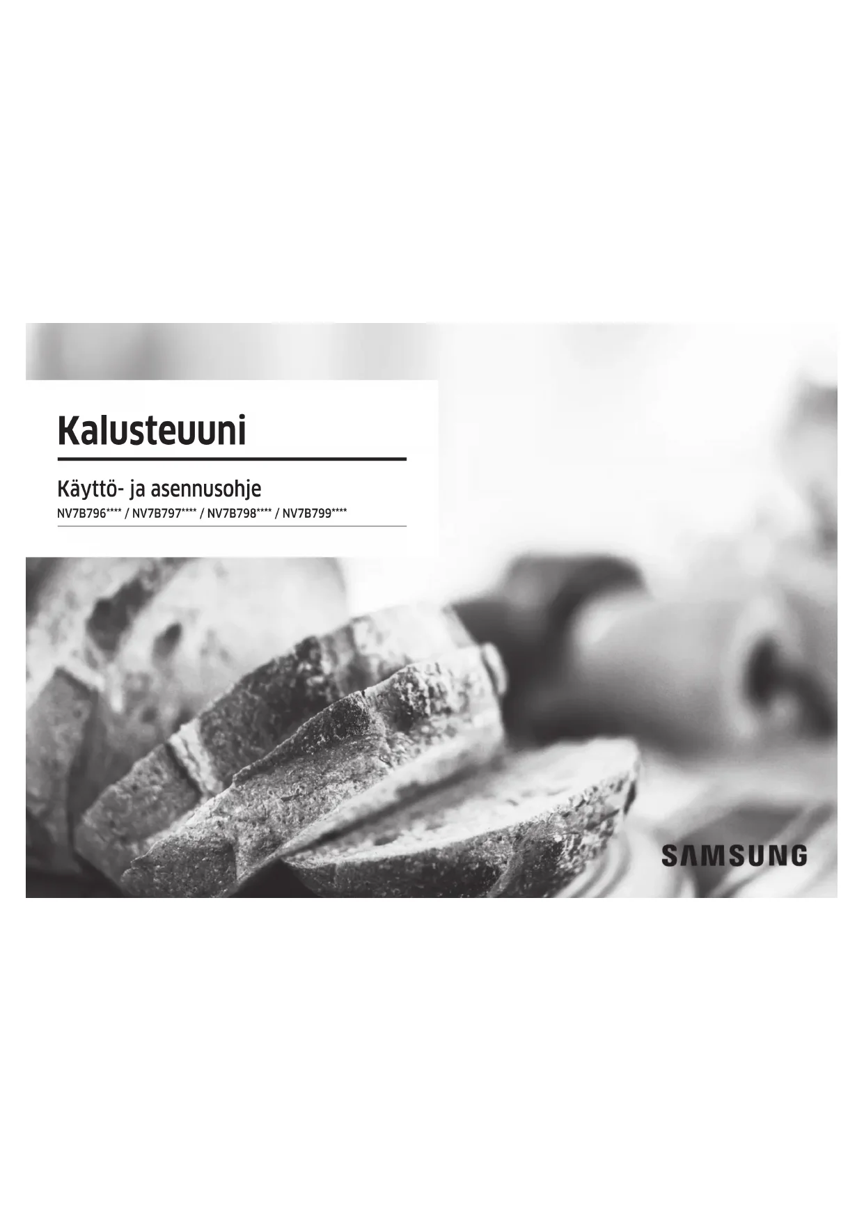 - (opłata według taryfy operatora) http://www.samsung.com/pl/support/ ROMANIA 0800872678 - Apel gratuit *8000 - Apel tarifat în reţea Program Call Center Luni - Vineri: 9 AM - 6 PM www.samsung.com/ro/support SERBIA 011 321 6899 www.samsung.com/rs/support SLOVAKIA 0800 - SAMSUNG (0800-726 786) www.samsung.com/sk/support LITHUANIA 8-800-77777 www.samsung.com/lt/support LATVIA 8000-7267 www.samsung.com/lv/support ESTONIA 800-7267 www.samsung.com/ee/support SLOVENIA 080 697 267 (brezplačna številka) www.samsung.com/si/support KOSOVO 038 40 30 90 www.samsung.com/support HAR DU SPØRSMÅL ELLER KOMMENTARER? DG68-01472A-01Kalusteuuni Käyttö- ja asennusohje NV7B796**** / NV7B797**** / NV7B798**** / NV7B799****2 Suomi Sisällysluettelo Terveellinen kypsytys 30 Automaattinen kypsennys 30 Ajastin 31 Puhdistus 32 Asetukset 34 Lukitus 35 Älykkäät valmistustoiminnot 36 Manuaalinen ruoanlaitto 36 Automaattiset kypsennysohjelmat 44 Erityistoiminto 52 Koekeittiössä testatut ruuat 53 Kokoelma yleisimpiä Auto cook -reseptejä 54 Huolto 57 Puhdistus 57 Luukun avaaminen manuaalisesti 60 Vaihtaminen 61 Vianmääritys 62 Tarkistettavat kohdat 62 Näyttökoodit 64 Tekniset tiedot 65 Liite 66 Laitteen tekniset tiedot 66 Avoimen lähdekoodin ilmoitus 67 Sisällysluettelo Oppaan käyttö 3 Tässä käyttöoppaassa käytetään seuraavia kuvasymboleja 3 Turvallisuusohjeet 3 Tärkeitä turvallisuusohjeita 3 Tuotteen turvallinen hävittäminen (elektroniikka ja sähkölaitteet) 6 Automaattinen energiansäästötoiminto 6 Asentaminen 7 Pakkauksen sisältö 7 Virtaliitäntä 8 Kaappikiinnitys 8 Alkuvalmistelut 11 Käyttöpaneeli 11 Alkuasetukset 12 Uuden uunin haju 13 Älykäs turvamekanismi 13 Höyrysäiliön kokoaminen 13 Lisävarusteet 14 Vesisäiliö 15 Automaattinen luukku 16 Toiminnot 16 Uunitilat 16 Höyryavusteiset tilat 19 Dual Cook-tila 21 Air Fry 23 Air Sous Vide 25 Ruoanvalmistus paistomittarilla 27 Erityistoiminto 28Suomi 3 Oppaan käyttö Turvallisuusohjeet Tämän uunin saa asentaa vain valtuutettu sähköasentaja. Asentaja on vastuussa laitteen kytkemisestä verkkovirtaan noudattaen asianmukaisia turvallisuussuosituksia.
