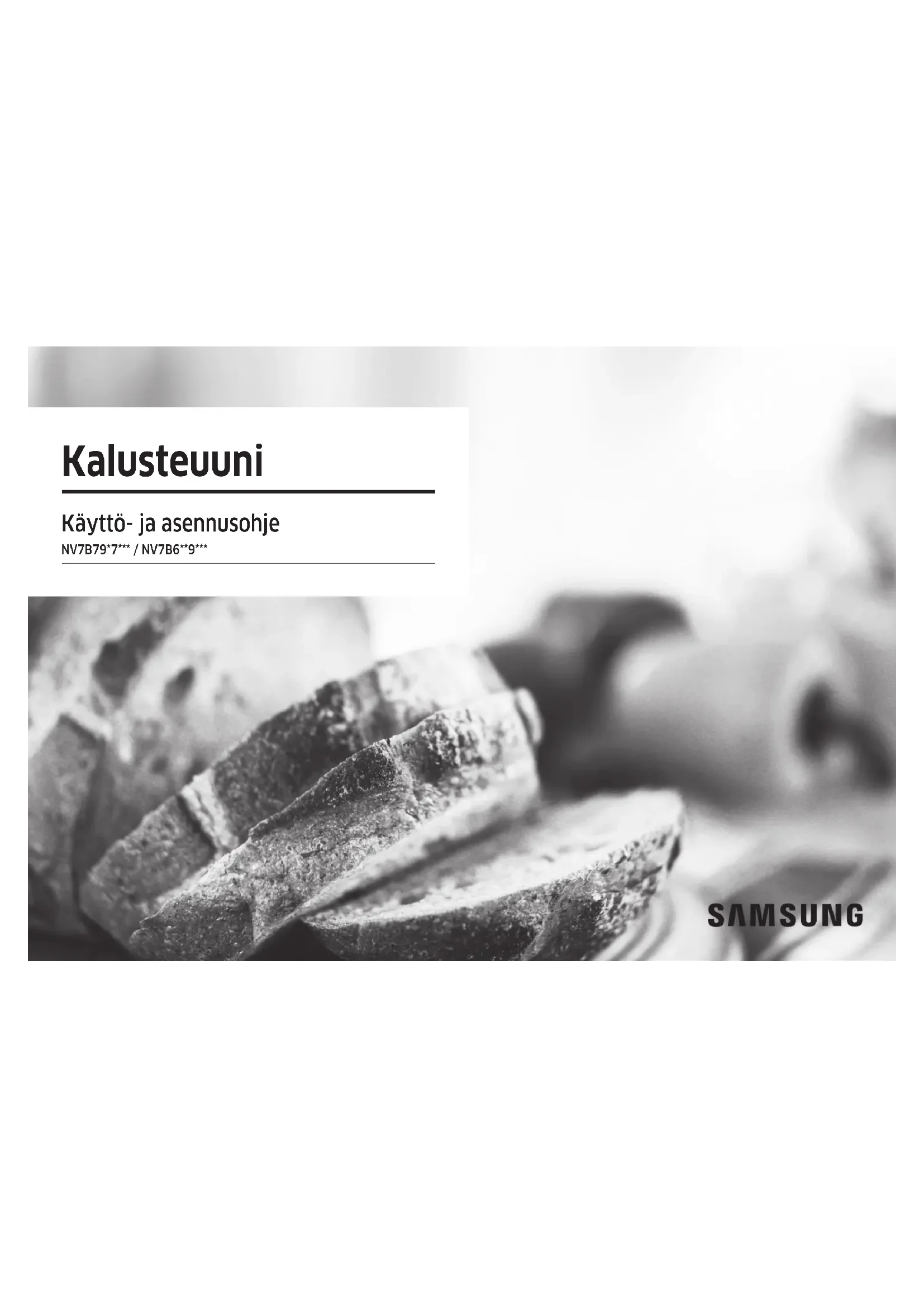 - (opłata według taryfy operatora) http://www.samsung.com/pl/support/ ROMANIA 0800872678 - Apel gratuit *8000 - Apel tarifat în reţea Program Call Center Luni - Vineri: 9 AM - 6 PM www.samsung.com/ro/support SERBIA 011 321 6899 www.samsung.com/rs/support SLOVAKIA 0800 - SAMSUNG (0800-726 786) www.samsung.com/sk/support LITHUANIA 8-800-77777 www.samsung.com/lt/support LATVIA 8000-7267 www.samsung.com/lv/support ESTONIA 800-7267 www.samsung.com/ee/support SLOVENIA 080 697 267 (brezplačna številka) www.samsung.com/si/support KOSOVO 038 40 30 90 www.samsung.com/support HAR DU SPØRSMÅL ELLER KOMMENTARER? DG68-01471A-01Kalusteuuni Käyttö- ja asennusohje NV7B79*7*** / NV7B6**9***2 Suomi Sisällysluettelo Air Sous Vide 26 Ruoanvalmistus paistomittarilla 28 Erityistoiminto 29 Terveellinen kypsytys 31 Automaattinen kypsennys 31 Ajastin 32 Puhdistus 34 Asetukset 36 Lukitus 37 Älykkäät valmistustoiminnot 38 Manuaalinen ruoanlaitto 38 Automaattiset kypsennysohjelmat 46 Erityistoiminto 57 Koekeittiössä testatut ruuat 58 Kokoelma yleisimpiä Auto cook -reseptejä 60 Huolto 62 Puhdistus 62 Luukun avaaminen manuaalisesti 65 Vaihtaminen 66 Vianmääritys 67 Tarkistettavat kohdat 67 Näyttökoodit 69 Tekniset tiedot 70 Liite 71 Laitteen tekniset tiedot 71 Avoimen lähdekoodin ilmoitus 72 Sisällysluettelo Oppaan käyttö 3 Tässä käyttöoppaassa käytetään seuraavia kuvasymboleja 3 Turvallisuusohjeet 3 Tärkeitä turvallisuusohjeita 3 Tuotteen turvallinen hävittäminen (elektroniikka ja sähkölaitteet) 6 Automaattinen energiansäästötoiminto 6 Asentaminen 7 Pakkauksen sisältö 7 Virtaliitäntä 8 Kaappikiinnitys 8 Alkuvalmistelut 11 Käyttöpaneeli 11 Alkuasetukset 12 Uuden uunin haju 13 Älykäs turvamekanismi 13 Pehmeästi sulkeutuva luukku (hellävarainen, turvallinen ja äänetön) 13 Höyrysäiliön kokoaminen 14 Lisävarusteet 14 Joustava luukku 16 Vesisäiliö 17 Mekaaninen lukko 17 Kamera ja automaattinen luukku 18 Toiminnot 18 Uunitilat 18 Höyryavusteiset tilat 21 Dual Cook-tila 23 Air Fry 24Suomi 3 Oppaan käyttö Turvallisuusohjeet Tämän uunin saa asentaa vain valtuutettu sähköasentaja. Asentaja on vastuussa laitteen kytkemisestä verkkovirtaan noudattaen asianmukaisia turvallisuussuosituksia.