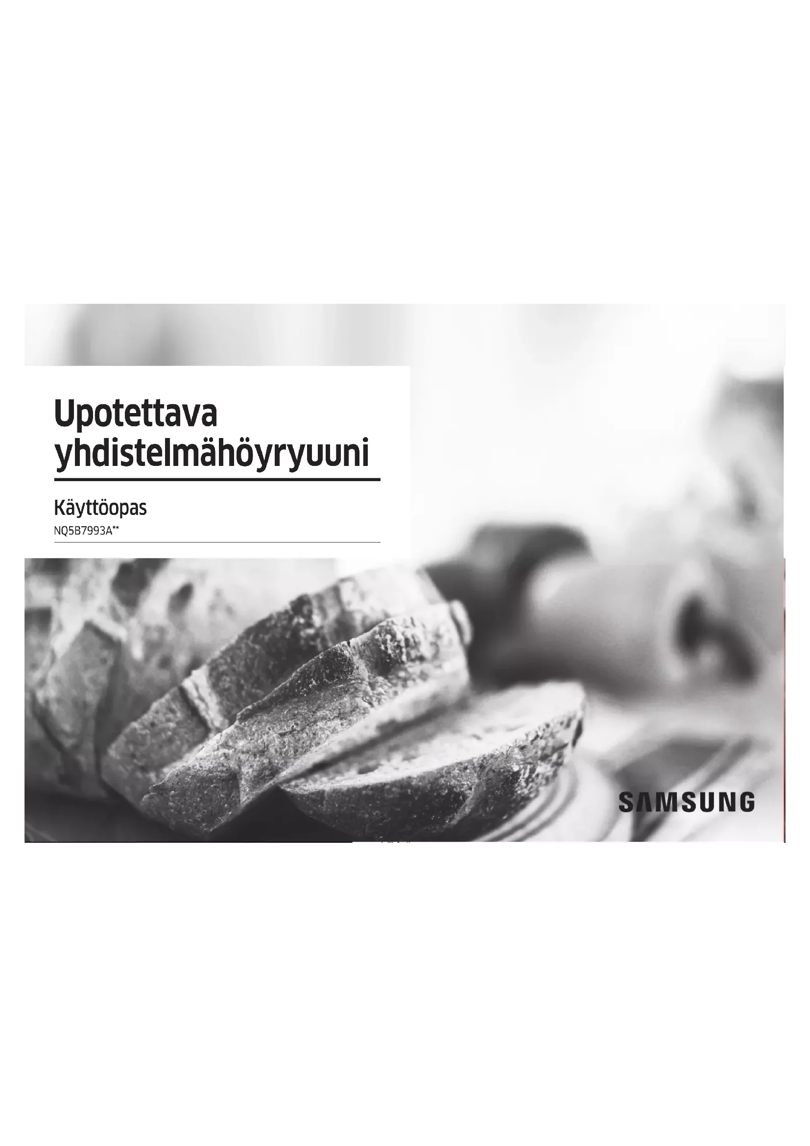 Chamada para a rede fixa nacional Dias úteis das 9h às 20h www.samsung.com/pt/support SPAIN 91 175 00 15 www.samsung.com/es/support SWEDEN 0771-400 300 www.samsung.com/se/support SWITZERLAND 0800 726 786 www.samsung.com/ch/support (German) www.samsung.com/ch_fr/support (French) UK 0333 000 0333 www.samsung.com/uk/support IRELAND (EIRE) 0818 717100 www.samsung.com/ie/support DG68-01432A-02Upotettava yhdistelmähöyryuuni Käyttöopas NQ5B7993A**2 Suomi Sisällysluettelo Sisällysluettelo Tämän käyttöoppaan käyttäminen 3 Tässä käyttöoppaassa käytetään seuraavia symboleja 3 Turvallisuusohjeet 3 Tärkeitä turvallisuustietoja 3 Tuotteen turvallinen hävittäminen (elektroniikka ja sähkölaitteet) 6 Asentaminen 7 Pakkauksen sisältö 7 Asennusohjeet 8 Asentaminen kaappiin 8 Ennen kuin aloitat 11 Käyttöpaneeli 11 Alkuasetukset 11 Sivutelineet 12 Vesisäiliö 13 Automaattiovi 14 Toiminnot 14 Uunitilat 14 Höyryavusteiset toiminnot 16 Erityistoiminto 18 Automaattinen kypsennys 19 Automaattinen sulatus 20 Ajastin 21 Puhdistus 21 Asetukset 23 Lukitus 24 Älykkäät valmistustoiminnot 25 Automaattinen kypsennys 25 Automaattinen sulatus 29 Manuaalinen valmistus 30 Koeastiat 36 Huolto 37 Puhdistaminen 37 Oven avaaminen manuaalisesti 38 Vaihtaminen (korjaaminen) 39 Pitkää käyttämättömänä seisottamista edeltävät suojatoimet 39 Vianmääritys 39 Tarkistettavat kohdat 39 Näyttökoodit 43 Tekniset tiedot 43 Liite 44 Tuotetietolomake 44 Avoimen lähdekoodin ilmoitus 45Suomi 3 Tämän käyttöoppaan käyttäminen Tämän käyttöoppaan käyttäminen Kiitos, että valitsit SAMSUNGin sisäänrakennetun uunin. Tämä käyttöopas sisältää tärkeitä turvallisuustietoja ja ohjeita, joiden tarkoituksena on auttaa sinua laitteen käytössä ja huollossa. Lue tämä käyttöopas ennen uunin käyttöä ja säilytä tämä kirja myöhempää käyttöä varten. Tässä käyttöoppaassa käytetään seuraavia symboleja VAROITUS Vaara tai vaarallinen toiminta, joka saattaa aiheuttaa vakavia henkilökohtaisia vammoja ja/tai omaisuusvahinkoja. HUOMIO Vaara tai vaarallinen toiminta, joka saattaa aiheuttaa henkilökohtaisia vammoja ja/tai omaisuusvahinkoja. HUOM. Hyödyllisiä vinkkejä, suosituksia tai tietoja, jotka auttavat käyttäjiä tuotteen käsittelyssä. Turvallisuusohjeet Tämän uunin saa asentaa vain valtuutettu sähköasentaja. Asentaja on vastuussa laitteen kytkemisestä verkkovirtaan noudattaen asianmukaisia turvallisuussuosituksia. Tärkeitä turvallisuustietoja VAROITUS Tätä laitetta ei ole tarkoitettu fyysisesti tai psyykkisesti rajoittuneiden eikä kokemattomien henkilöiden (esim. lasten) käytettäväksi, ellei heidän turvallisuudestaan vastaava henkilö ole läsnä tai opastanut heitä käyttämään laitetta oikein. Lasten ei saa antaa leikkiä laitteella. Kiinteään johdotukseen on lisättävä mahdollisuus irrottaa laite sähköverkosta johdotusmääräysten mukaisesti. Laite tulee voida irrottaa pistorasiasta asennuksen jälkeen. Irrottaminen voidaan varmistaa huolehtimalla pistokkeen luokse pääsystä tai liittämällä kiinteään johdotukseen kytkin sähkömääräysten mukaisesti. Jos laitteen virtajohto on vaurioitunut, se tulee vaihdattaa valmistajalla, valtuutetussa huoltoliikkeessä tai ammattitaitoisella asentajalla, jotta vaaratilanteilta voitaisiin välttyä.4 Suomi Turvallisuusohjeet Turvallisuusohjeet Jos tässä laitteessa on puhdistustoiminto, ylimääräiset vuotojäämät on poistettava ennen puhdistusta, eikä kaikkia astioita saa jättää uuniin höyrypuhdistuksen tai itsepuhdistuksen aikana. Puhdistustoiminto on mallikohtainen. Jos laitteessa on puhdistustoiminto, laitteen pinnat saattavat kuumentua puhdistamisen aikana tavallista enemmän. Lapset on pidettävä turvallisella etäisyydellä laitteesta. Puhdistustoiminto on mallikohtainen. Käytä vain tähän uuniin suositeltua lämpötila-anturia. (Vain liha- anturimalli) Höyrypuhdistusta ei saa käyttää. VAROITUS: Varmista, että laite on sammutettu, ennen kuin vaihdat sen lampun, jotta et saisi sähköiskua. Laitetta ei saa asentaa koristeoven taakse, ettei se ylikuumene. VAROITUS: Laite ja sen näkyvillä olevat osat kuumenevat käytön aikana. Laitteen lämpövastuksiin ei saa koskea. Alle 8-vuotiaat lapset on pidettävä poissa laitteen lähettyviltä, jollei heitä valvota jatkuvasti. HUOMIO: Kuumennusprosessia on valvottava. Lyhytaikaista kuumennusprosessia on valvottava jatkuvasti. Johtoja ei saa kiinnittää liimalla, sillä liimaus ei ole luotettava kiinnitystapa. Tätä laitetta saavat käyttää yli 8-vuotiaat lapset sekä fyysisesti tai psyykkisesti rajoittuneet ja kokemattomat henkilöt, jos käyttöä valvotaan tai jos heille on annettu ohjeet laitteen turvalliseen käyttöön ja he ymmärtävät käyttöön liittyvät vaarat. Lapset eivät saa leikkiä laitteella. Lapset eivät saa puhdistaa tai ylläpitää laitetta ilman valvontaa. Pidä laite ja sen sähköjohto alle 8-vuotiaiden lasten ulottumattomissa. Laite kuumenee käytön aikana. Uunin sisällä oleviin vastuksiin ei saa koskea. VAROITUS: Laitteen näkyvillä olevat osat voivat kuumeta käytön aikana. Pienet lapset on pidettävä turvallisella etäisyydellä laitteesta. Älä puhdista uunin luukun lasia hankausaineilla tai terävillä metallilastoilla, sillä ne voivat naarmuttaa lasipintaa, mikä puolestaan saattaa johtaa lasin rikkoutumiseen.Suomi 5 Turvallisuusohjeet Jos tässä laitteessa on höyry- tai vesihöyrykypsennystoiminto, älä käytä laitetta, jos vedensyöttöpatruuna on vaurioitunut. (Vain höyry- tai vesihöyrytoimintamalli) Jos patruuna on murtunut tai rikki, älä käytä sitä ja ota yhteys lähimpään huoltokeskukseen. (Vain höyry- tai vesihöyrytoimintamalli) Tämä uuni on suunniteltu ainoastaan kotitalousruokien valmistukseen. Uunin sisäpinnat kuumenevat käytön aikana niin paljon, että ne voivat aiheuttaa palovammoja. Älä koske lämmityselementteihin tai uunin sisäpintoihin, 